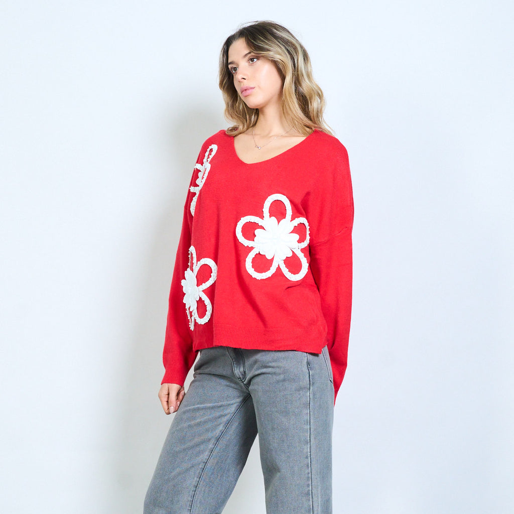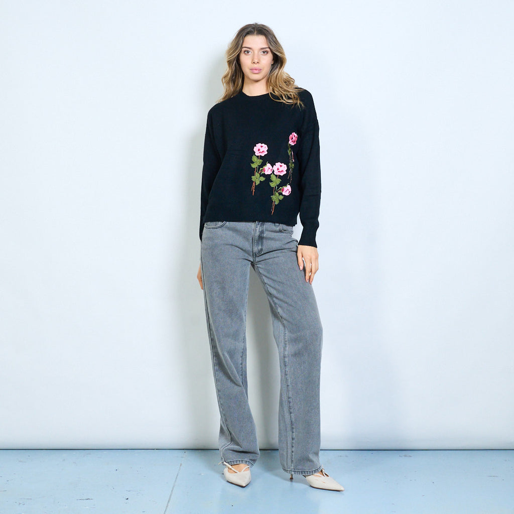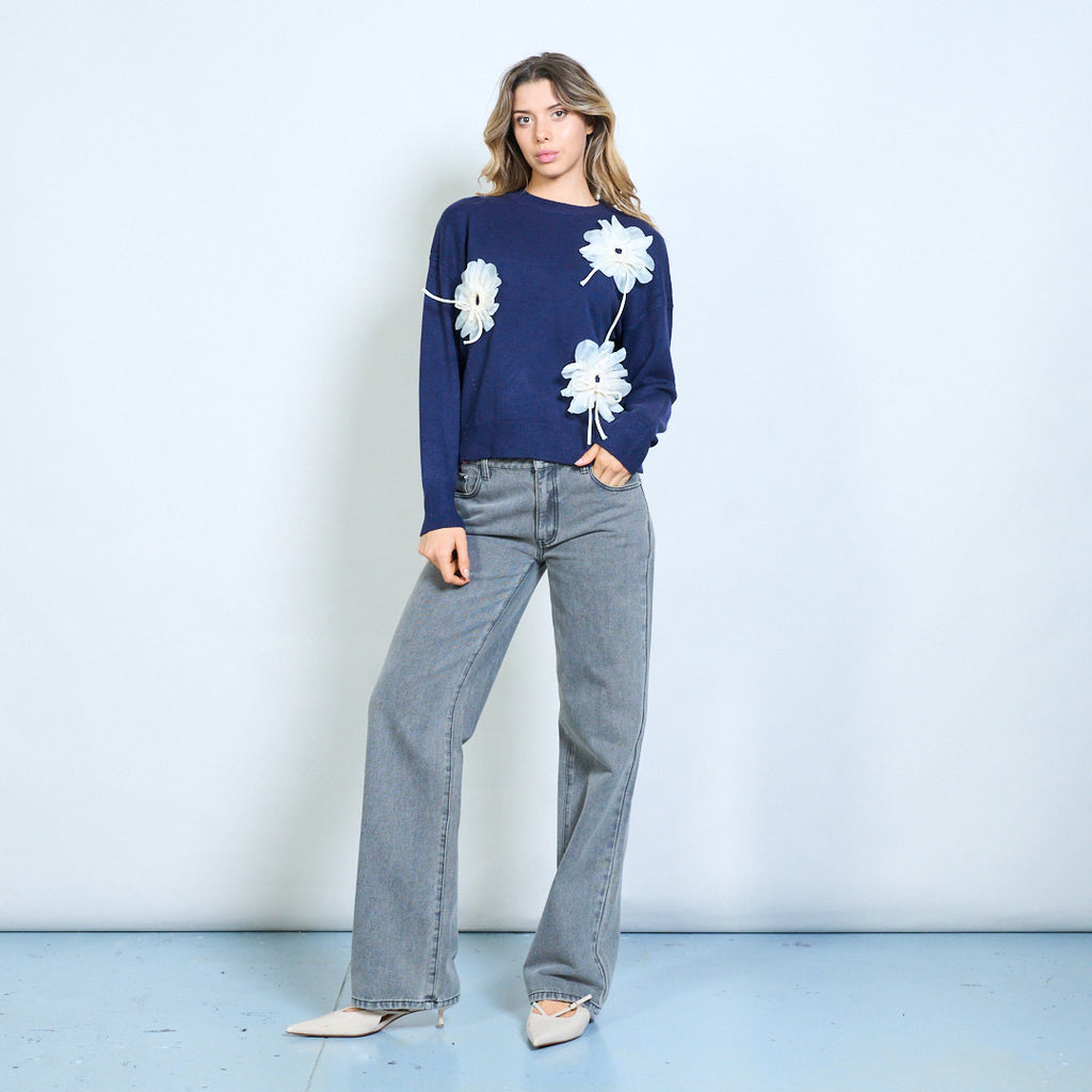 3D花卉贴花圆领针织毛衣批发