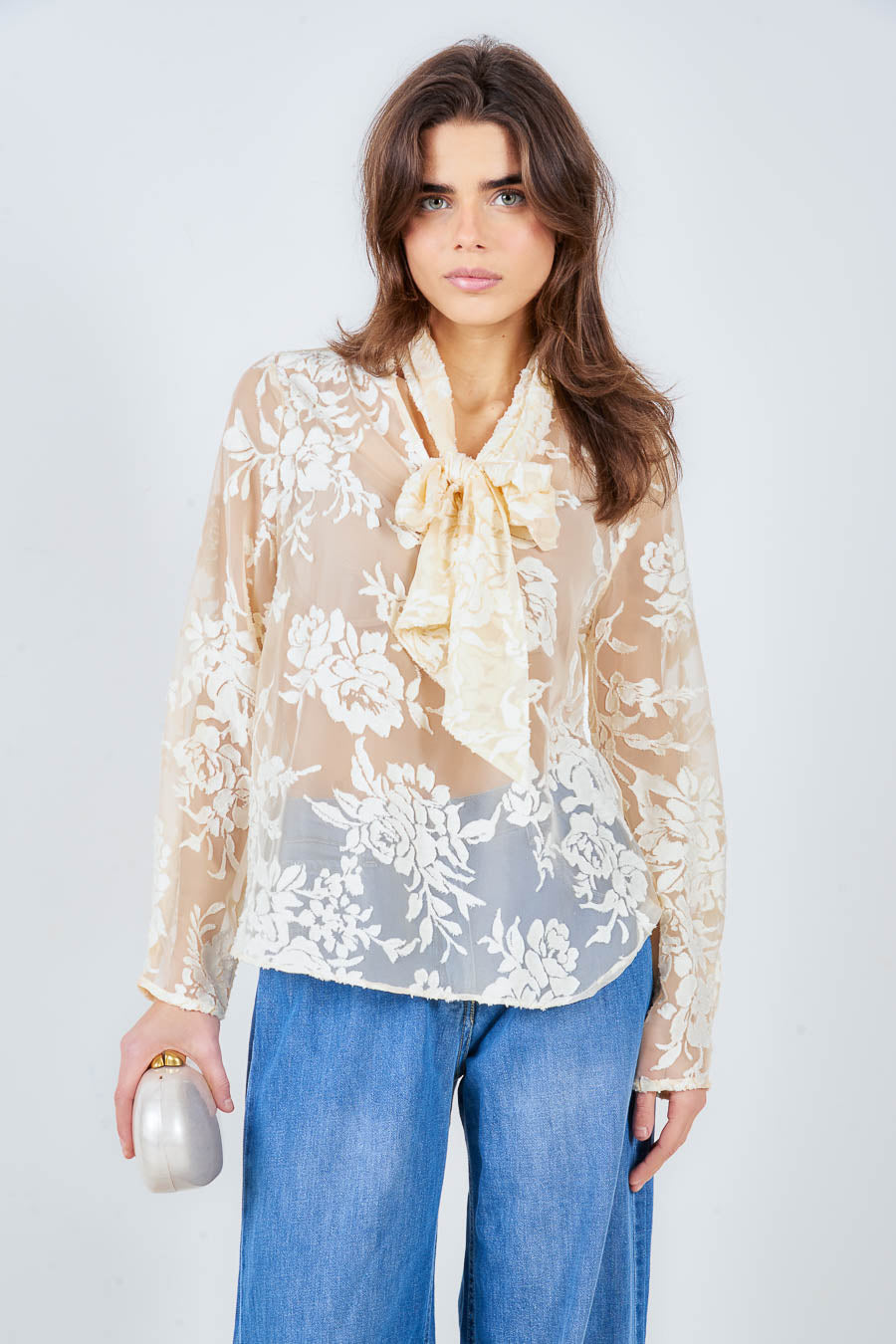 批发花卉烧花透明领结衬衫长袖