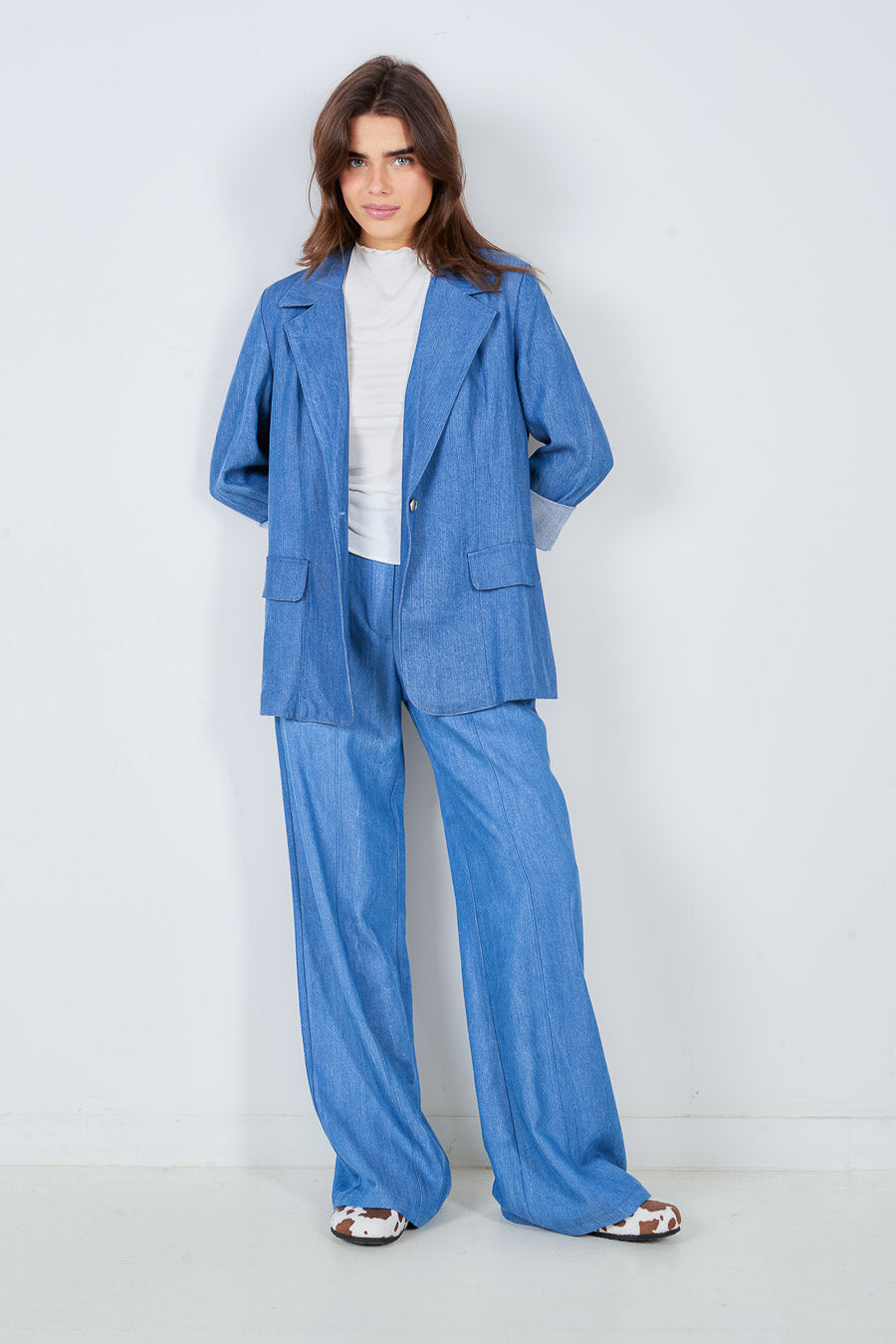 柔软牛仔定制西装外套,带盖口袋和单纽扣批发