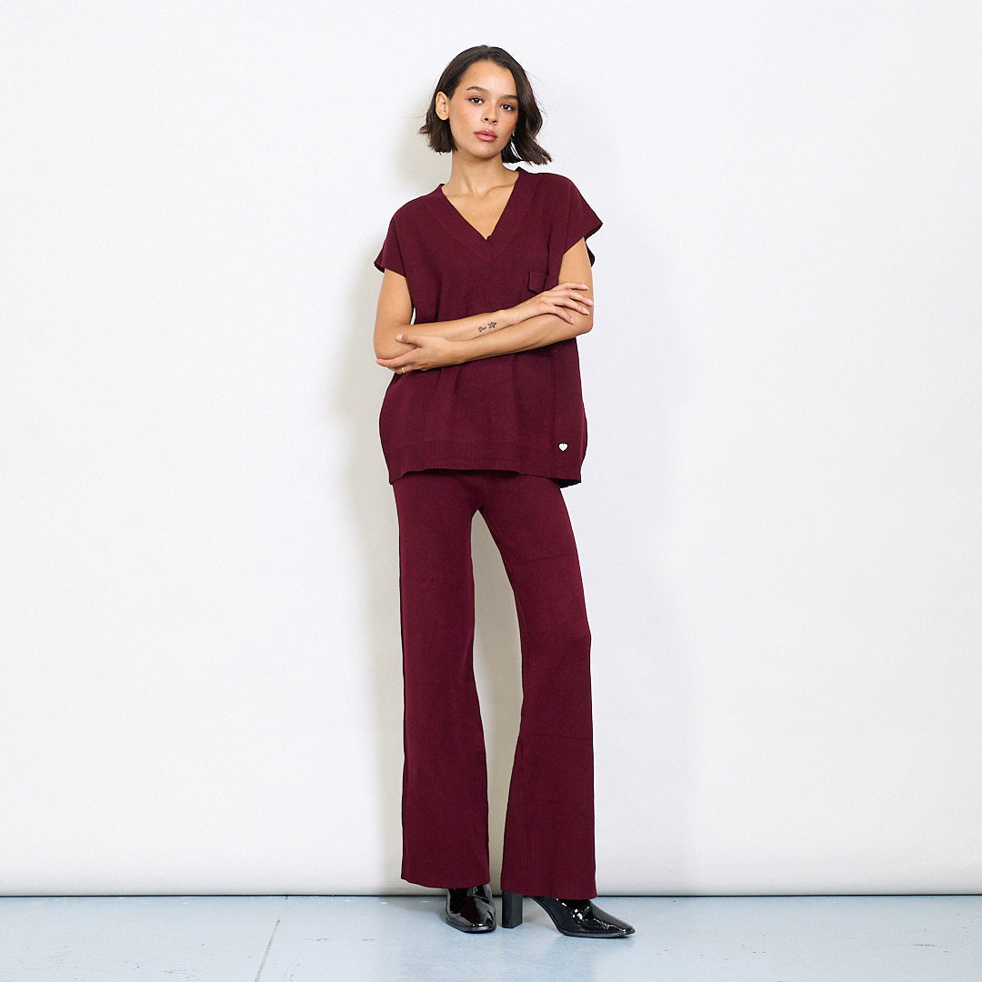 V领针织的无袖上衣和宽腿裤,套装带有口袋和金属心脏标签批发