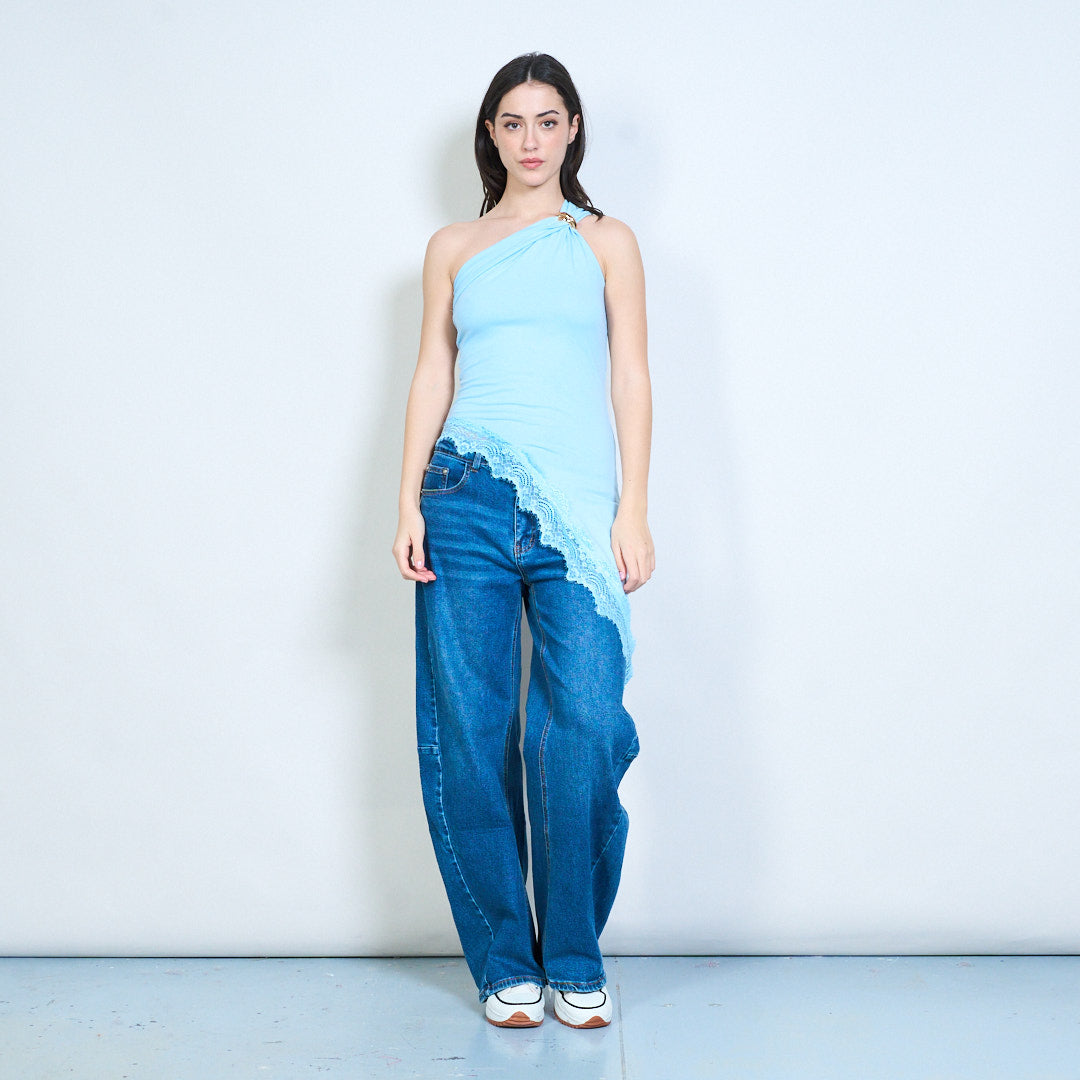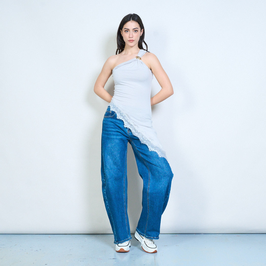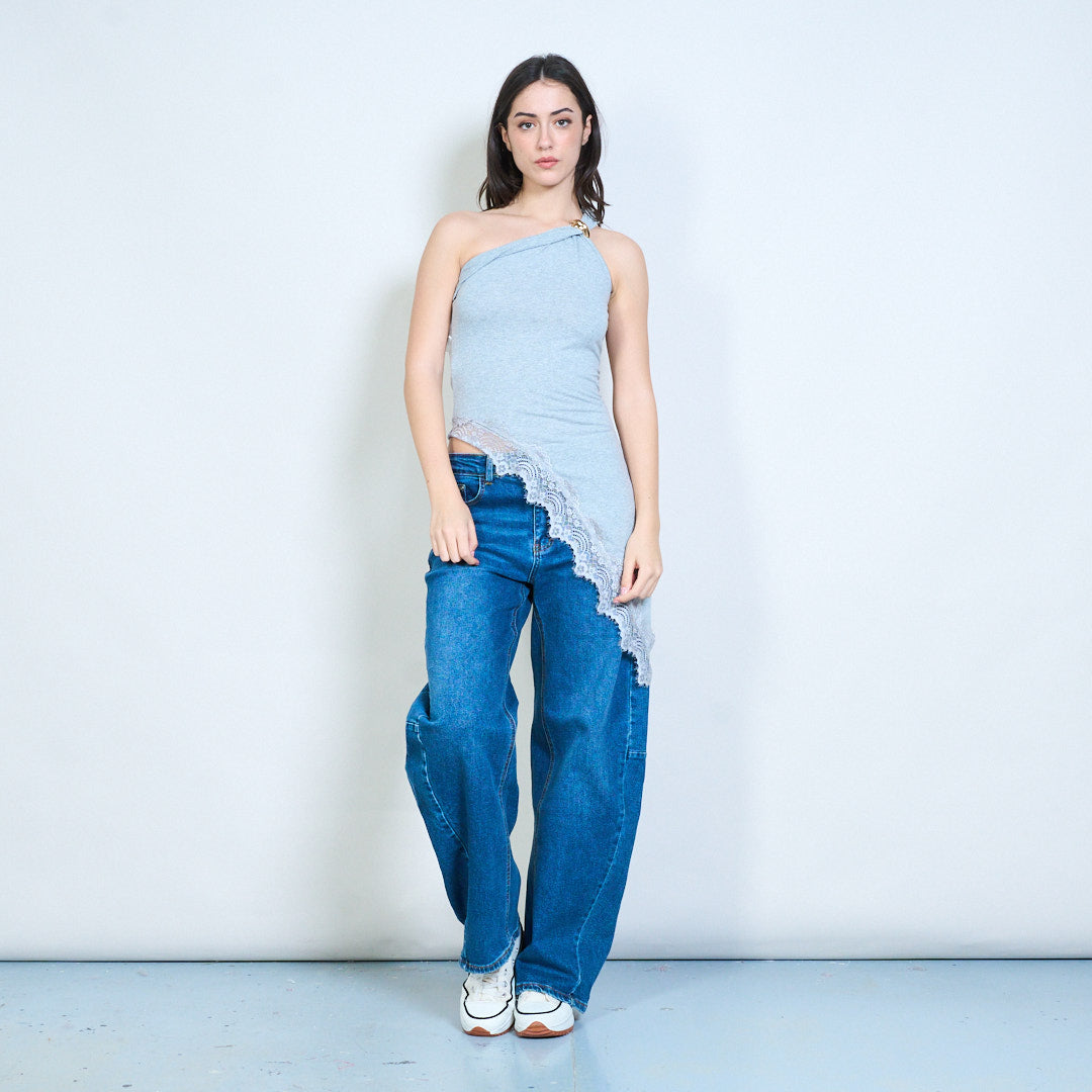 一肩不对称蕾丝边合身上衣批发