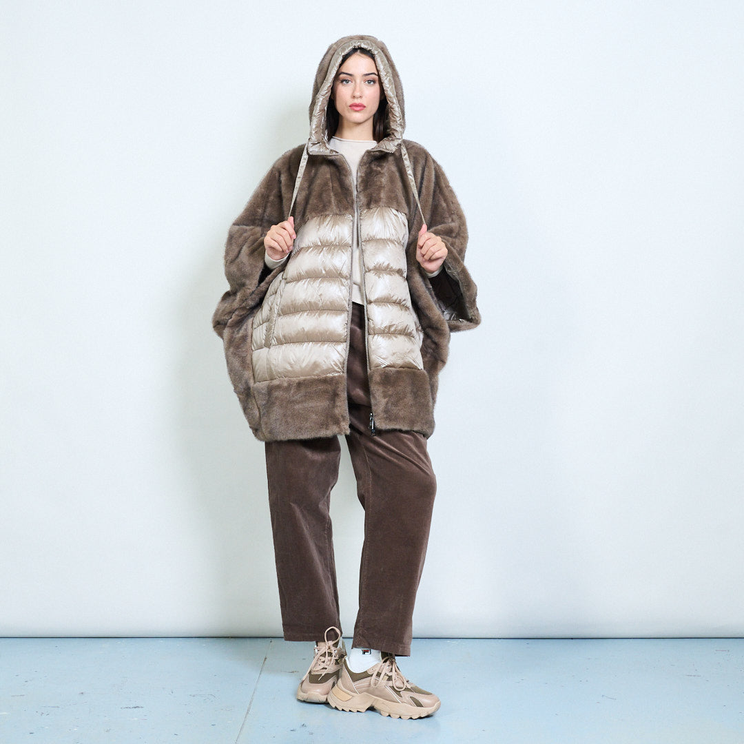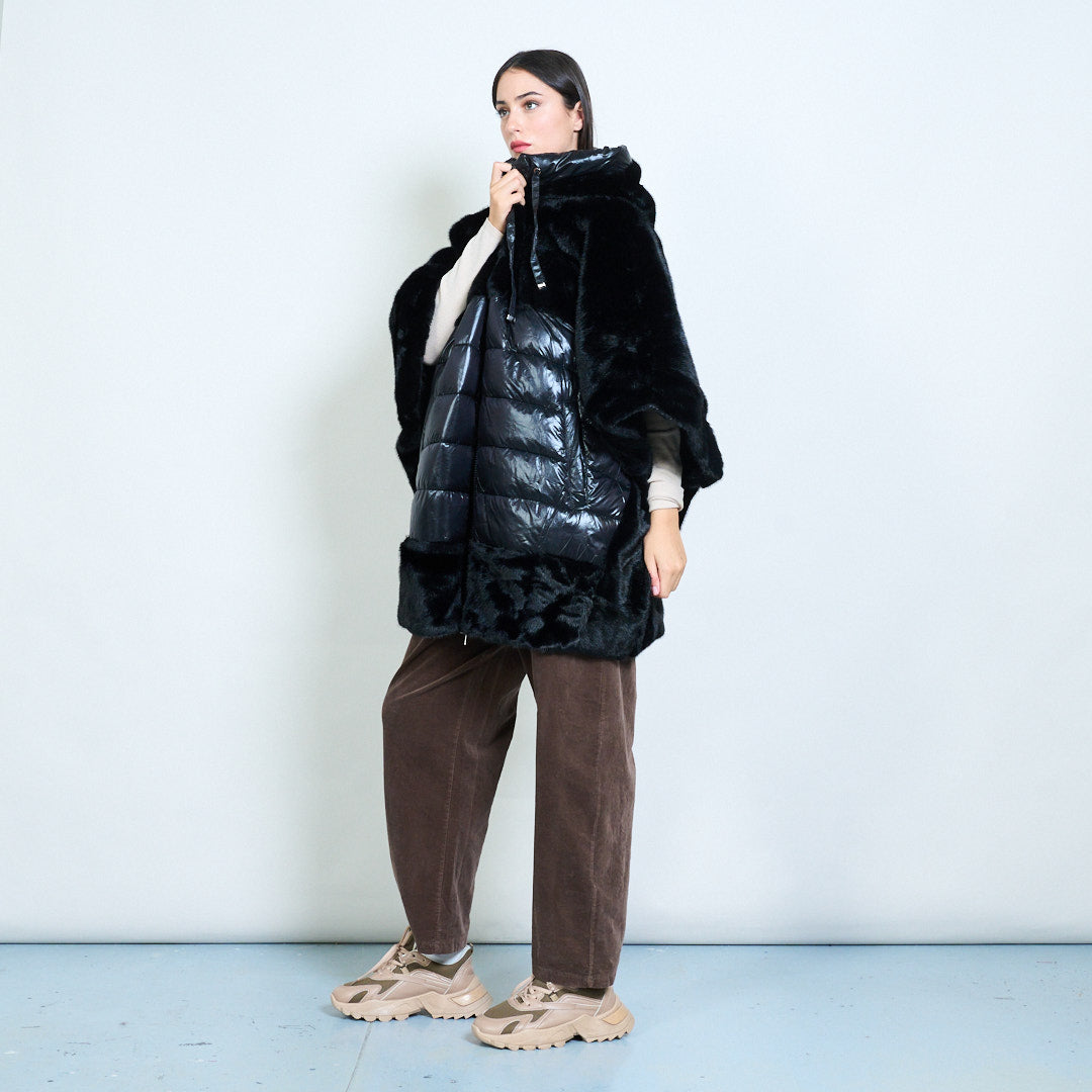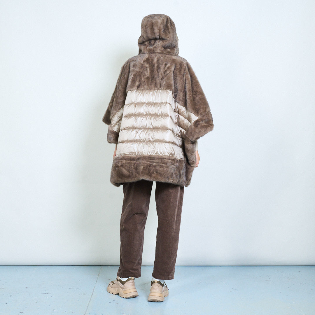 人造毛皮绗缝拼接连帽斗篷大衣批发