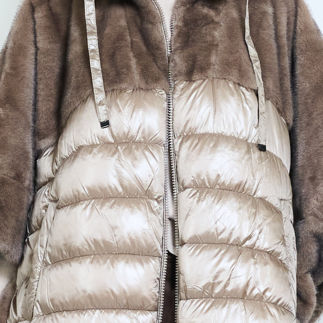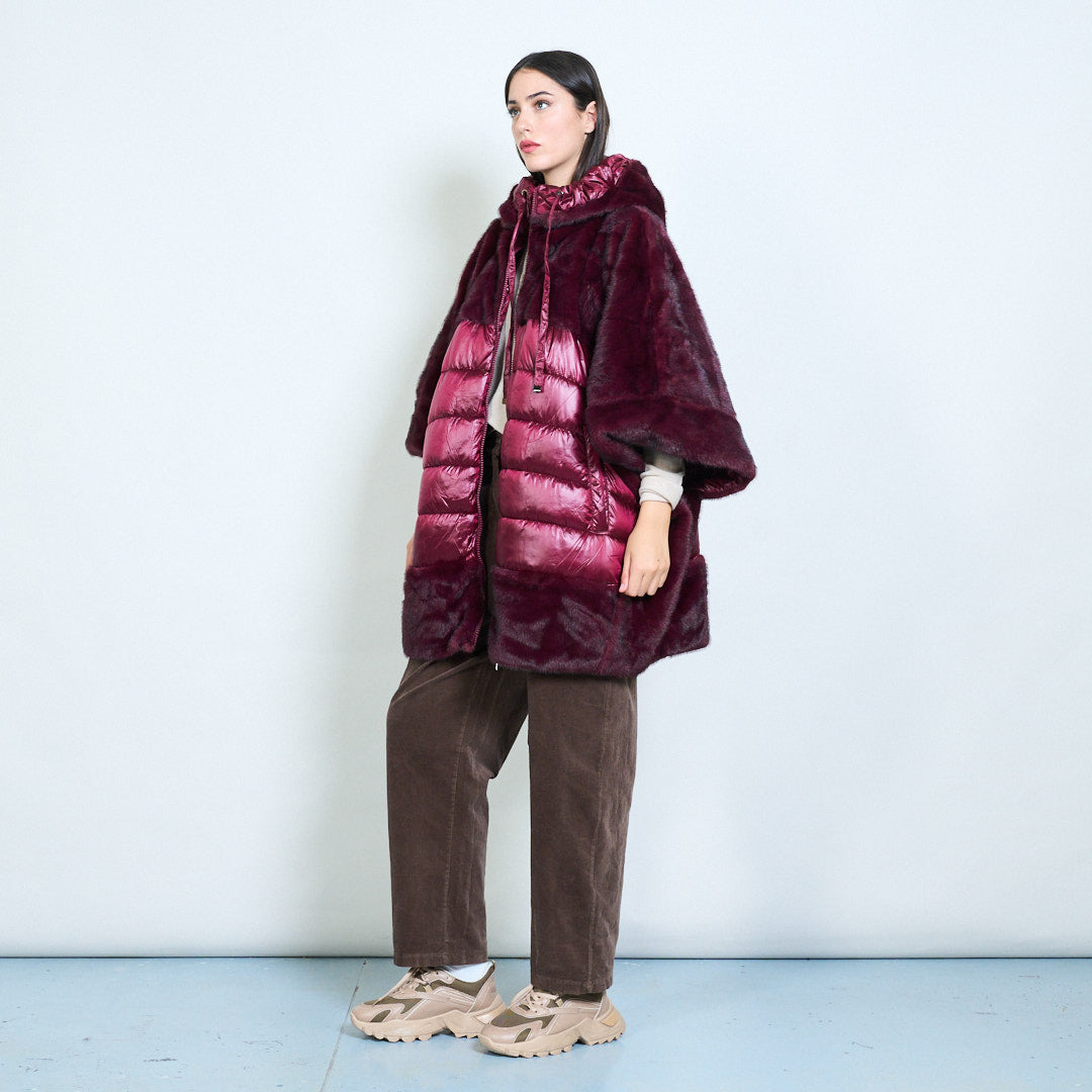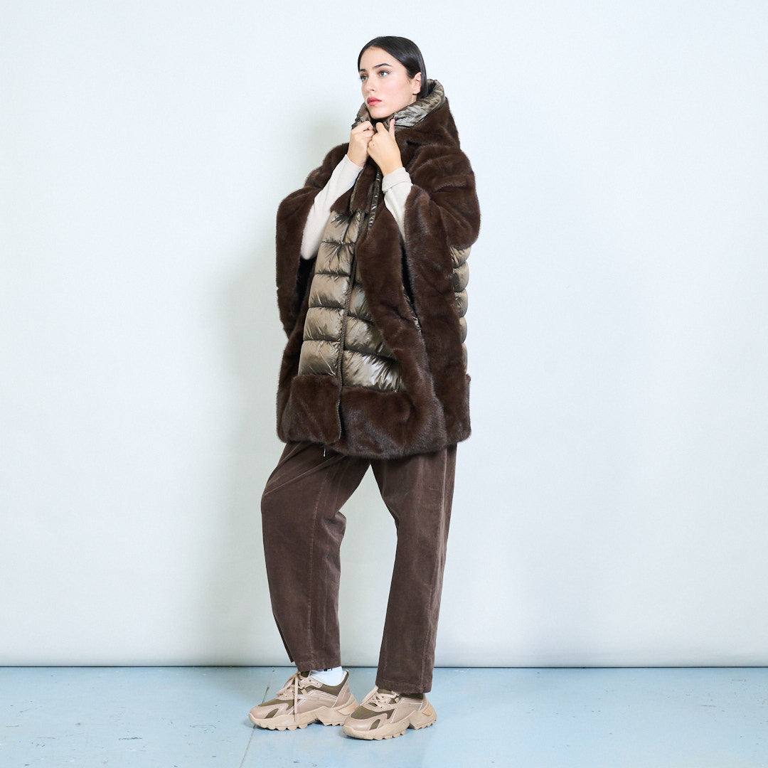 人造毛皮绗缝拼接连帽斗篷大衣批发