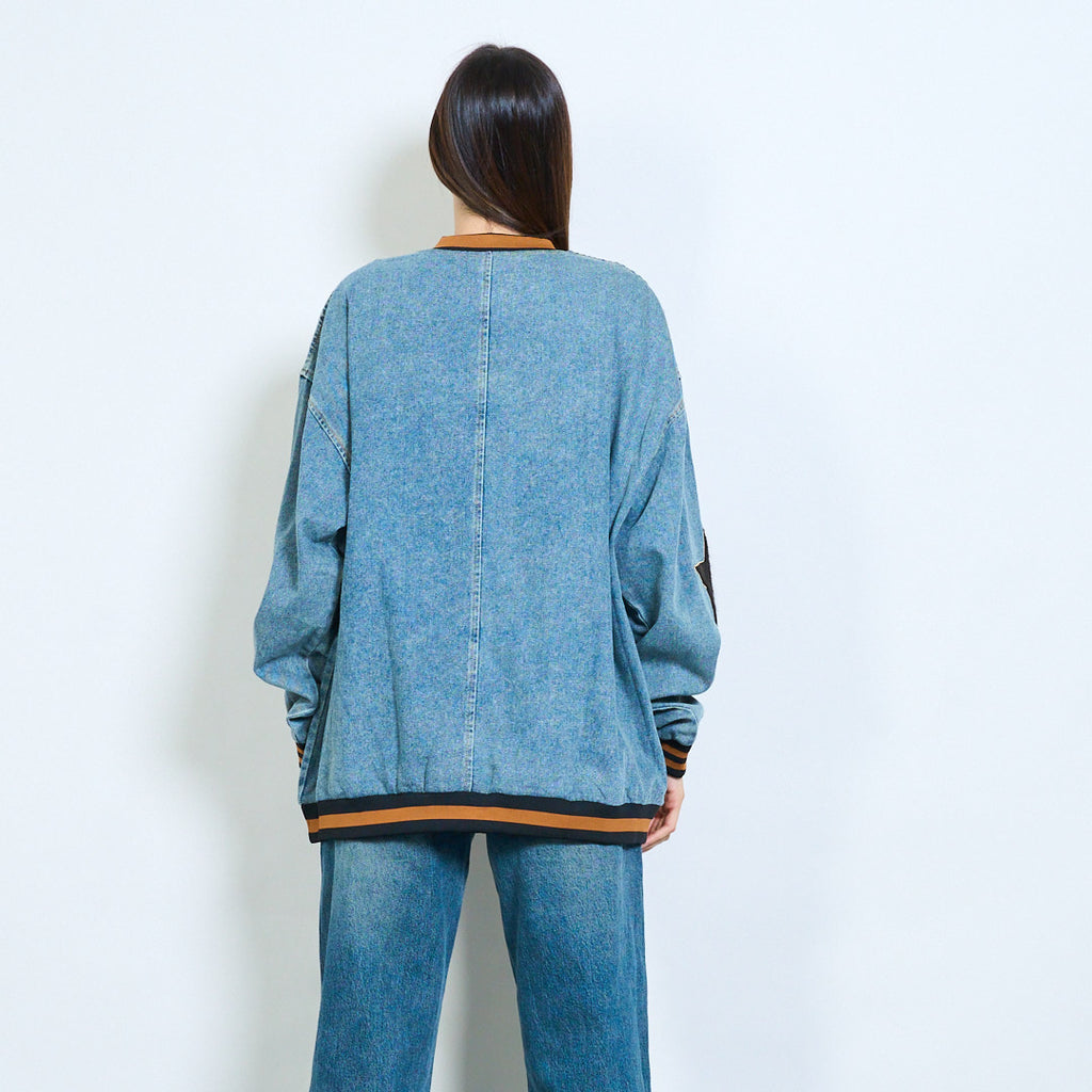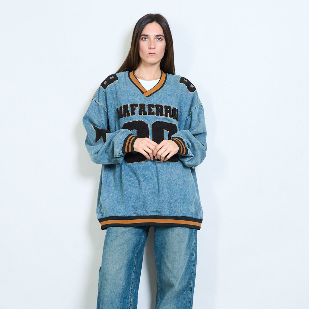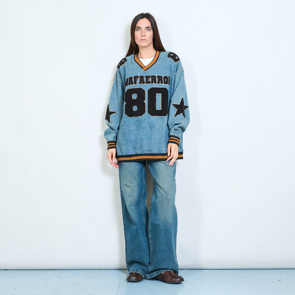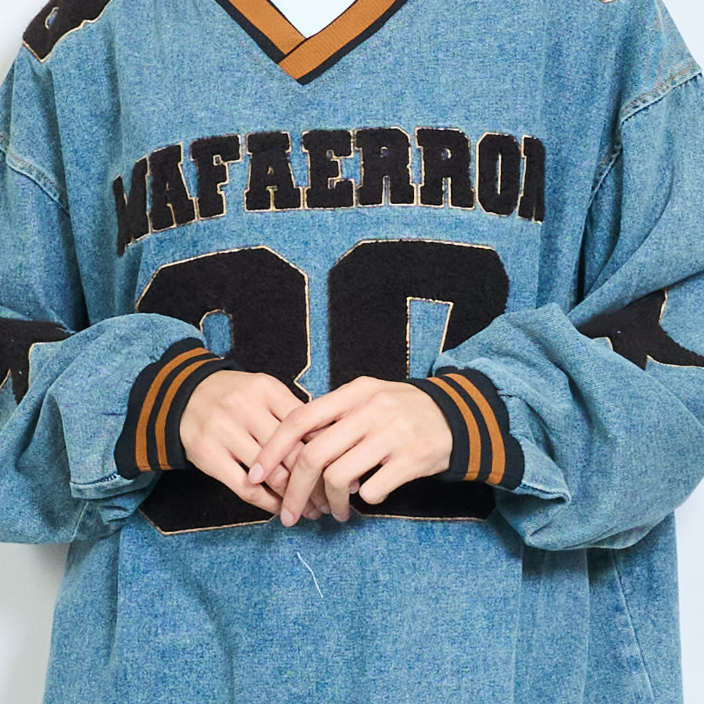 - 前面和袖子上有多个大胆的图形和文本补丁