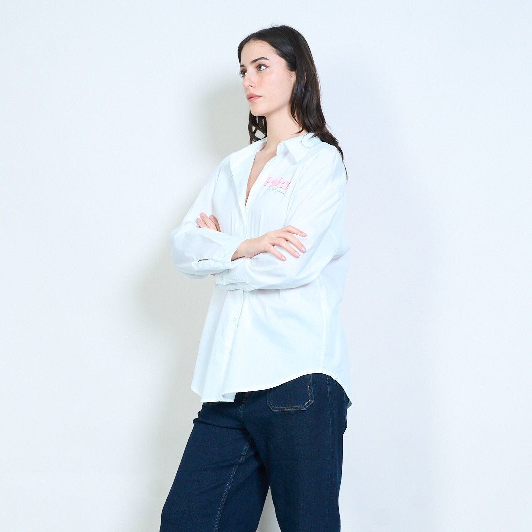 巴黎 je t’aime 标语印花宽松系扣衬衫批发