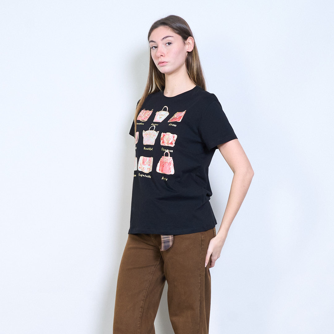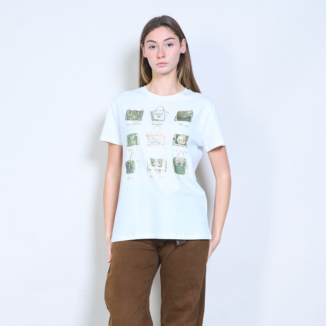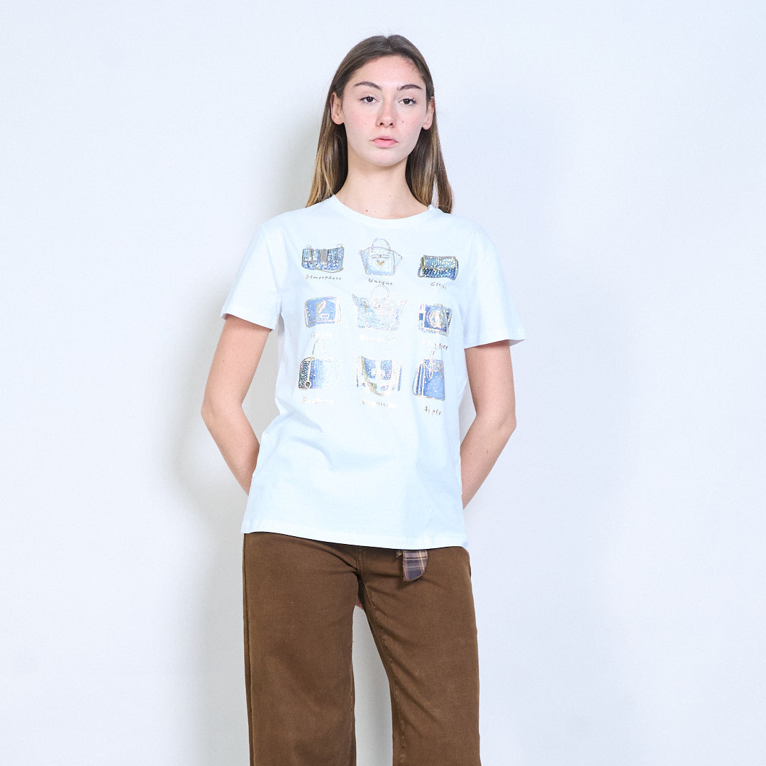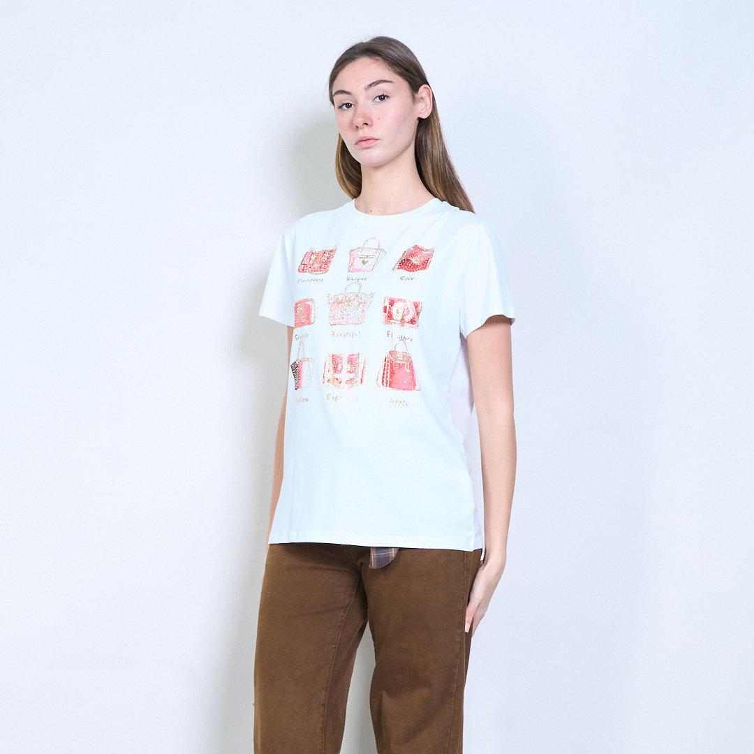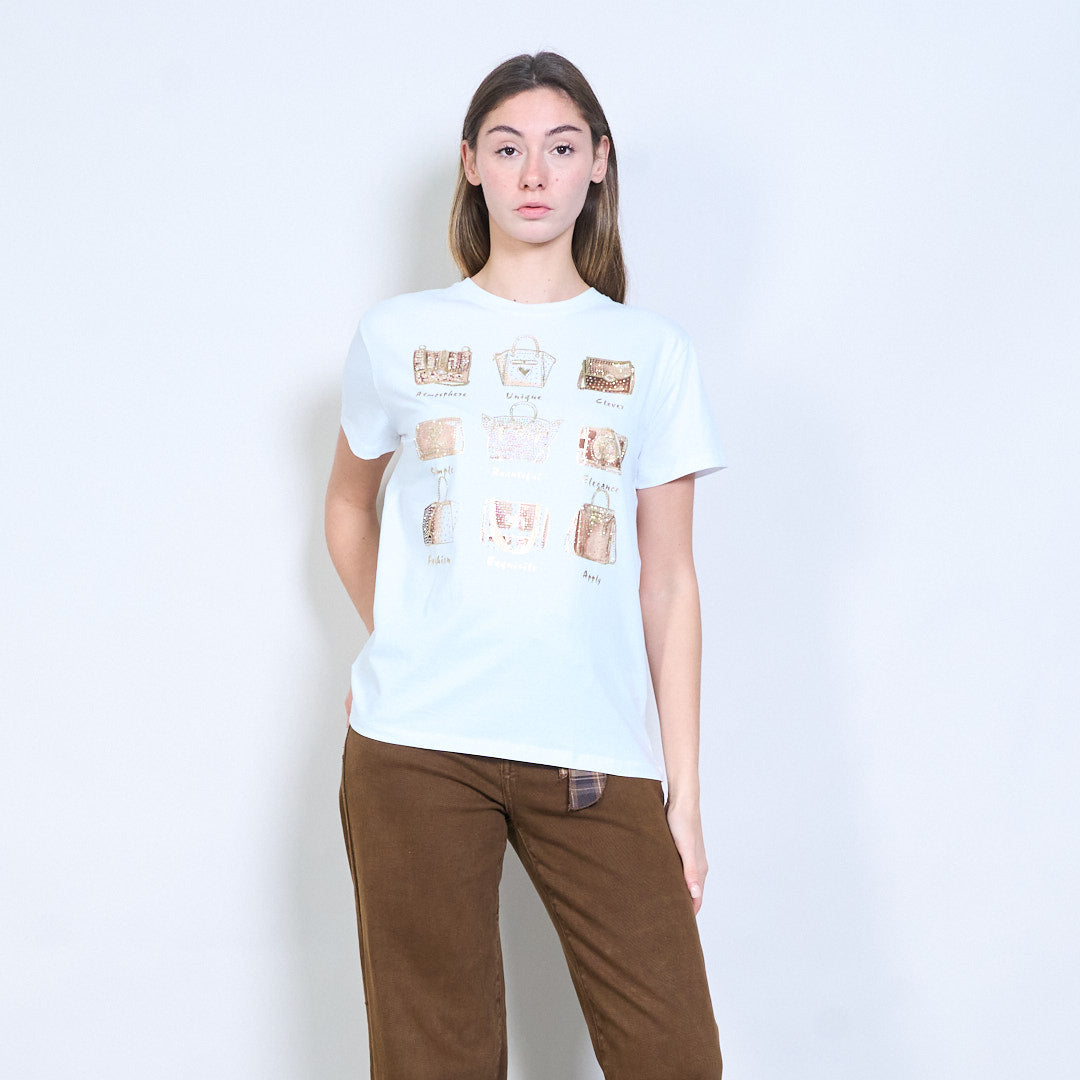 水钻和亮片装饰手提包图案印花短袖T恤批发