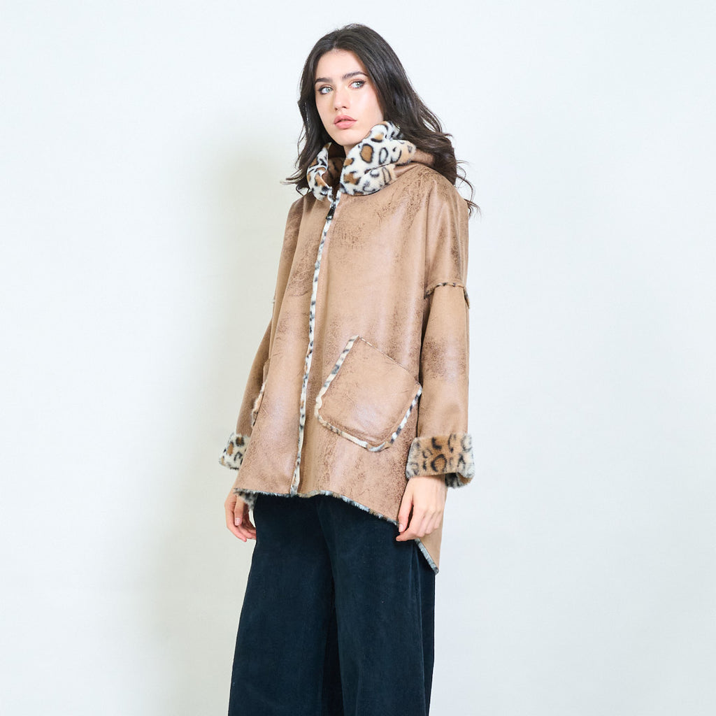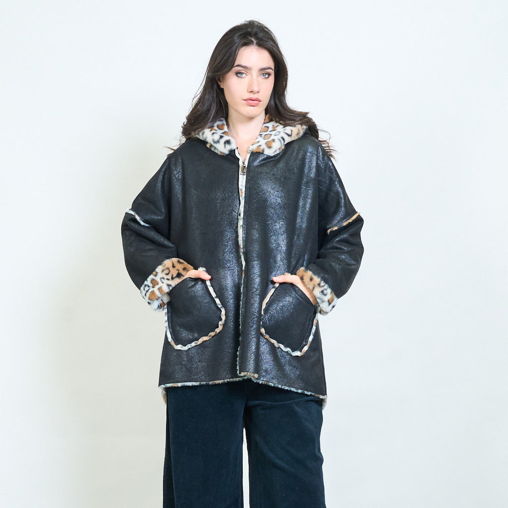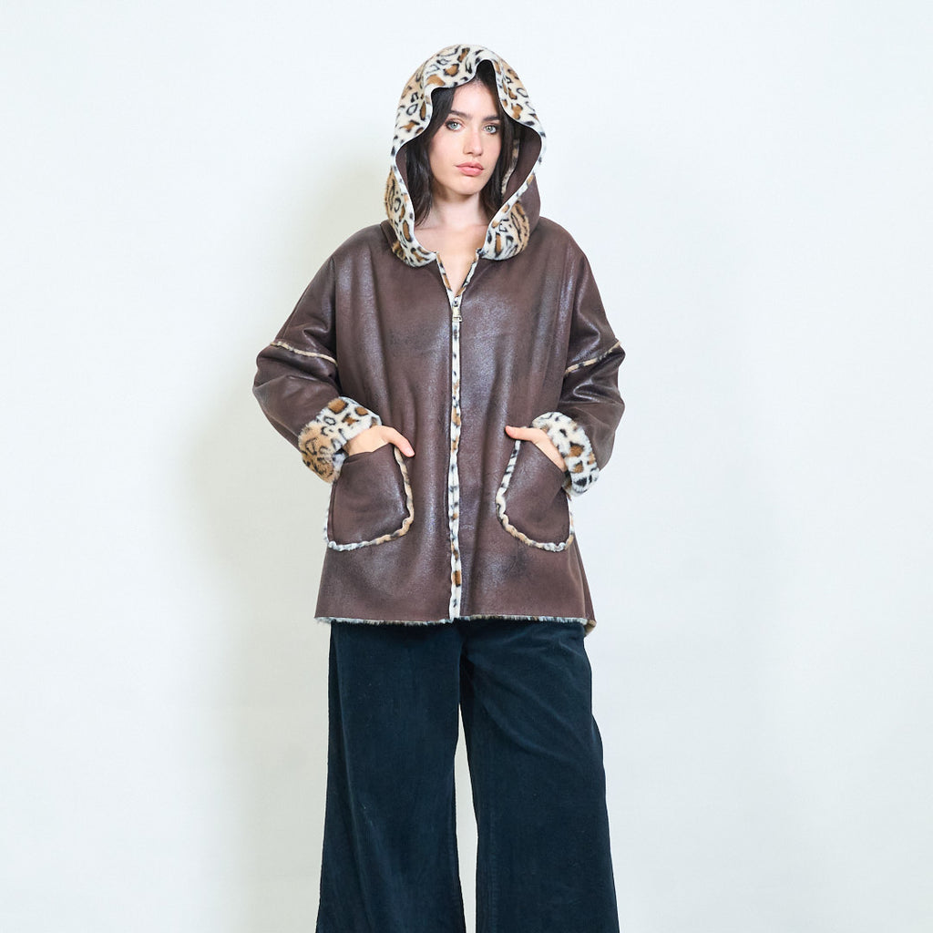 • 舒适的连帽设计,大胆的豹纹衬里和装饰