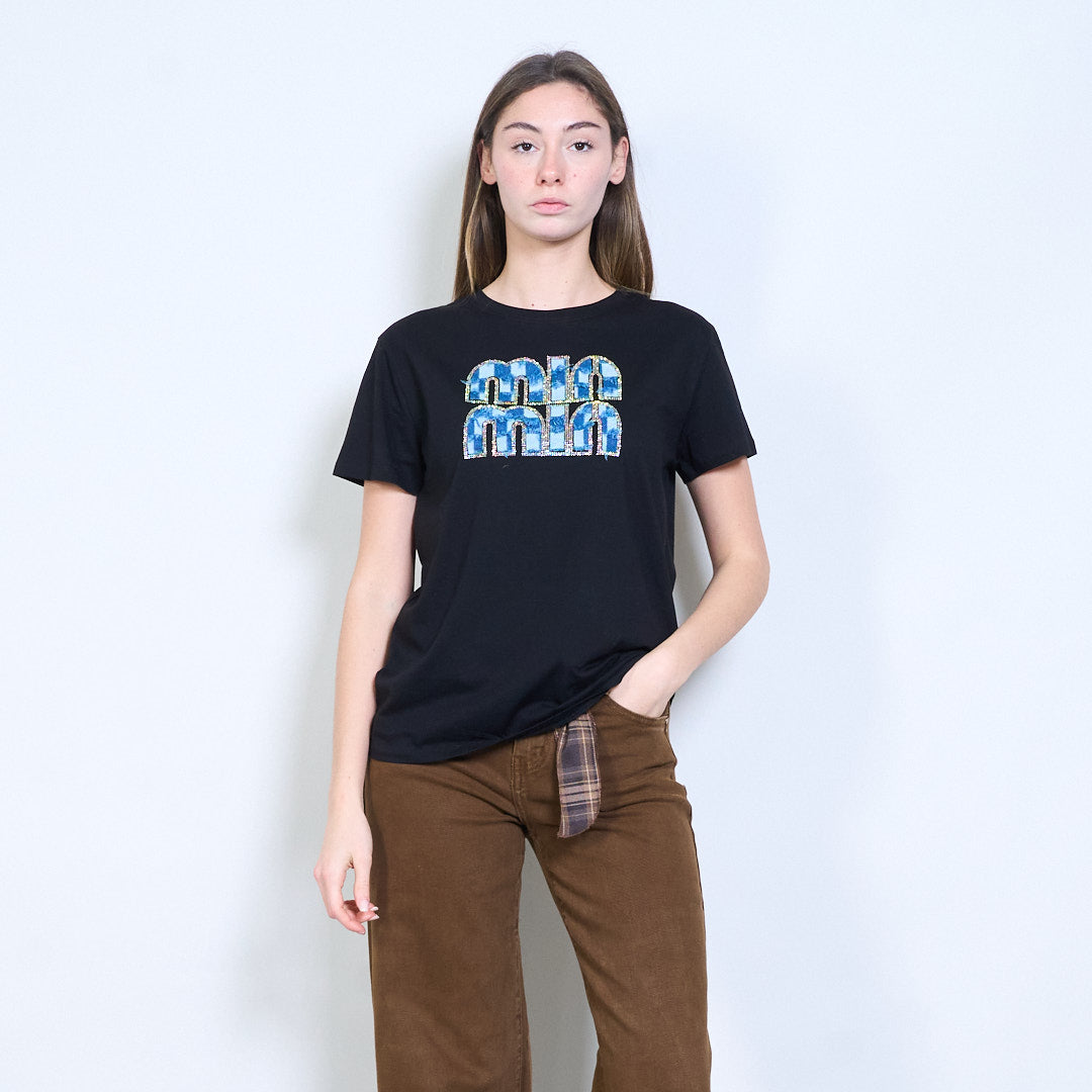 水钻“Mia mia”牛仔布贴片字母图案印花T恤批发