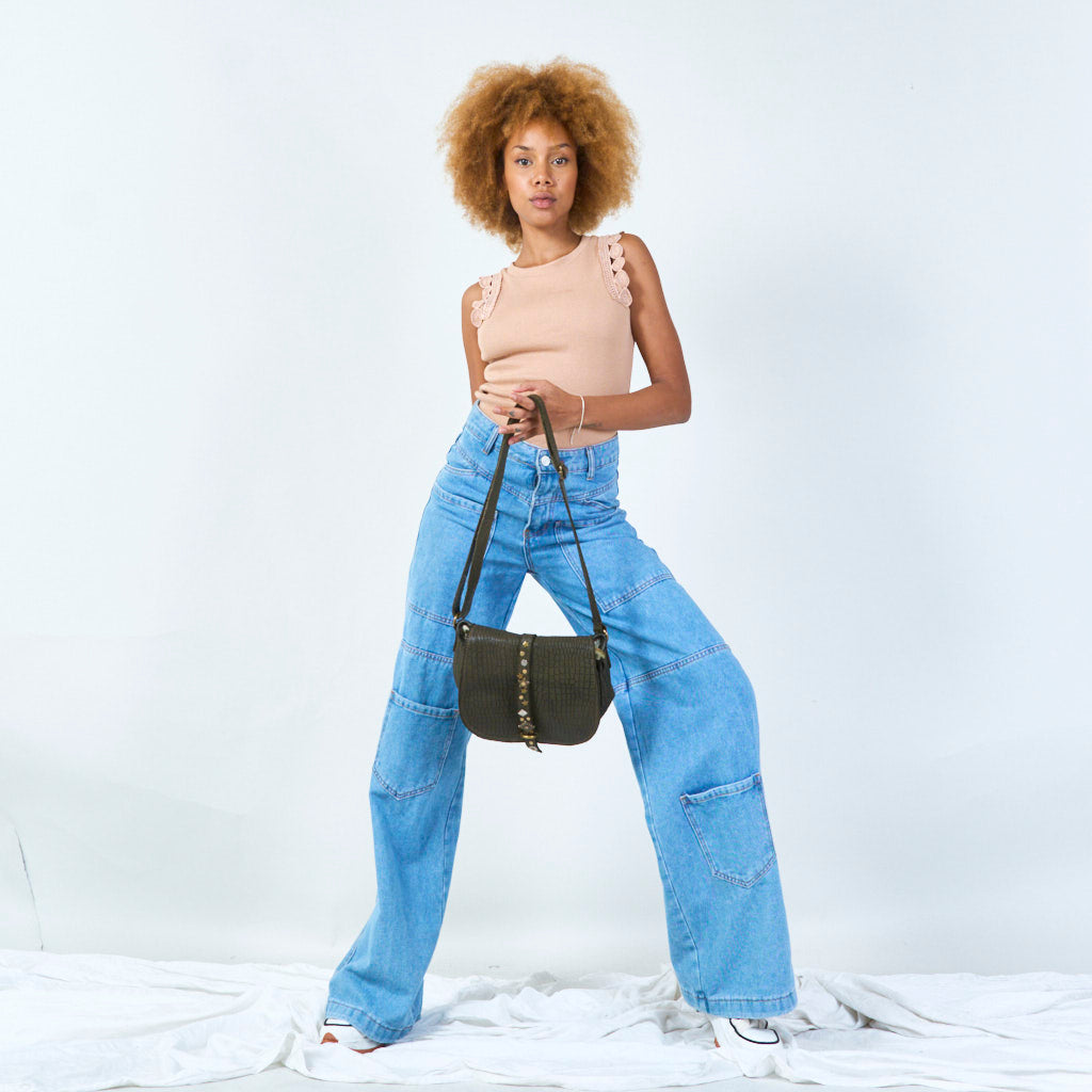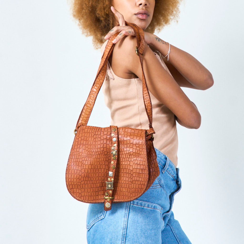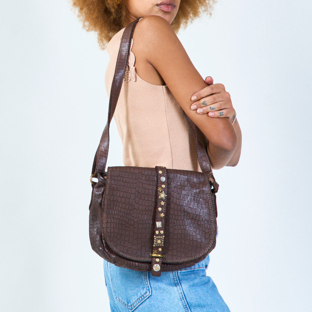 带饰有饰钉口音的压纹皮革斜纹袋批发