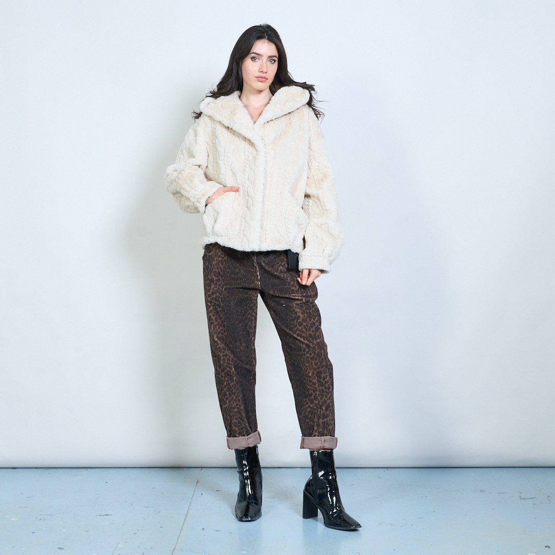 - 人造毛皮夹克具有独特的绞花针织纹理图案