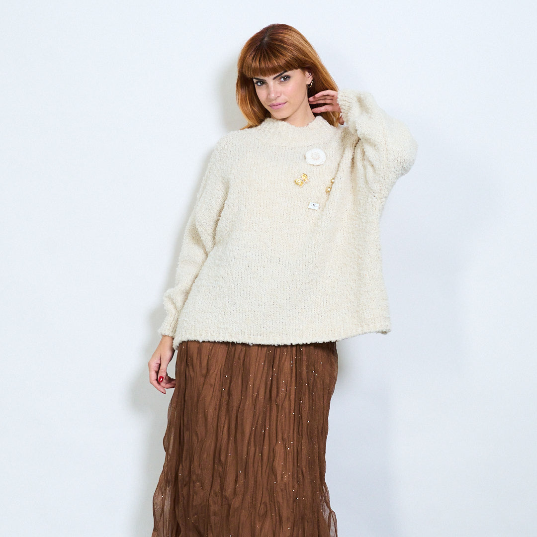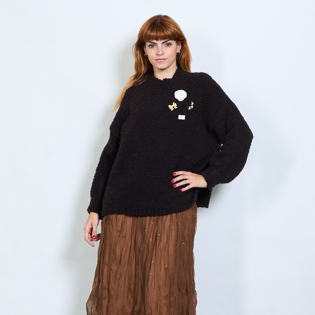 带有花卉和魅力胸针详细信息的纹理针织毛衣批发
