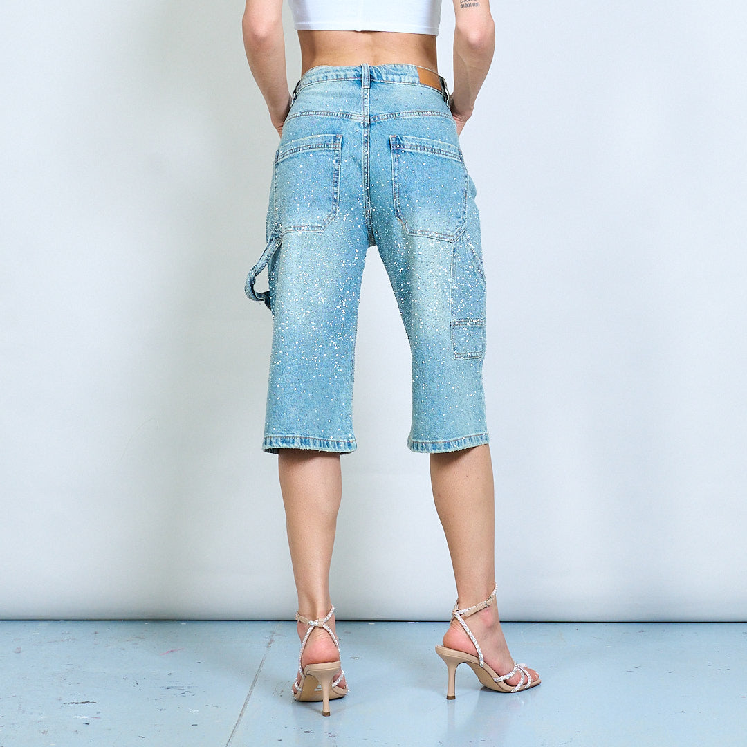 - 具有老式洗涤效果和散落的晶体点缀的牛仔短裤