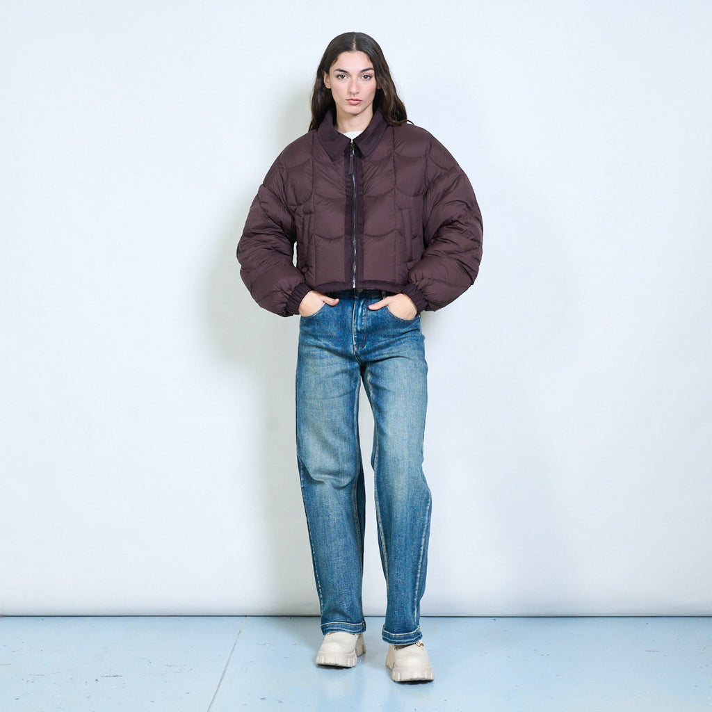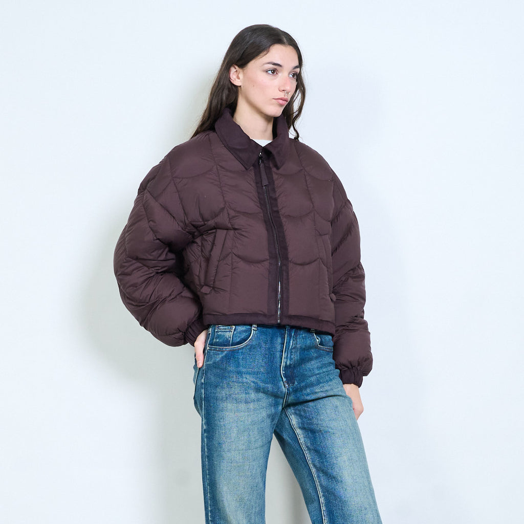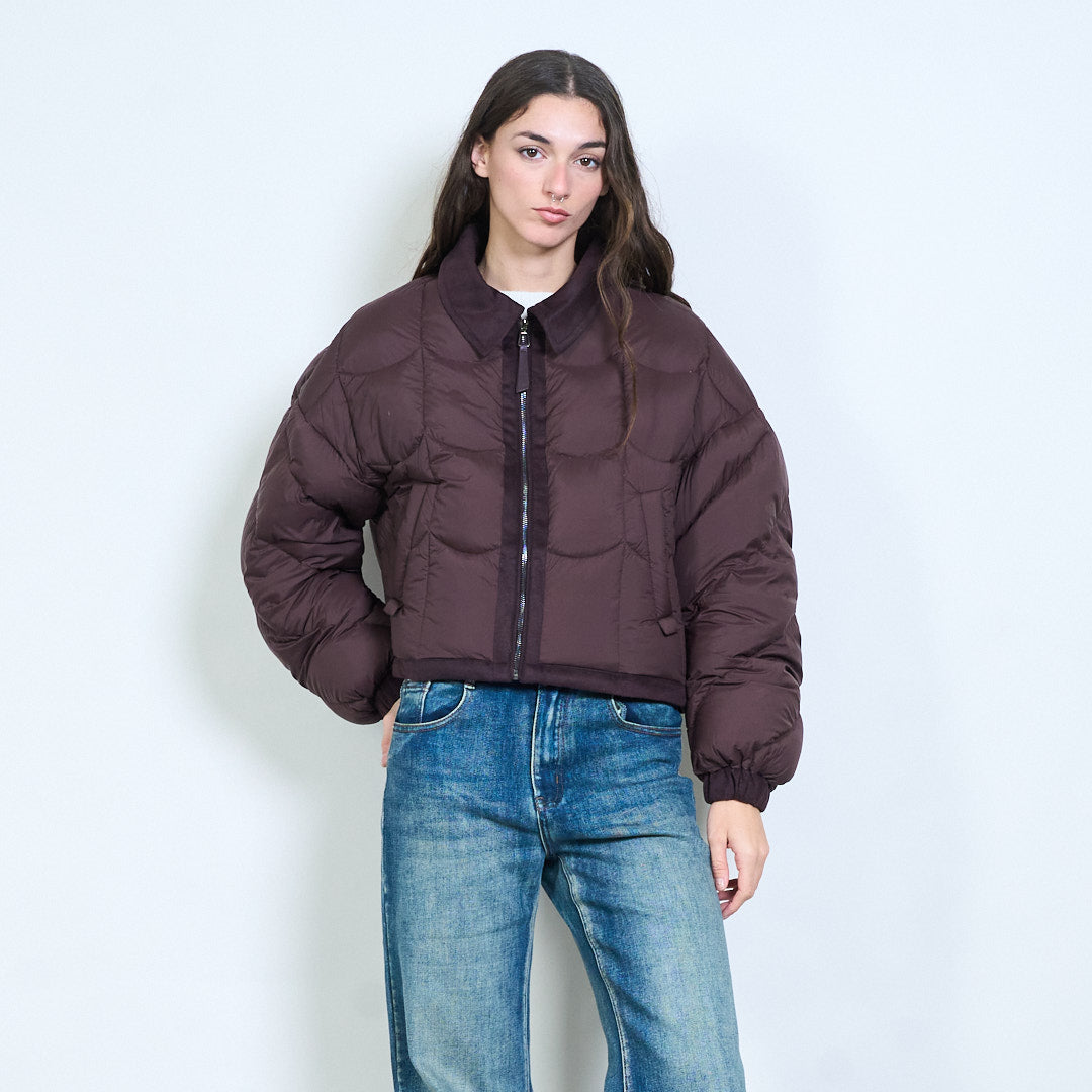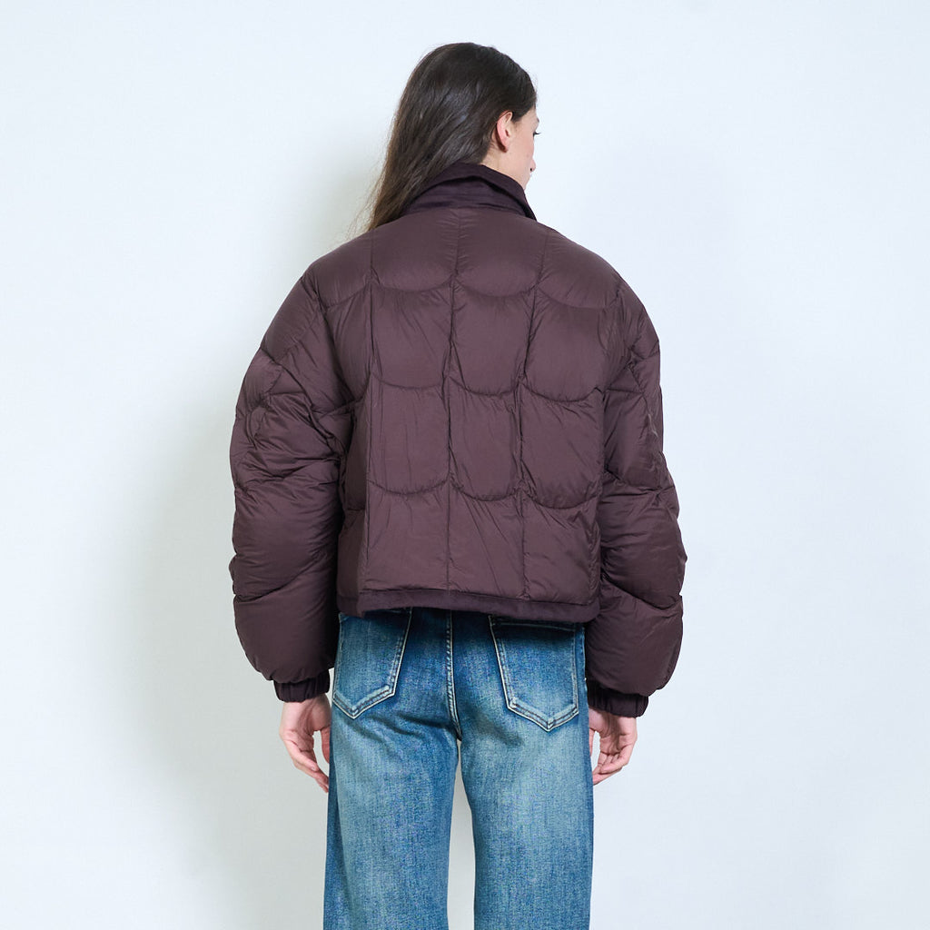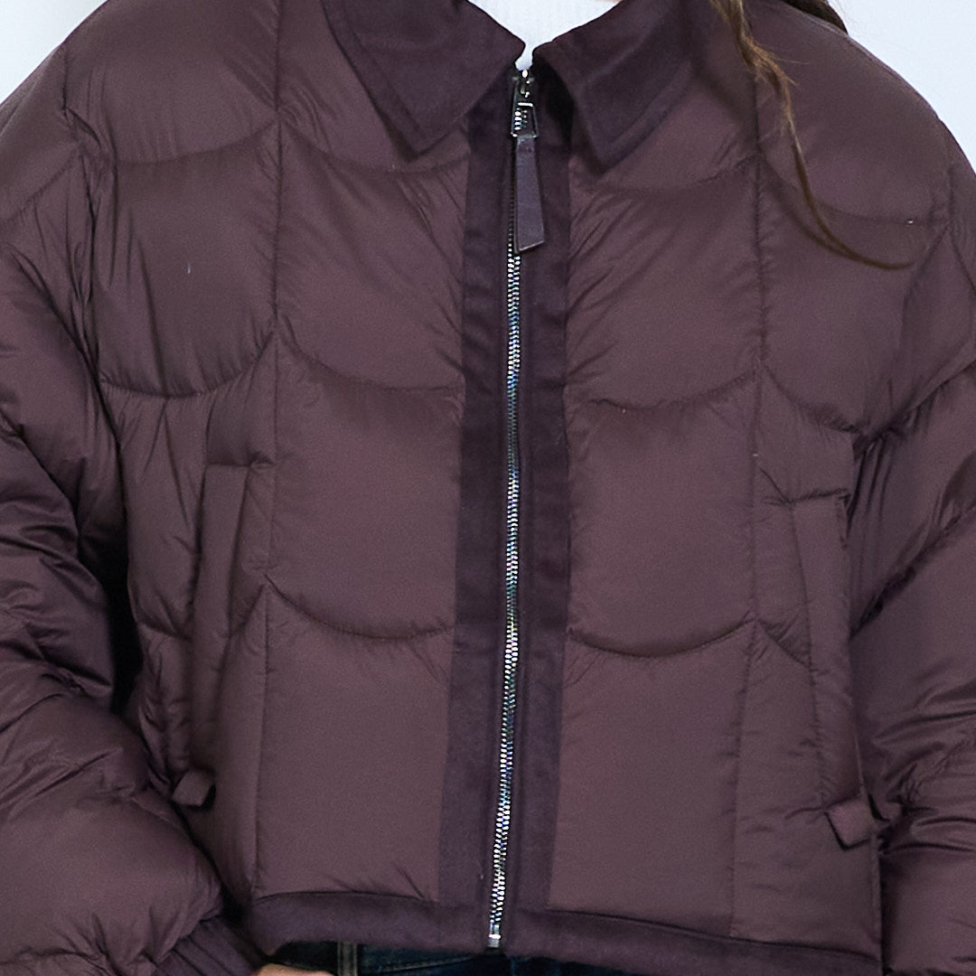 撞色领弧形拼接短款绗缝河豚羽绒服批发