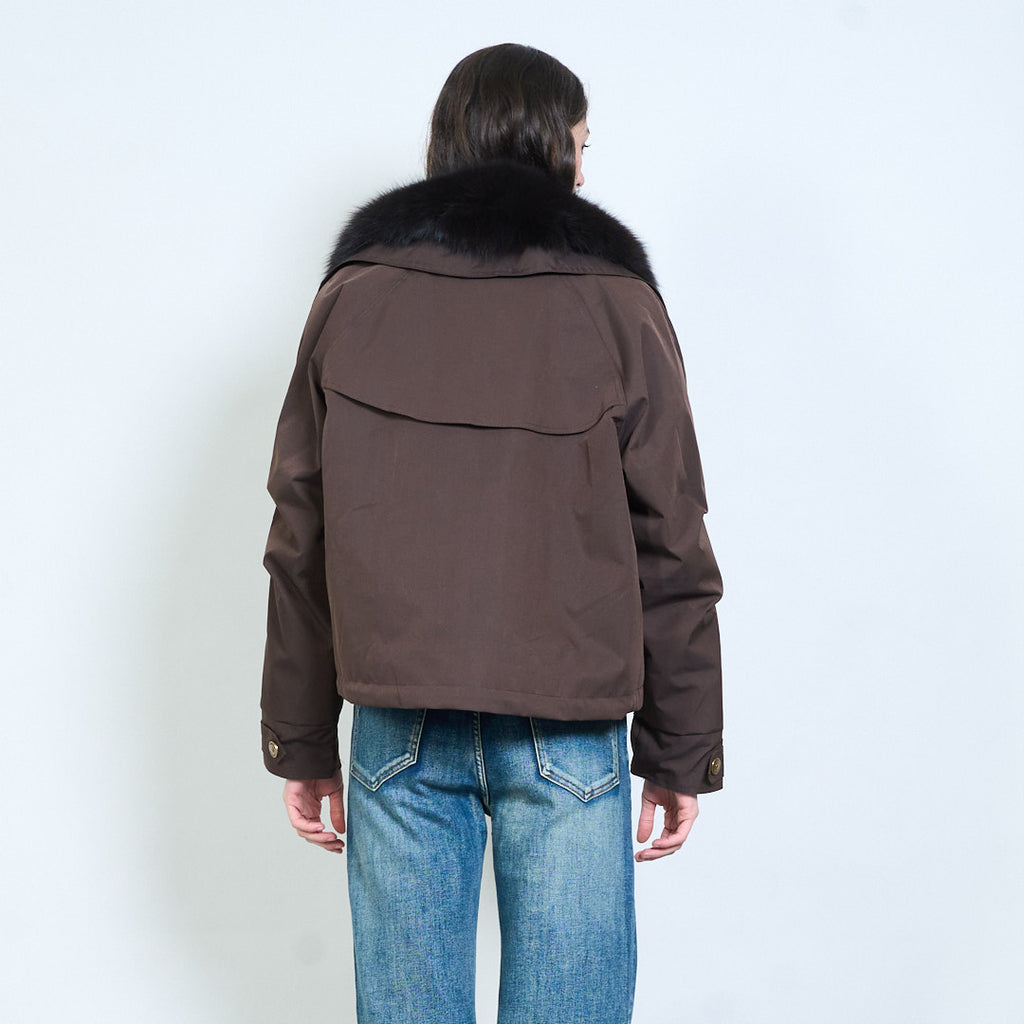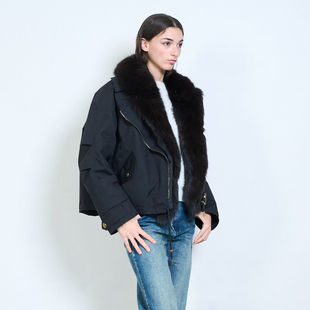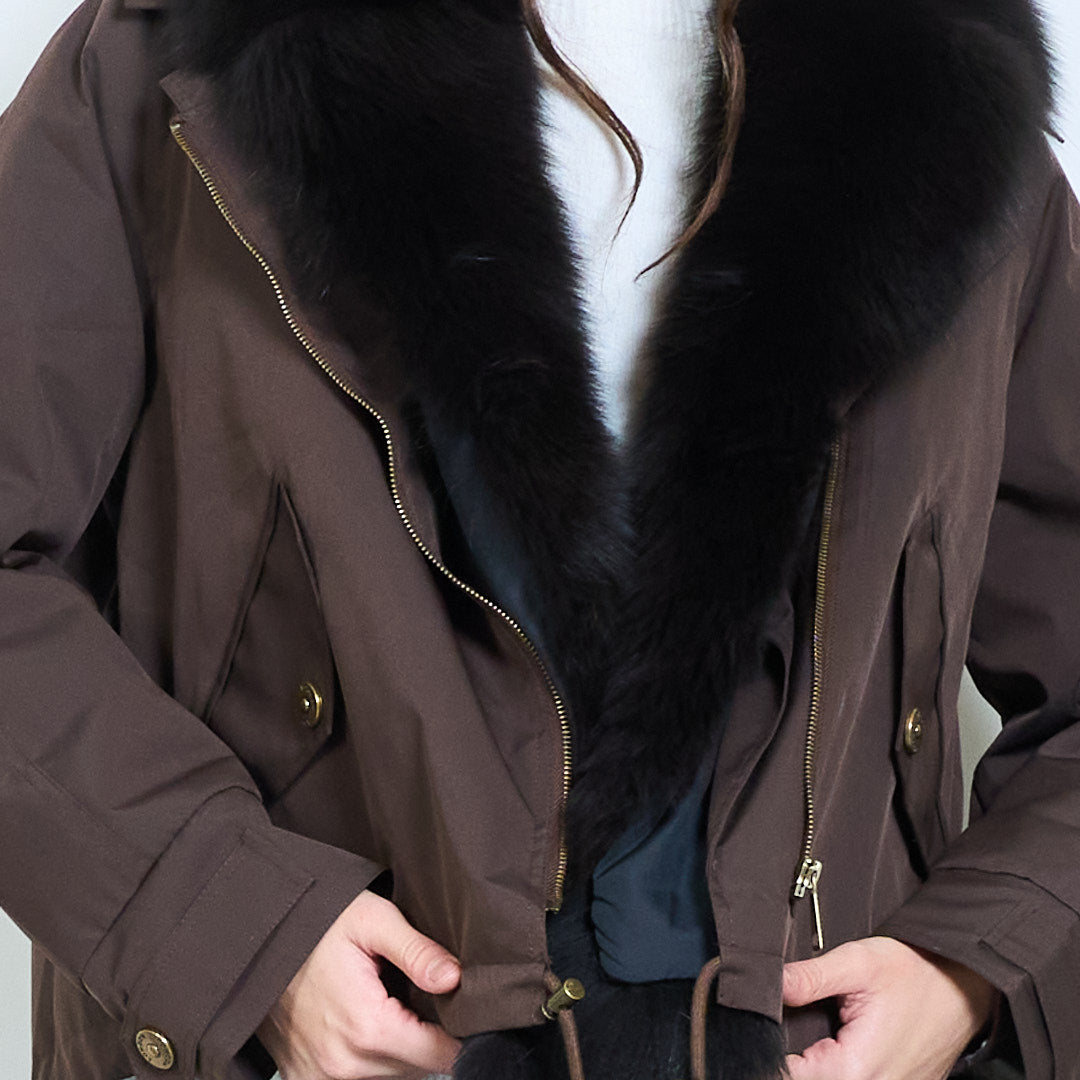 - 采用厚毛绒衣领设计,营造出大胆而奢华的冬季风格