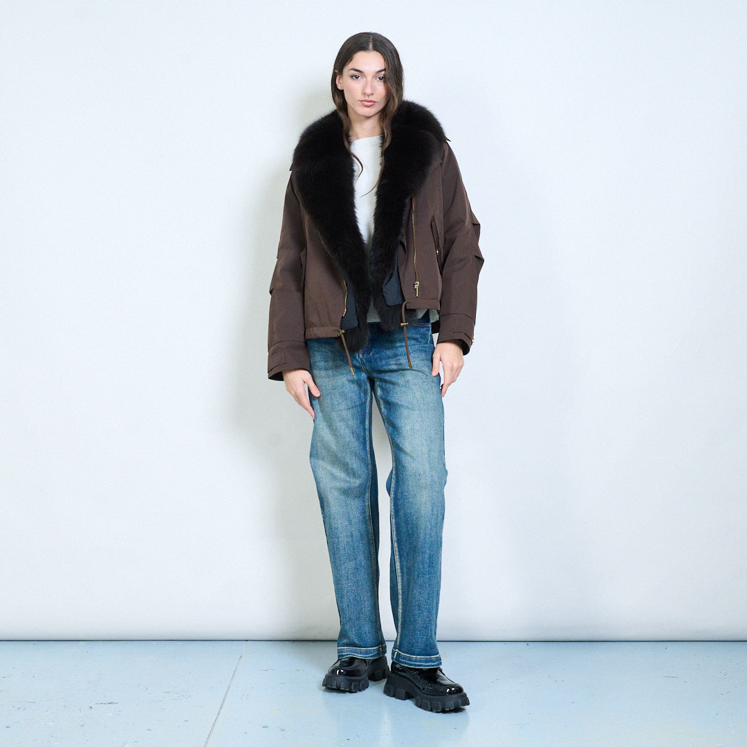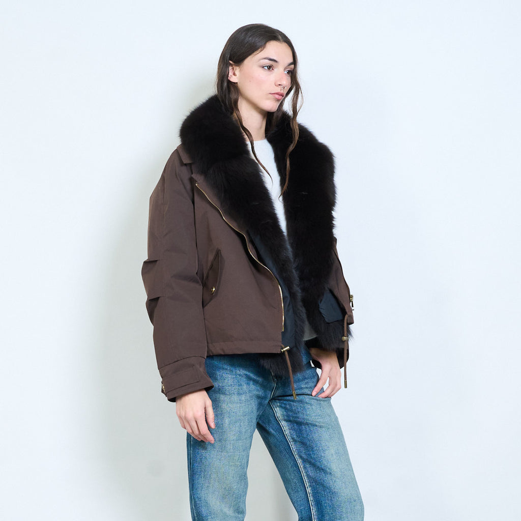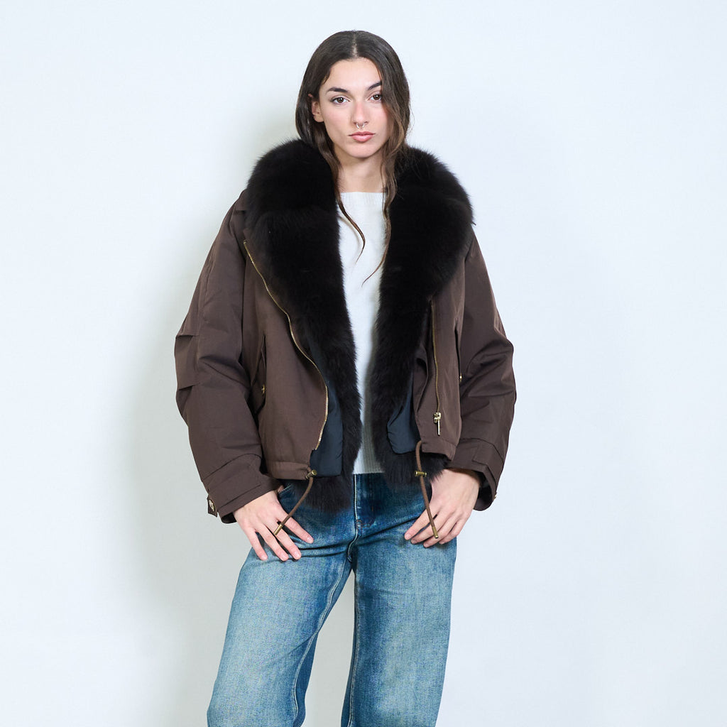 - 采用厚毛绒衣领设计,营造出大胆而奢华的冬季风格