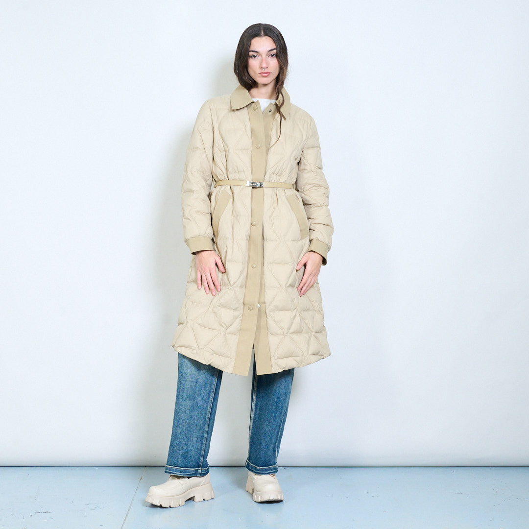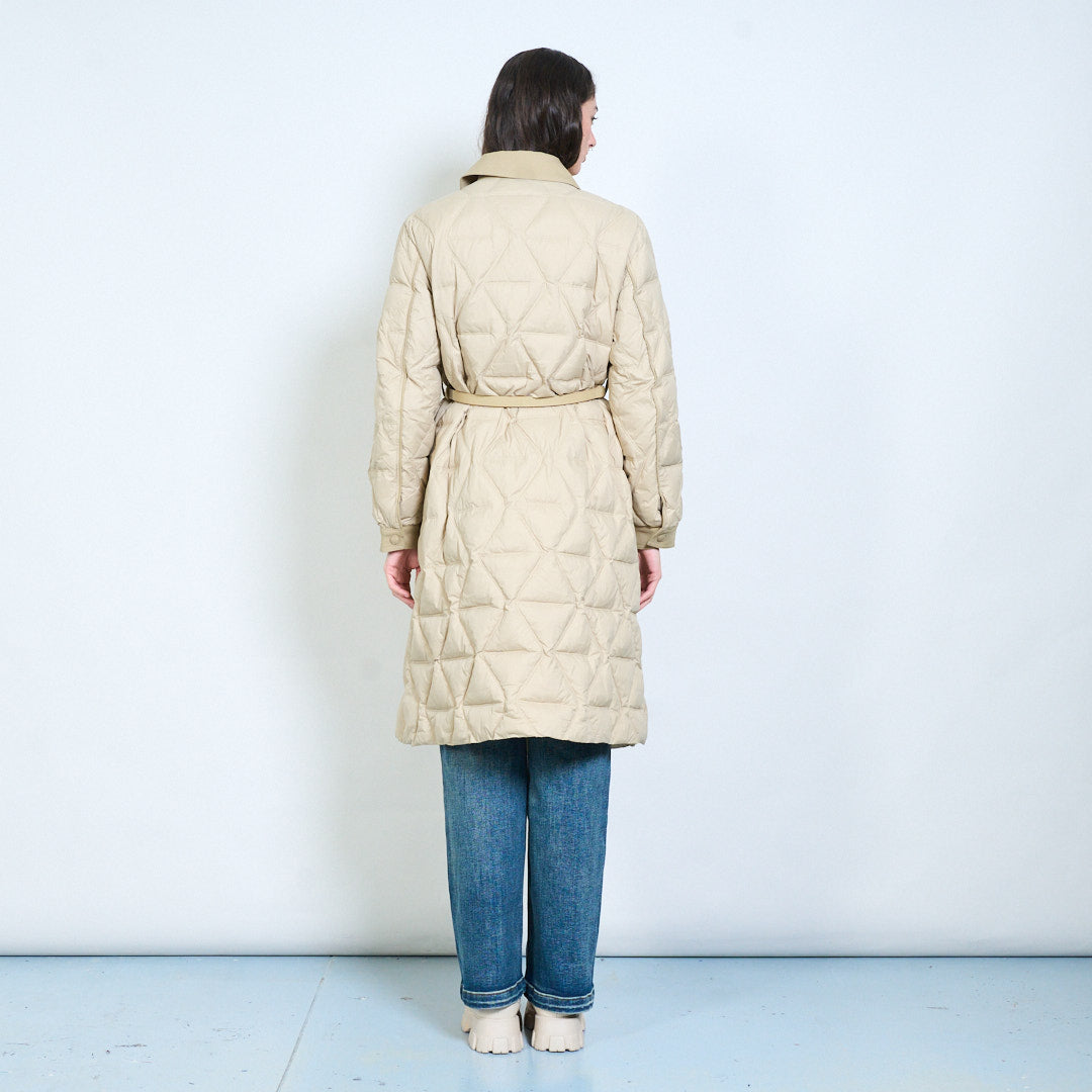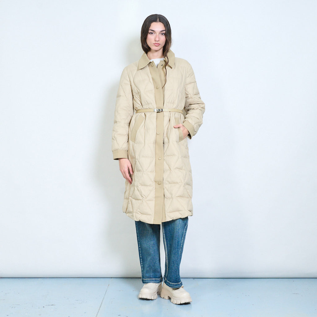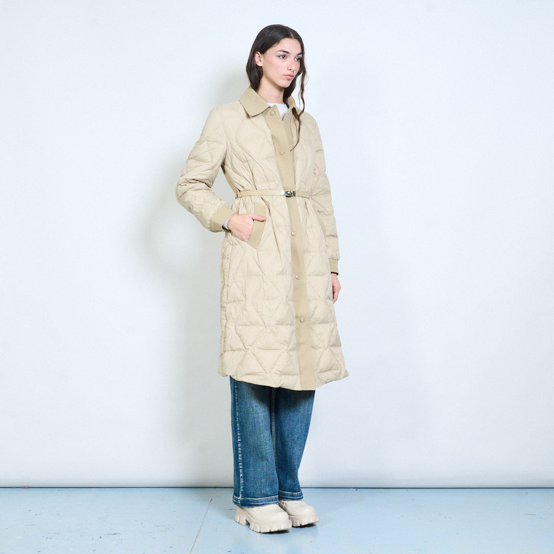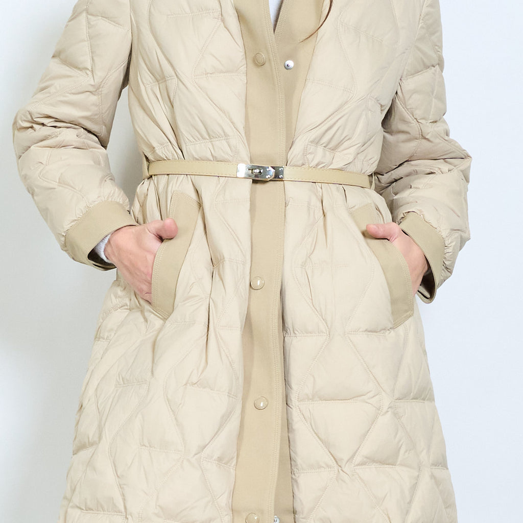 绗缝几何鸭绒长款大衣,结构领细节批发