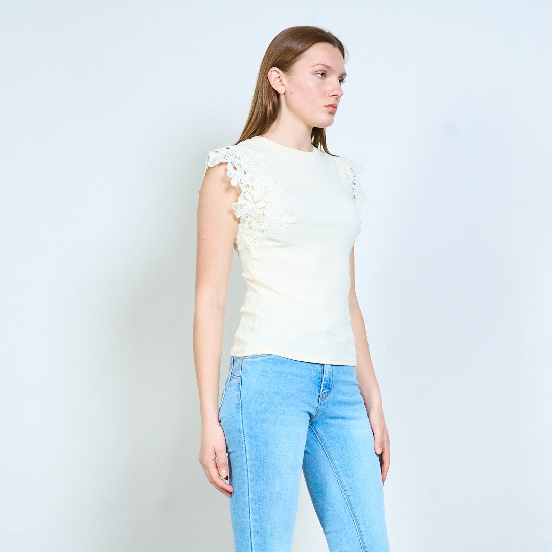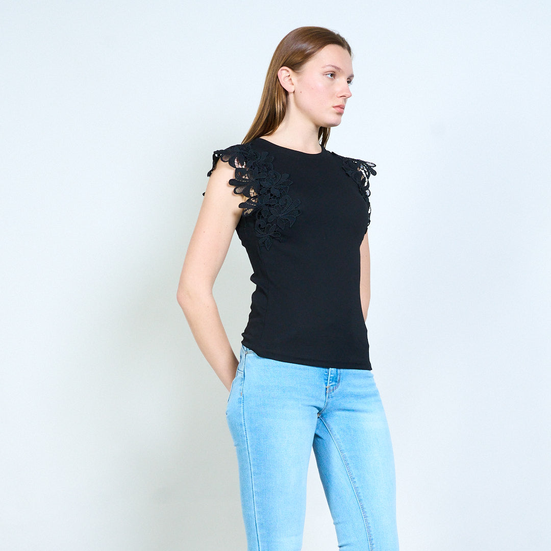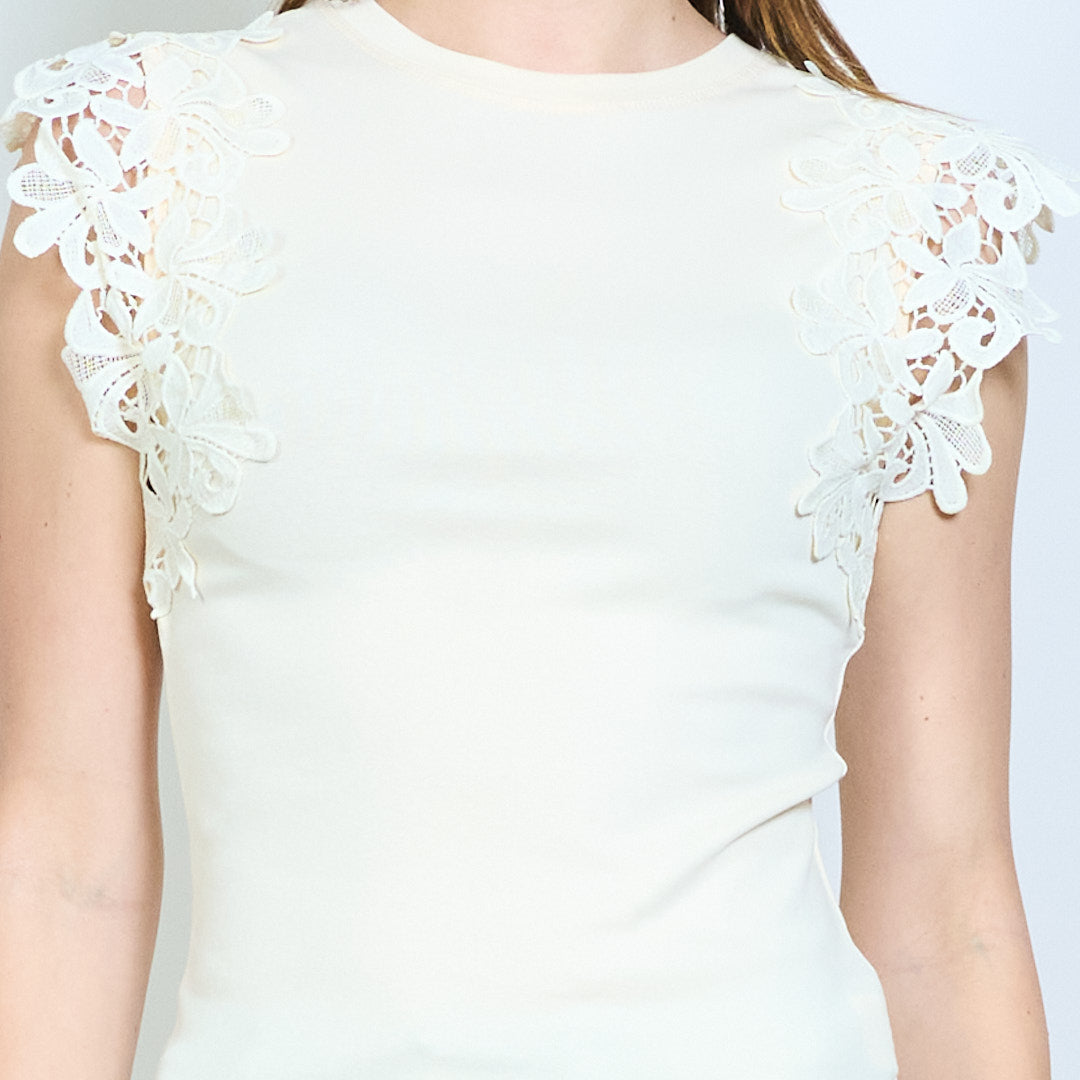 - 柔软平针织底布,肩部饰有花卉蕾丝贴花