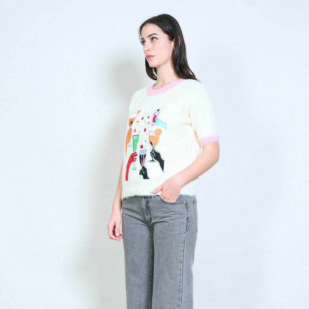 鸡尾酒欢呼图案嵌花针织短袖毛衣批发