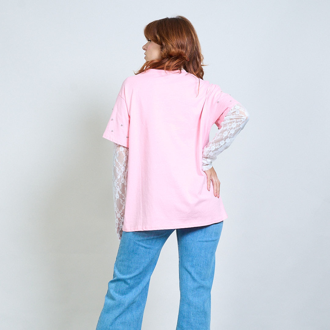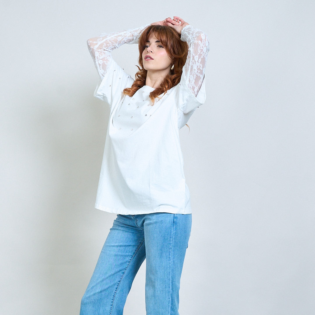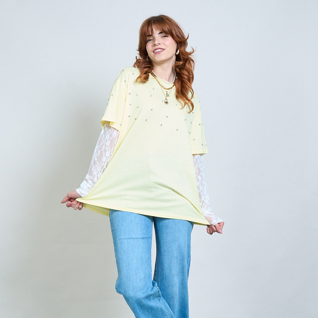 珍珠钉蕾丝袖子分层外观轻松的T恤批发