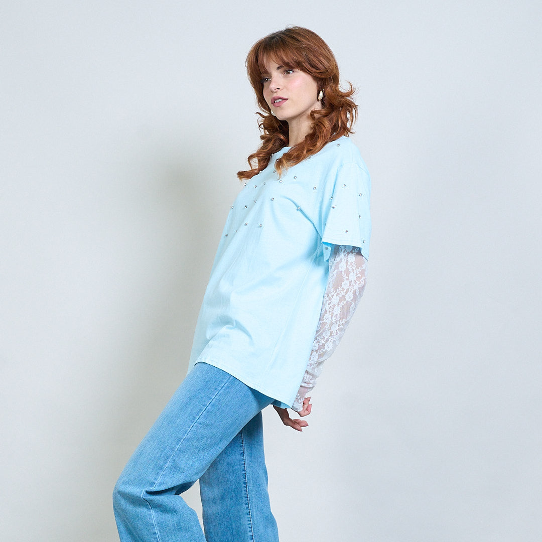 - 放松身心的T恤,前面带有珍珠螺柱点缀