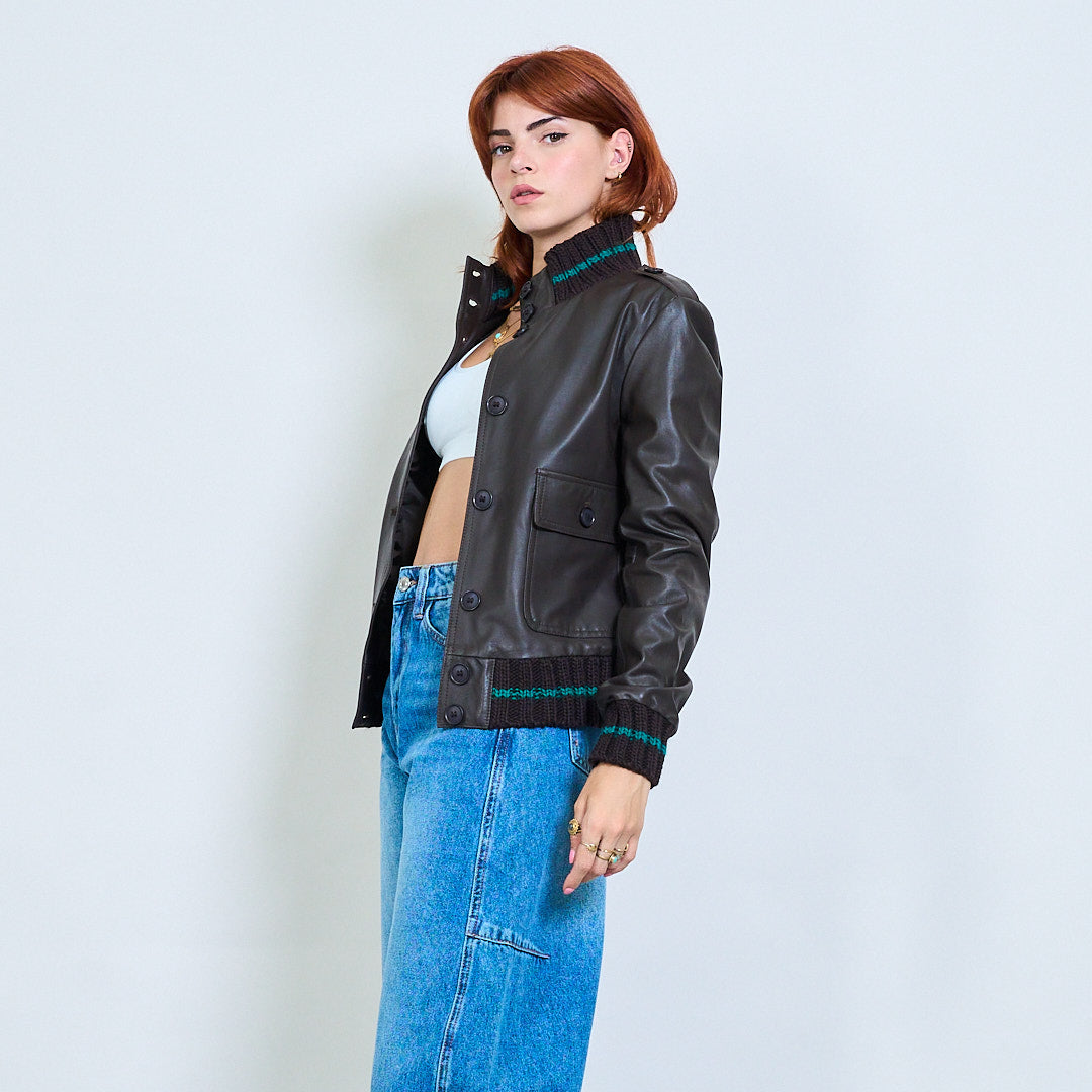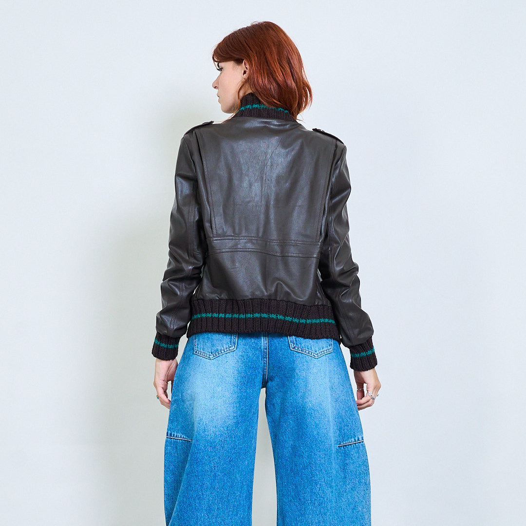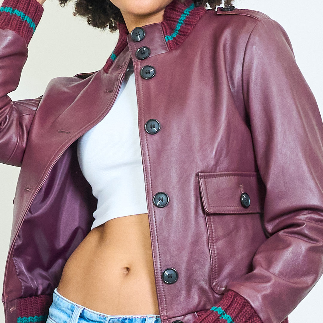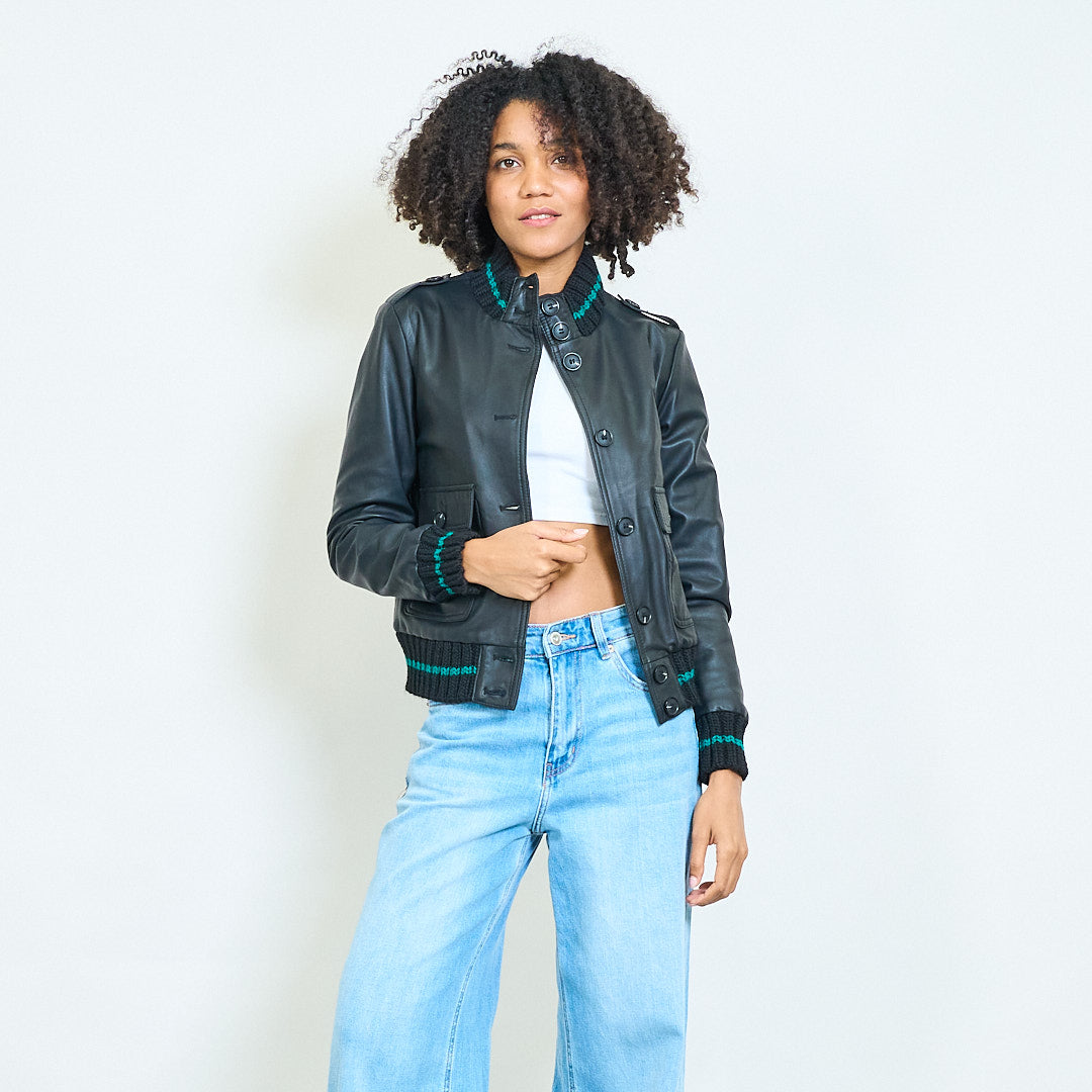 真正的皮革实用夹克配针织项圈和纽扣细节批发