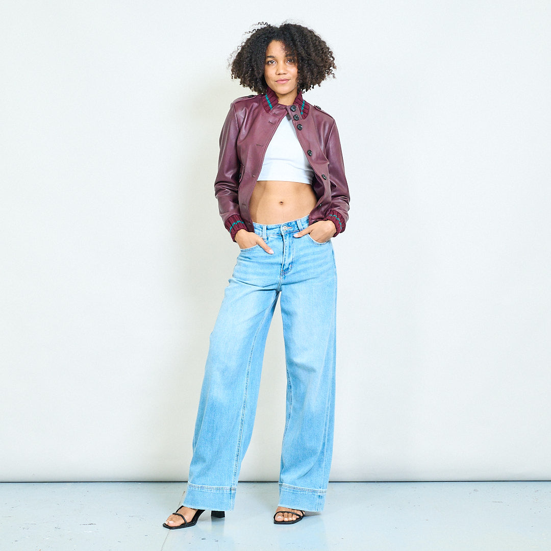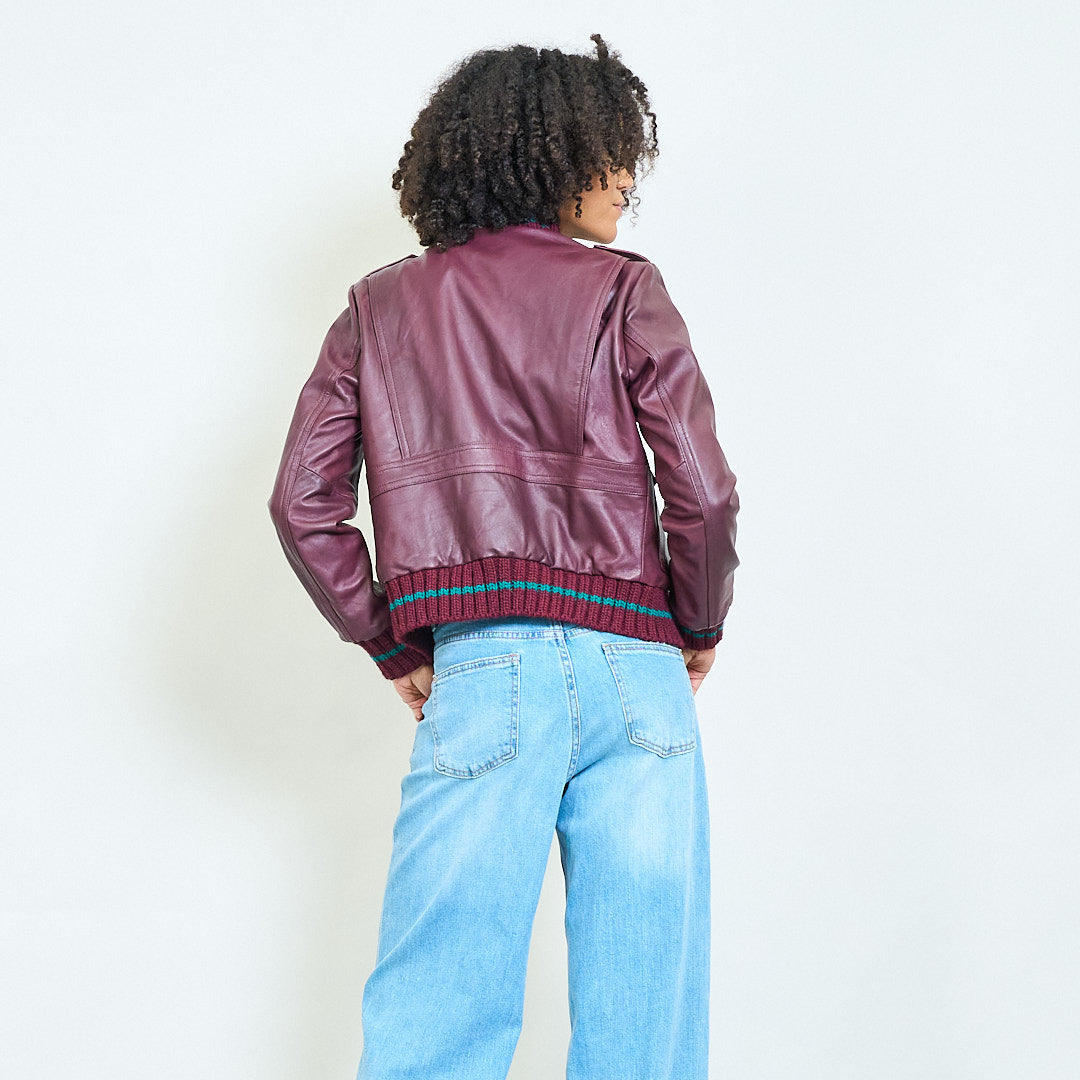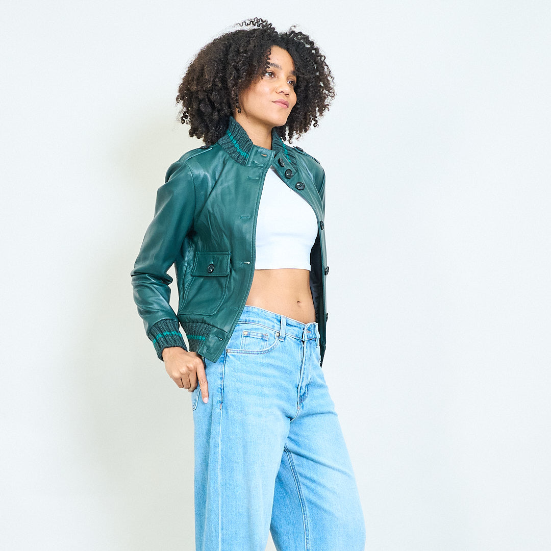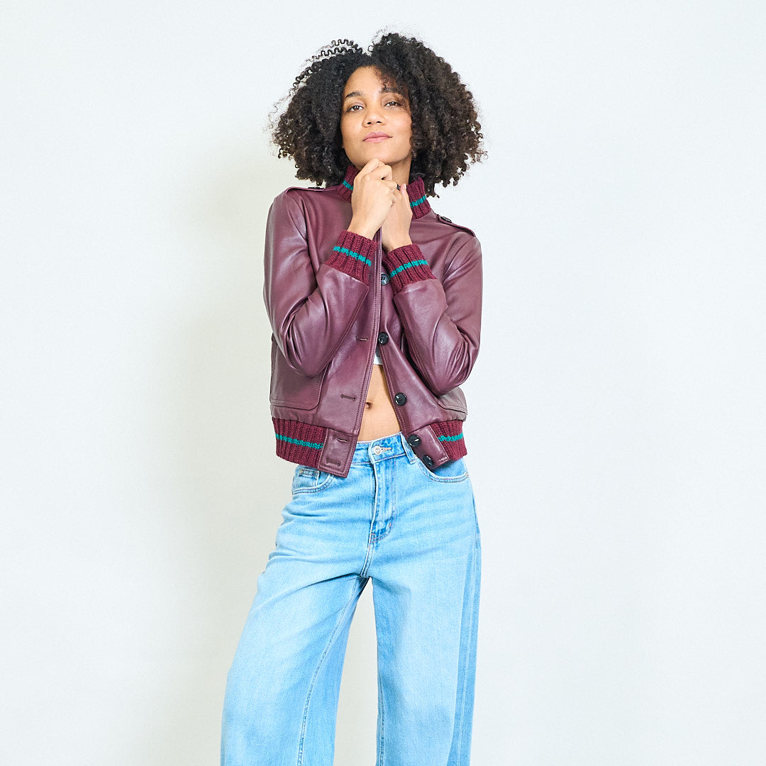 真正的皮革实用夹克配针织项圈和纽扣细节批发