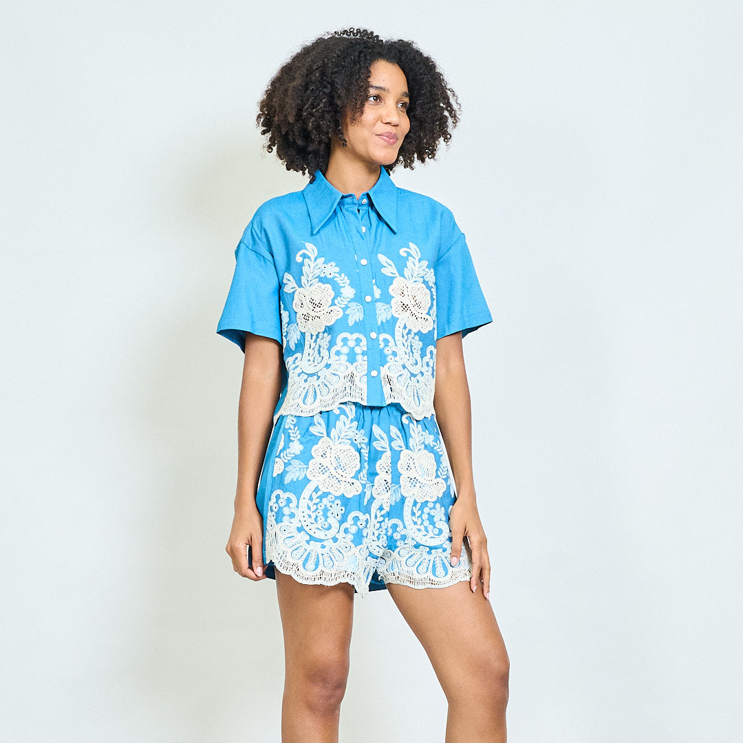 短袖衬衫和短裤,配有华丽的花卉刺绣批发