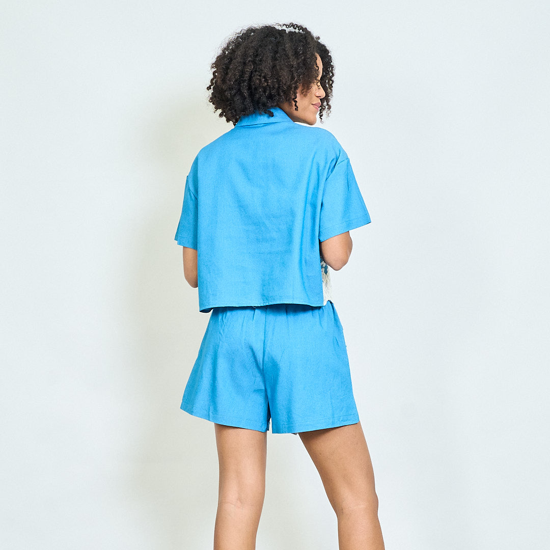 - 协调的两件套服装,配有衬衫和短裤