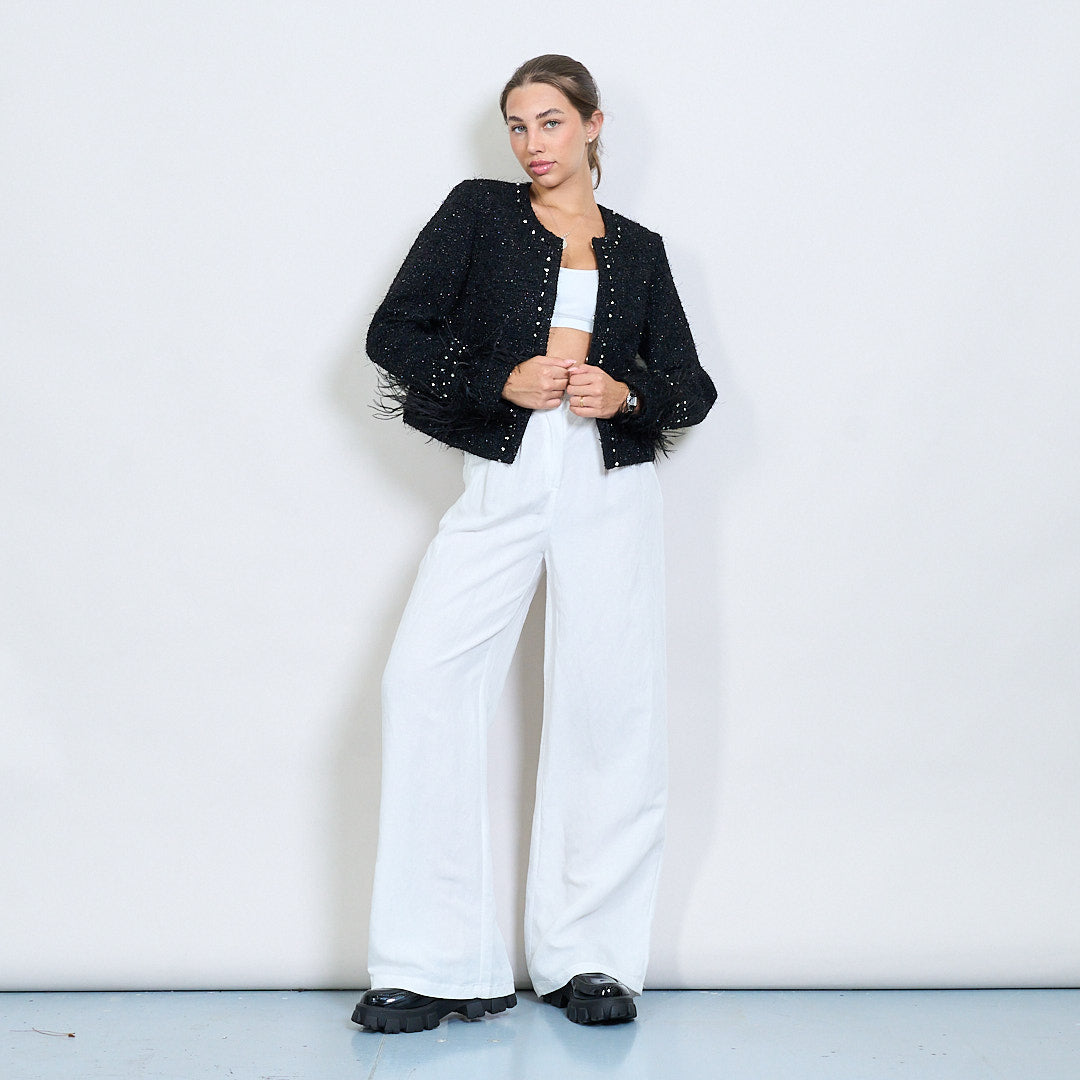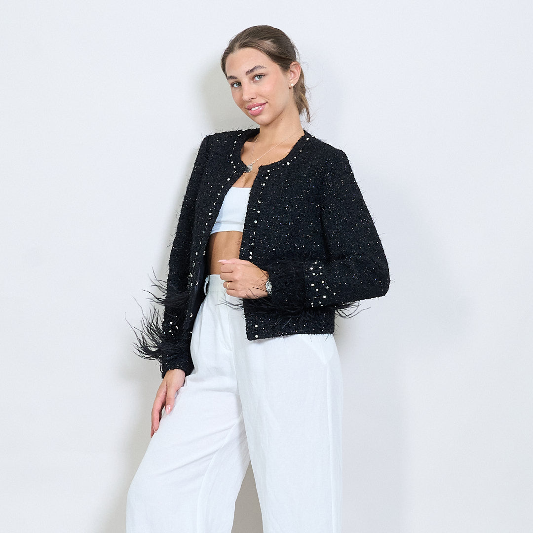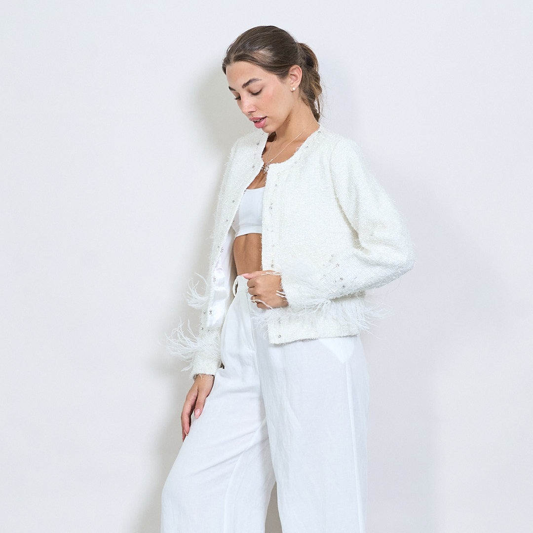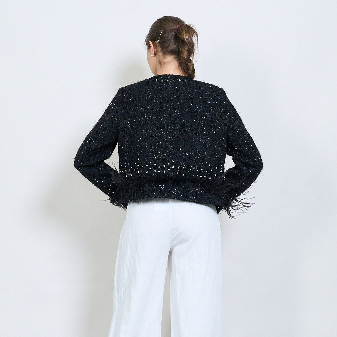 花呢珍珠浸泡的裁剪夹克和羽毛饰批发