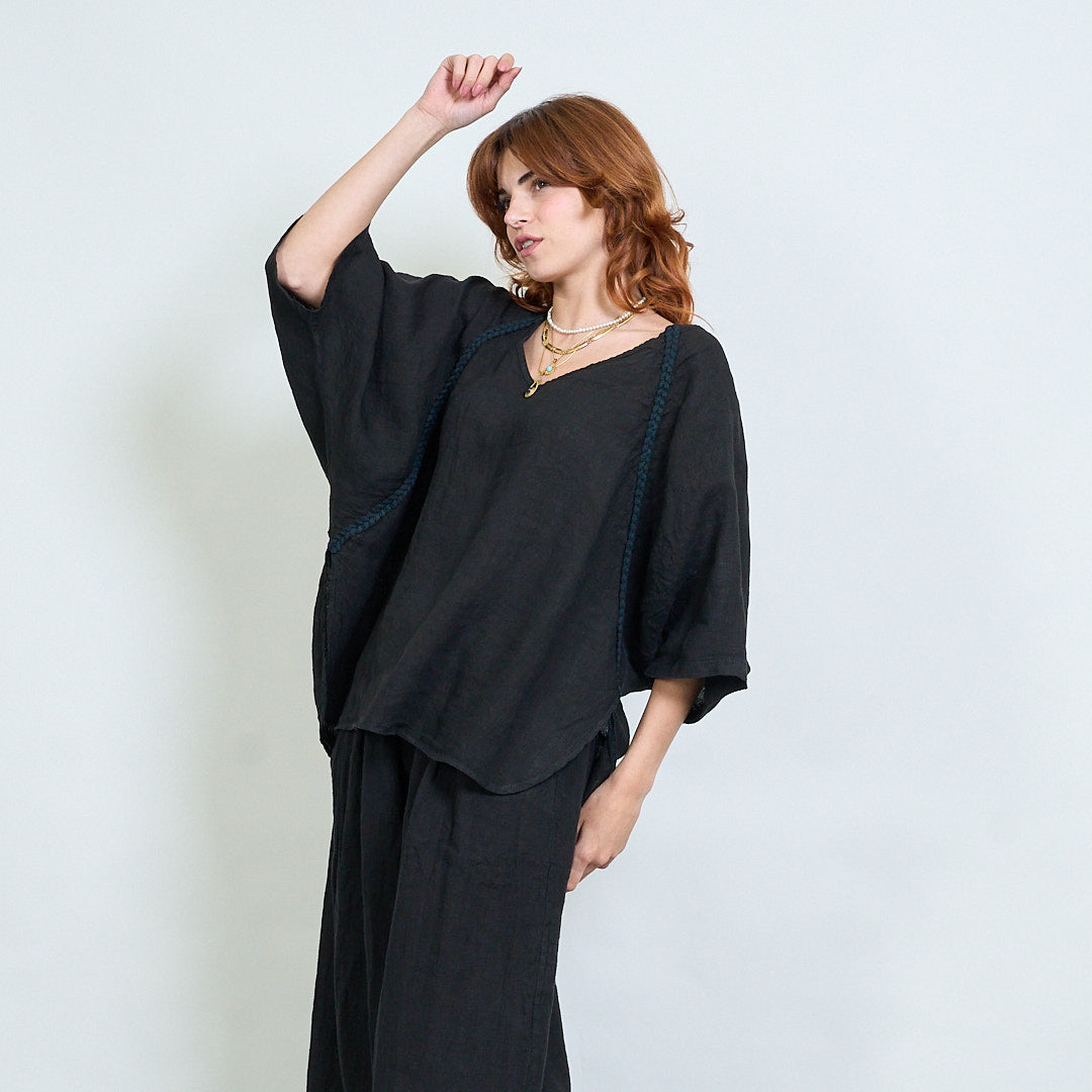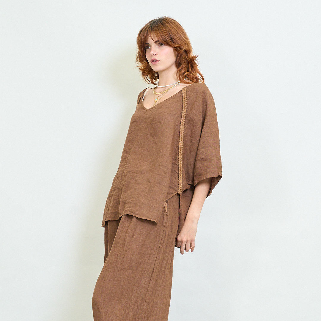 - 肩膀上的编织饰边增加了微妙的质感和兴趣