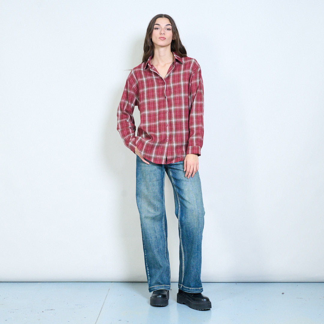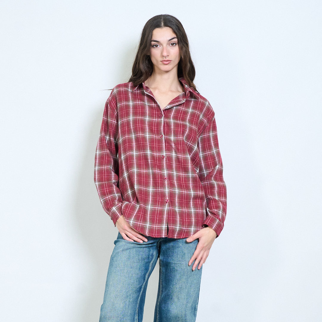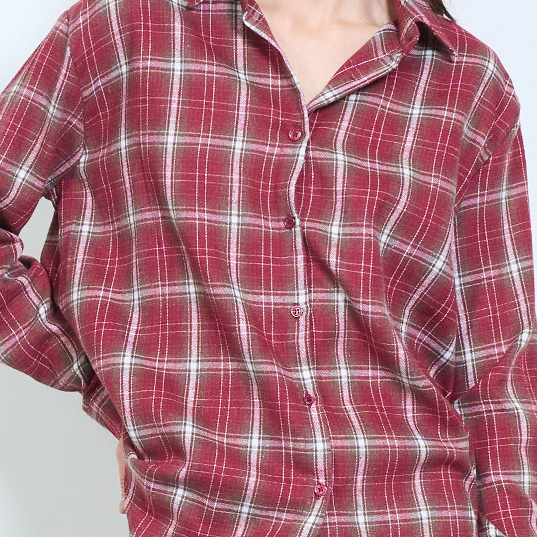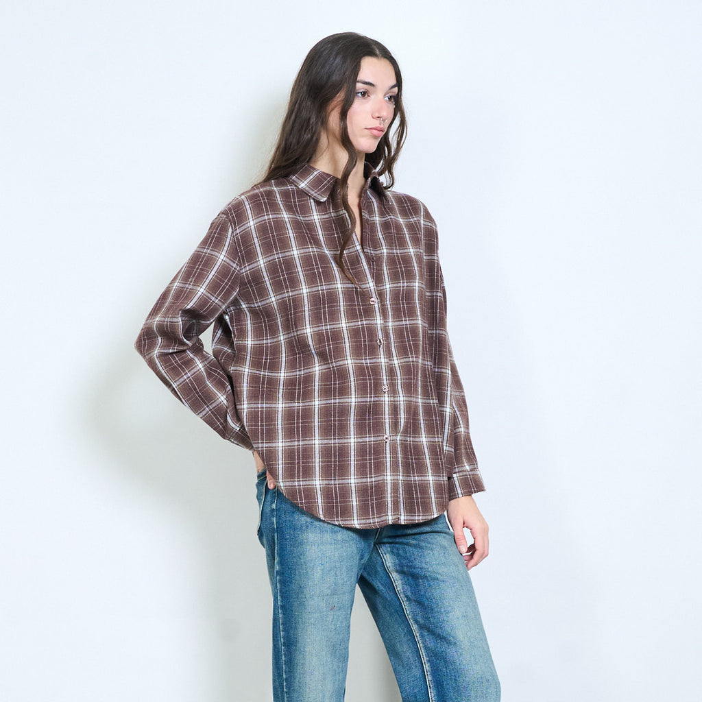 格子格纹前扣休闲长袖衬衫批发