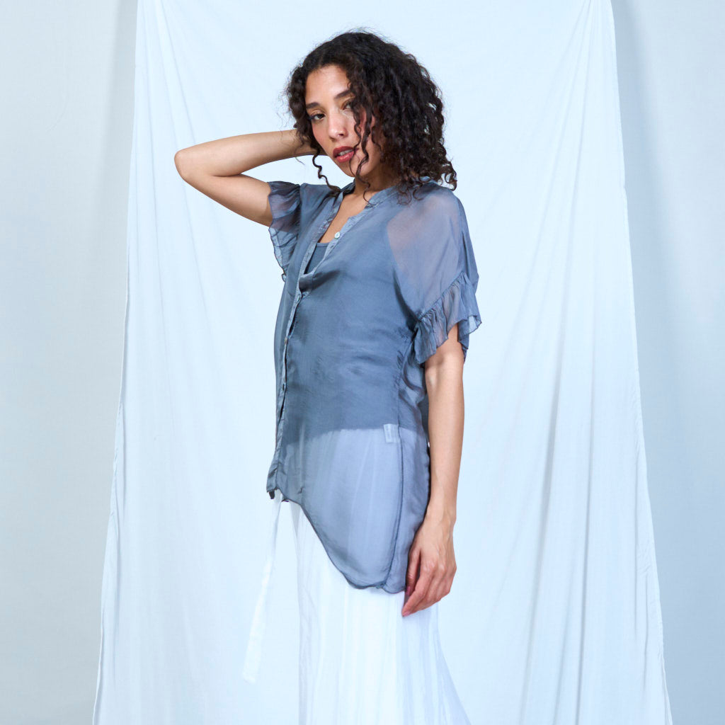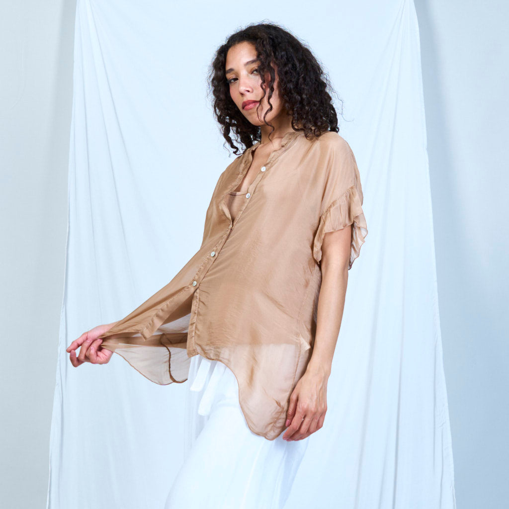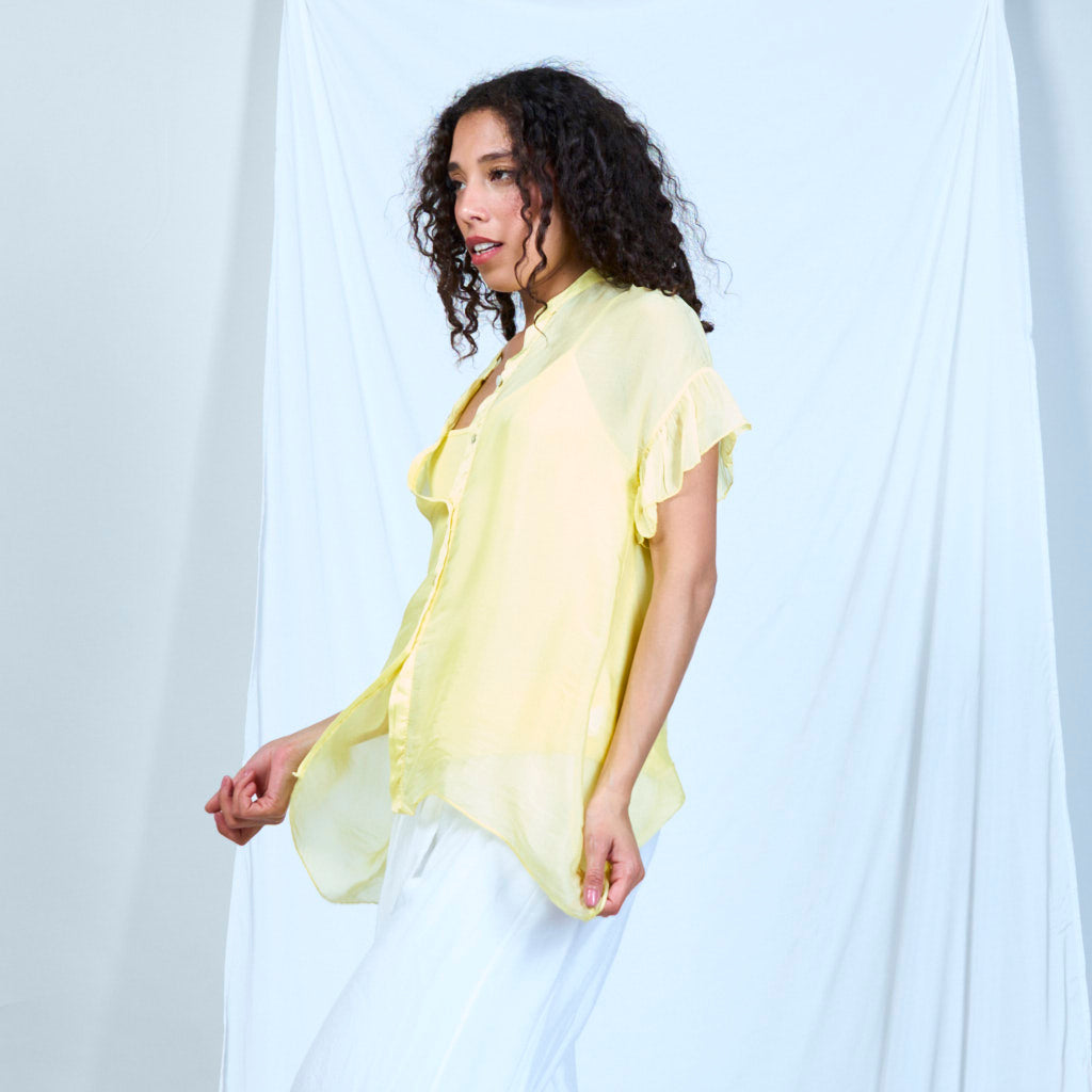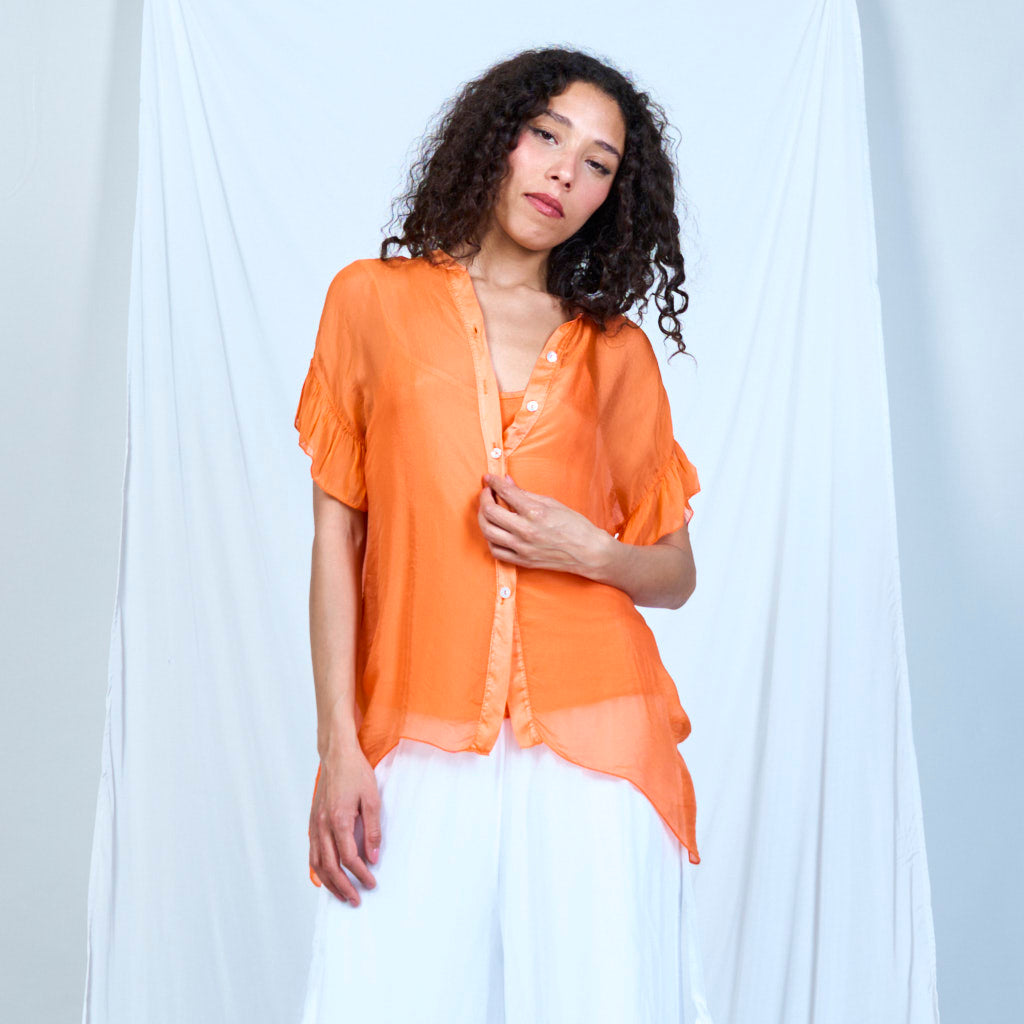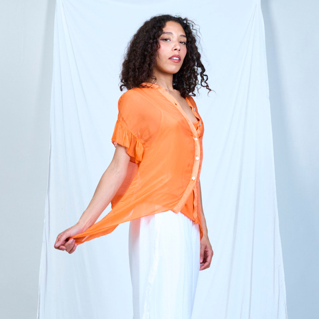 丝绸雪纺柑橘透明衬衫,荷叶边袖子批发