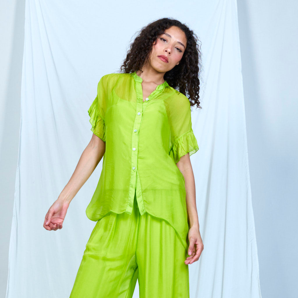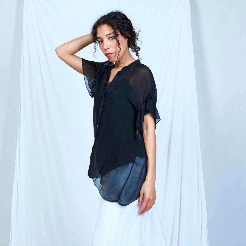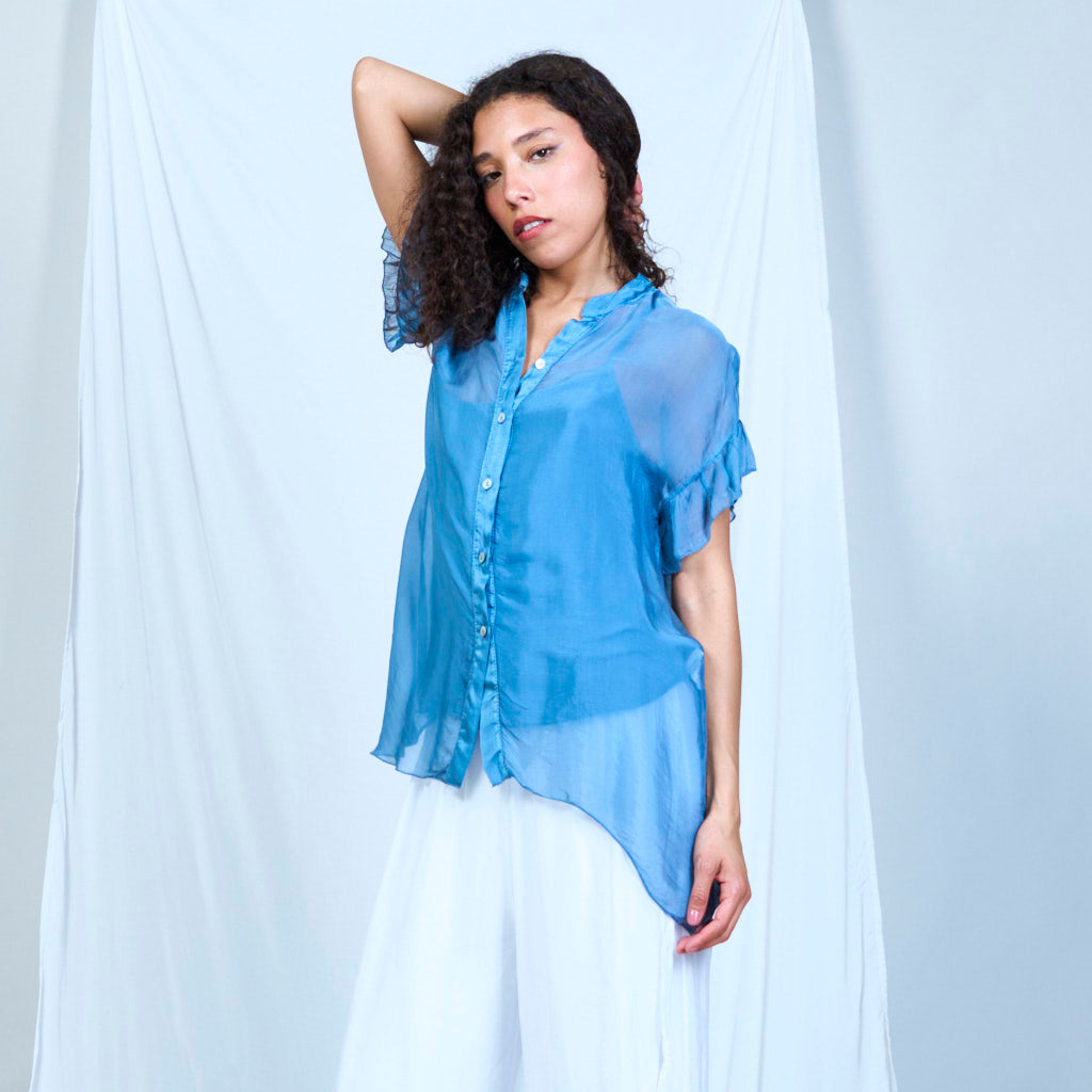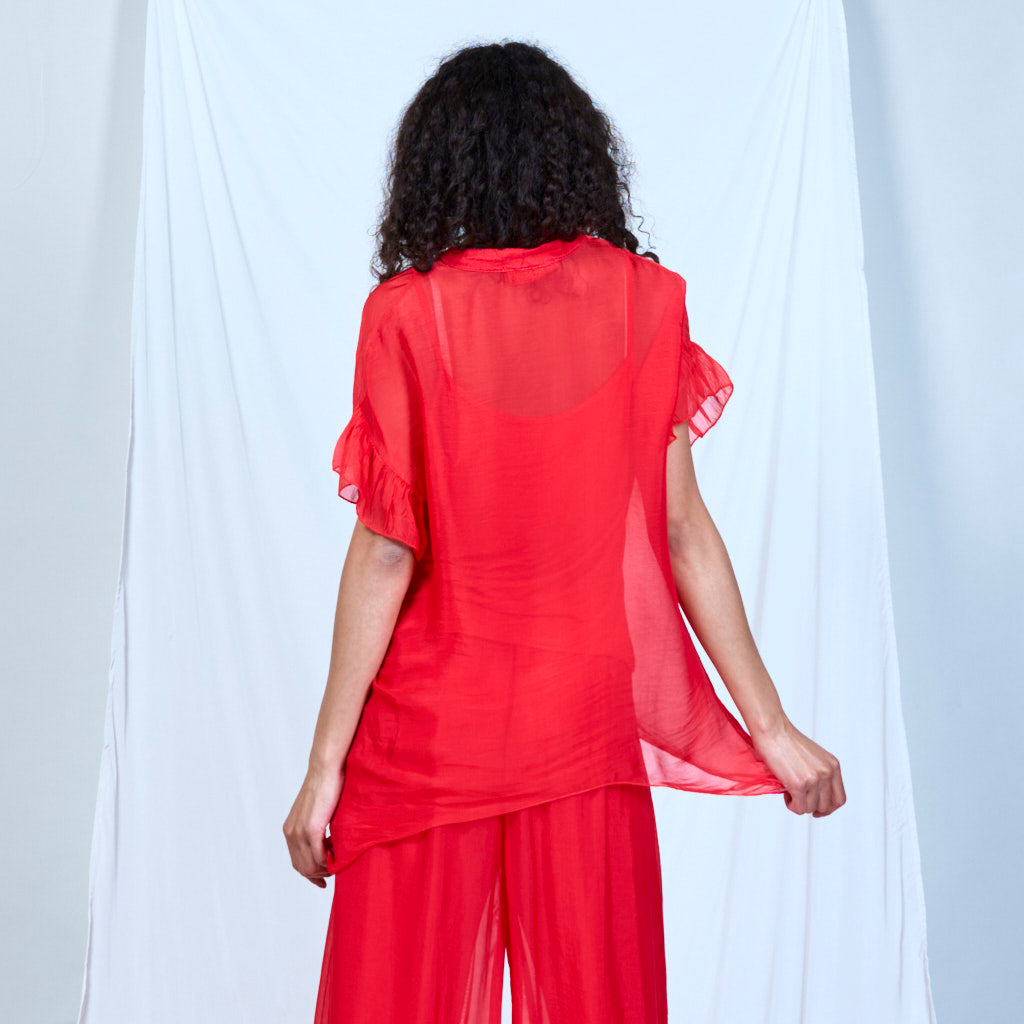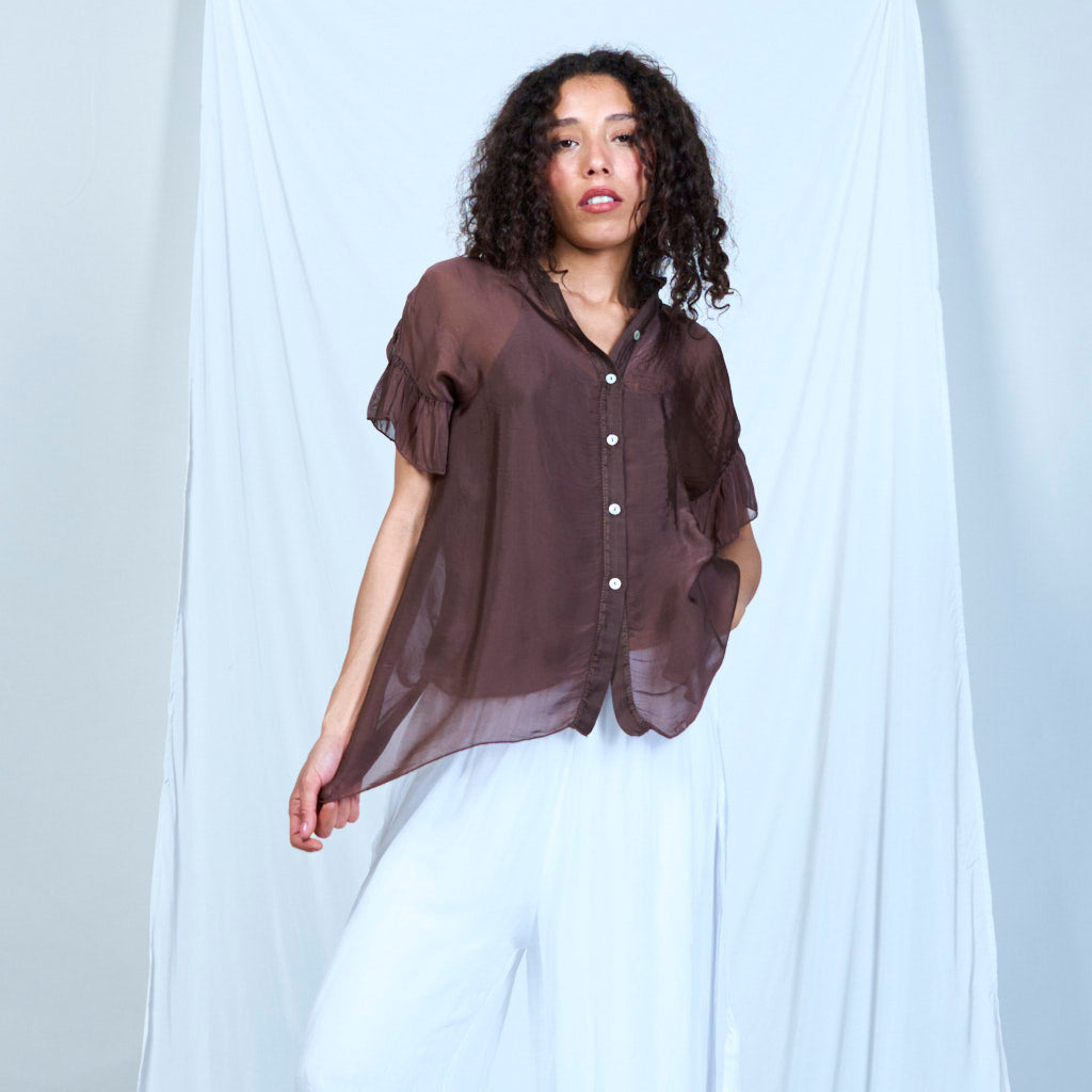丝绸雪纺柑橘透明衬衫,荷叶边袖子批发