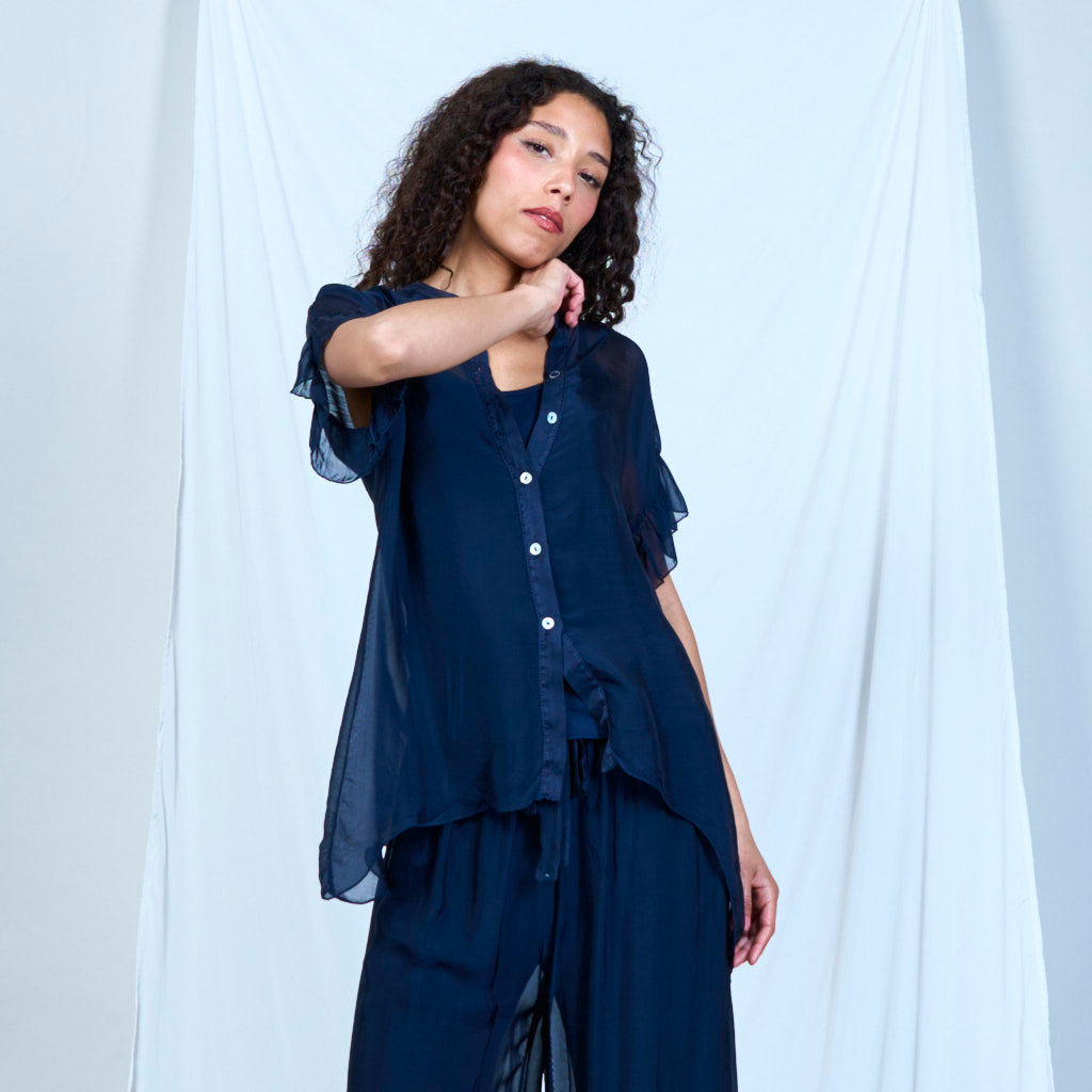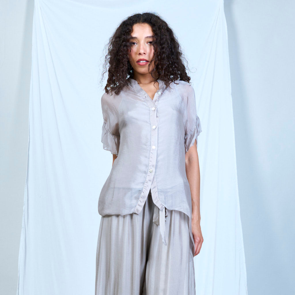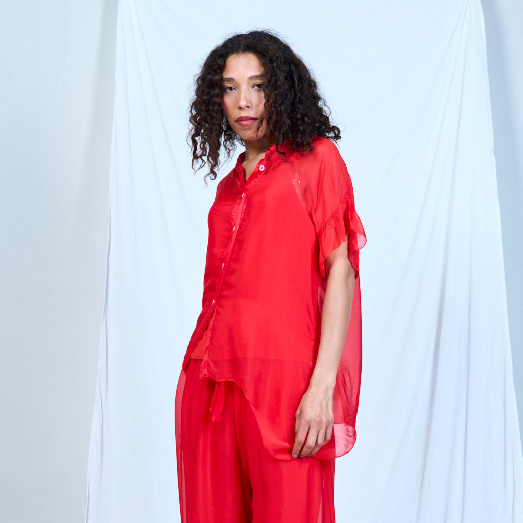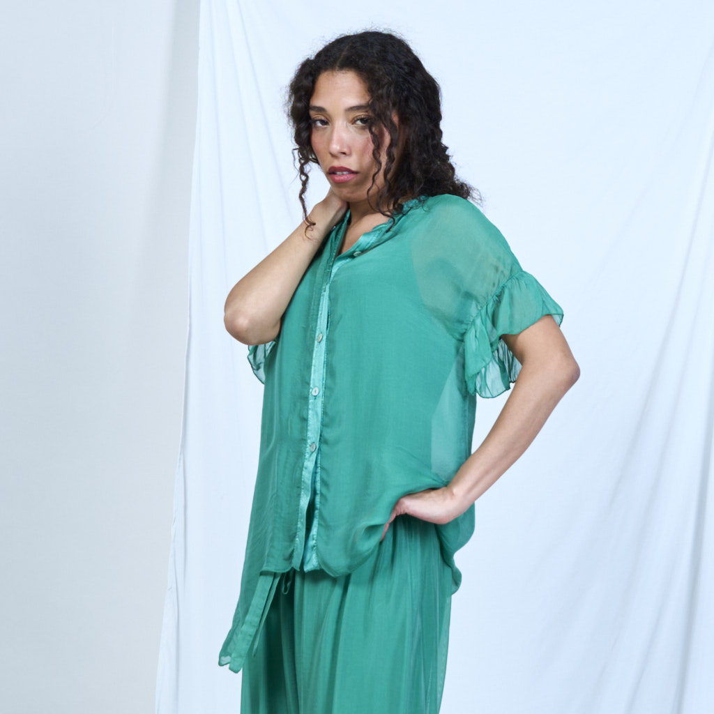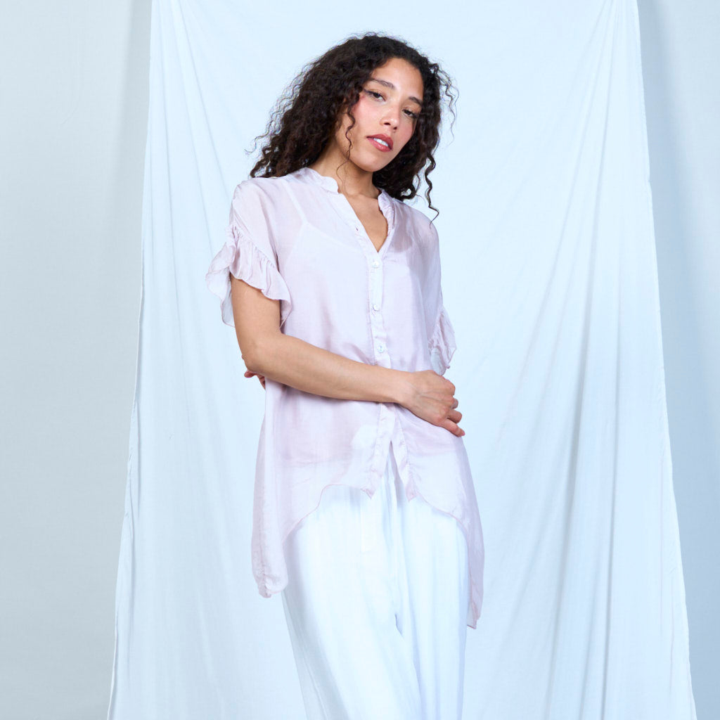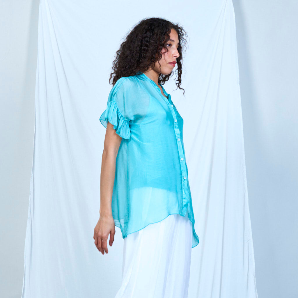 丝绸雪纺柑橘透明衬衫,荷叶边袖子批发