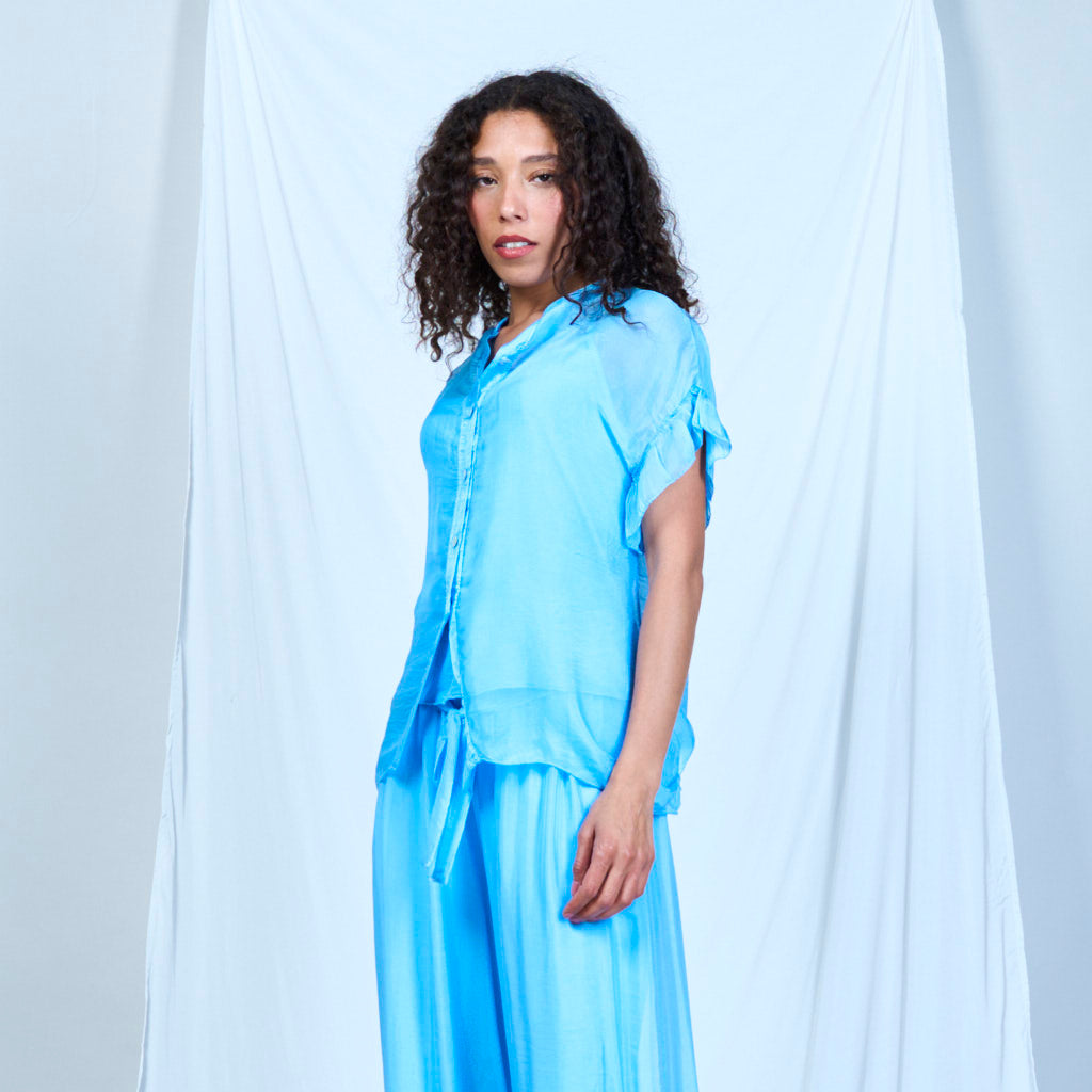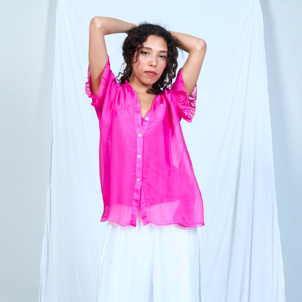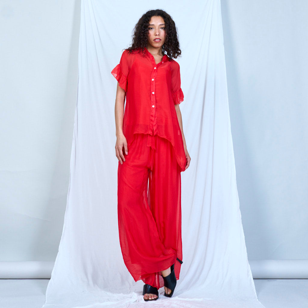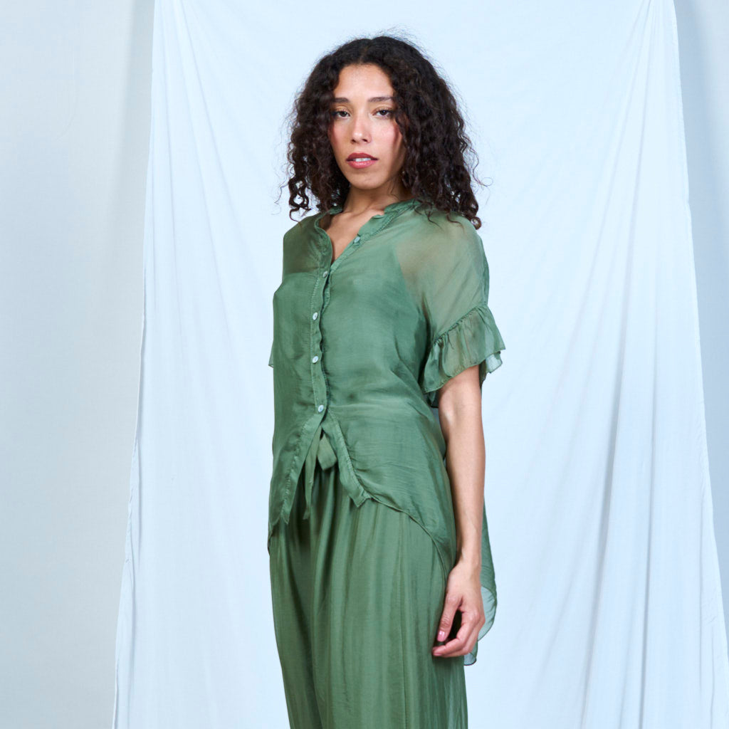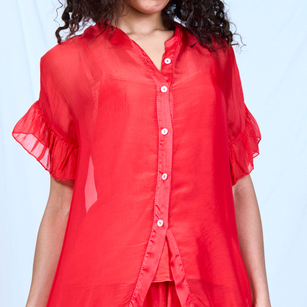 丝绸雪纺柑橘透明衬衫,荷叶边袖子批发