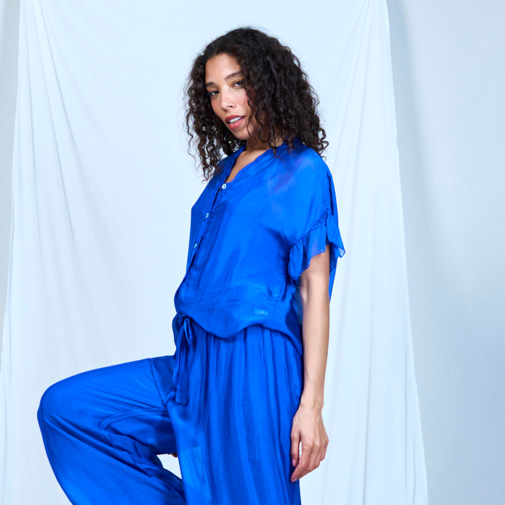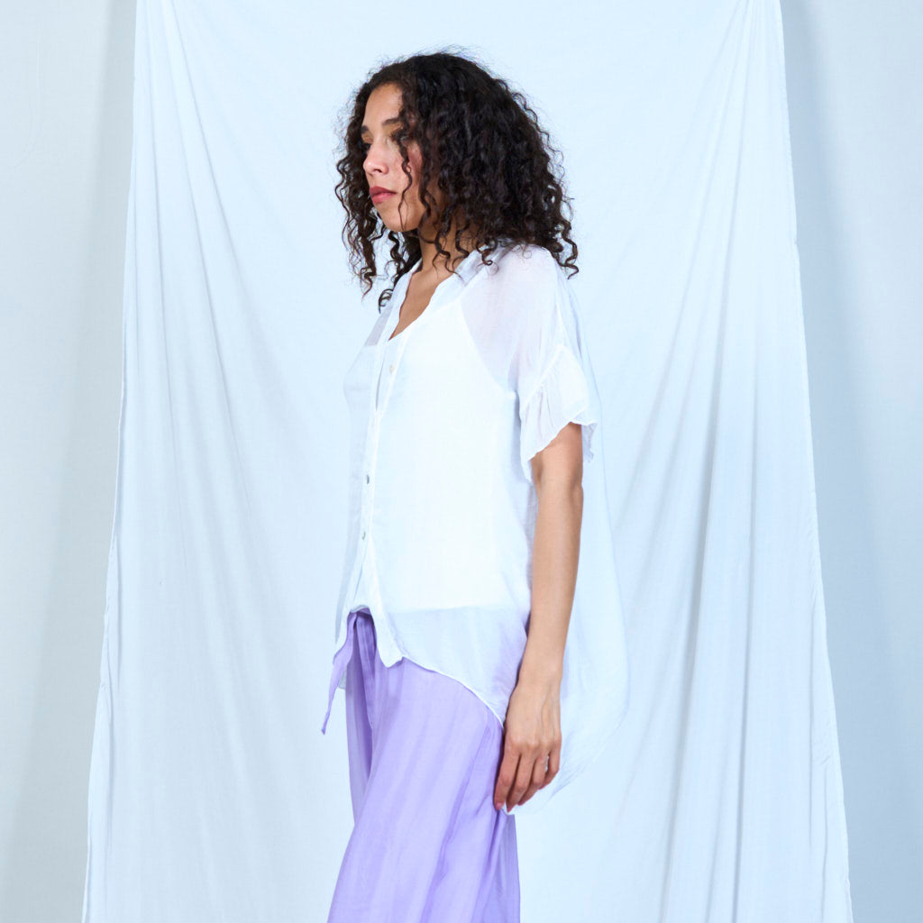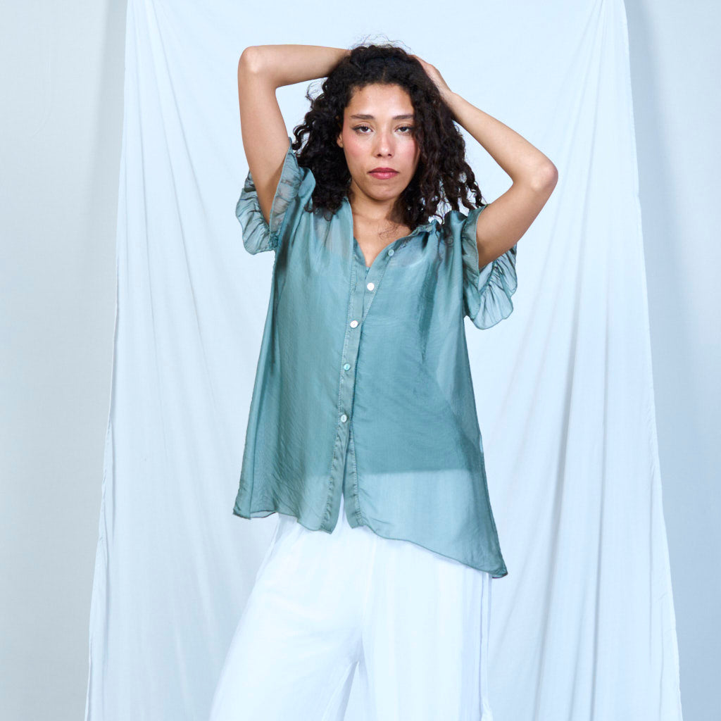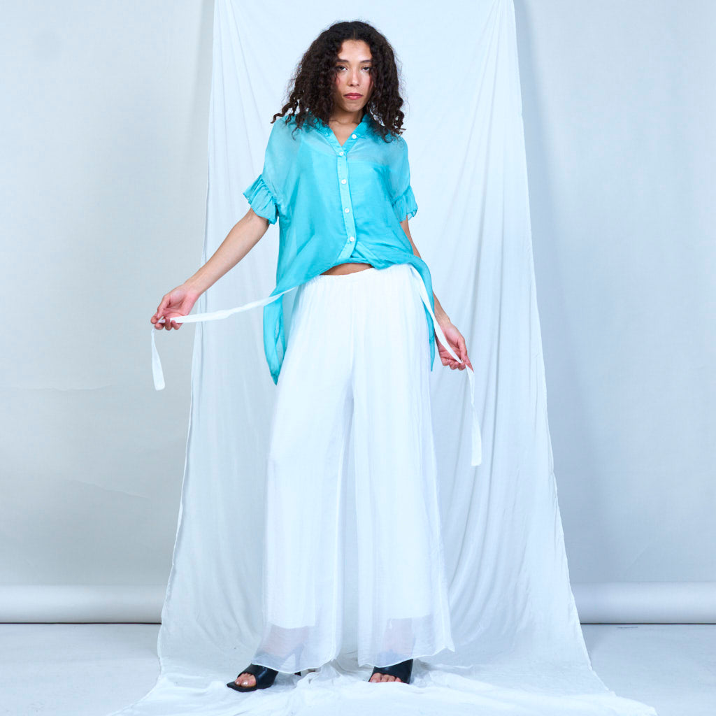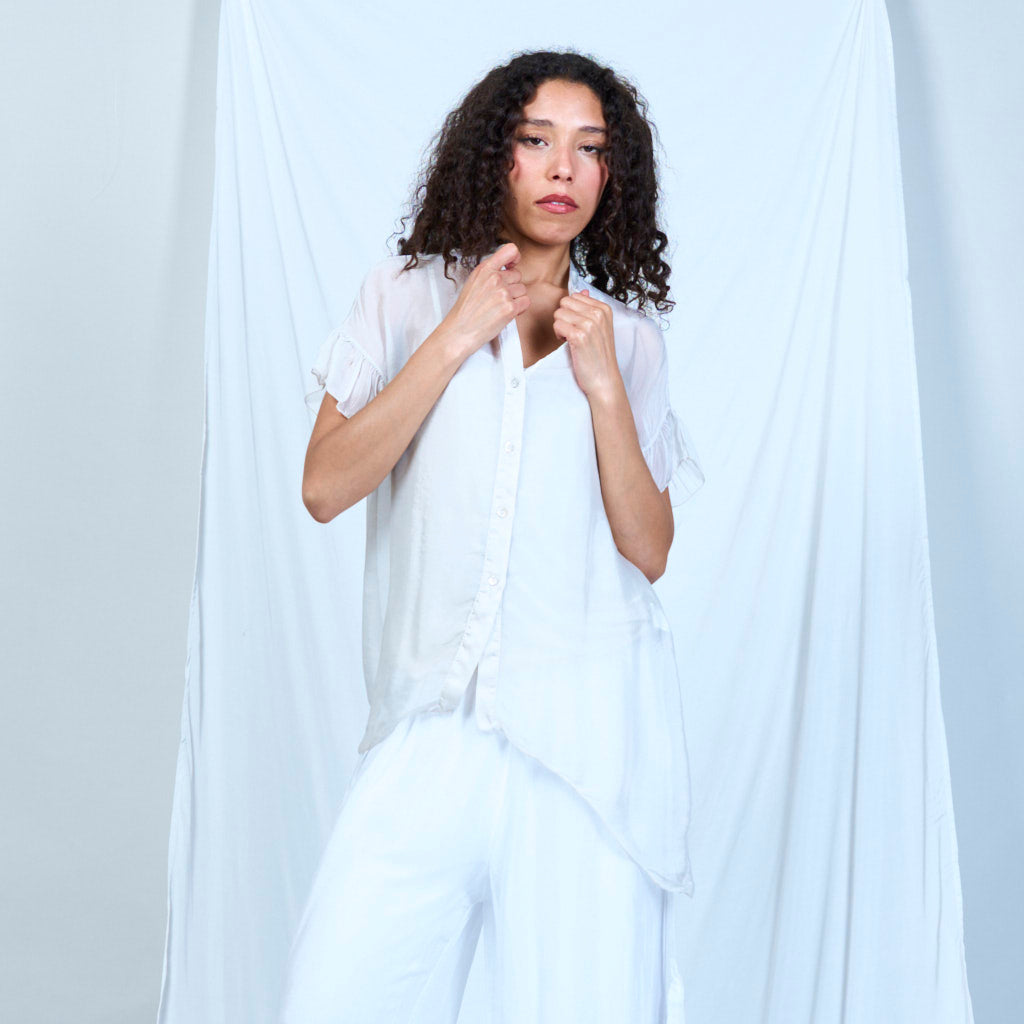 丝绸雪纺柑橘透明衬衫,荷叶边袖子批发