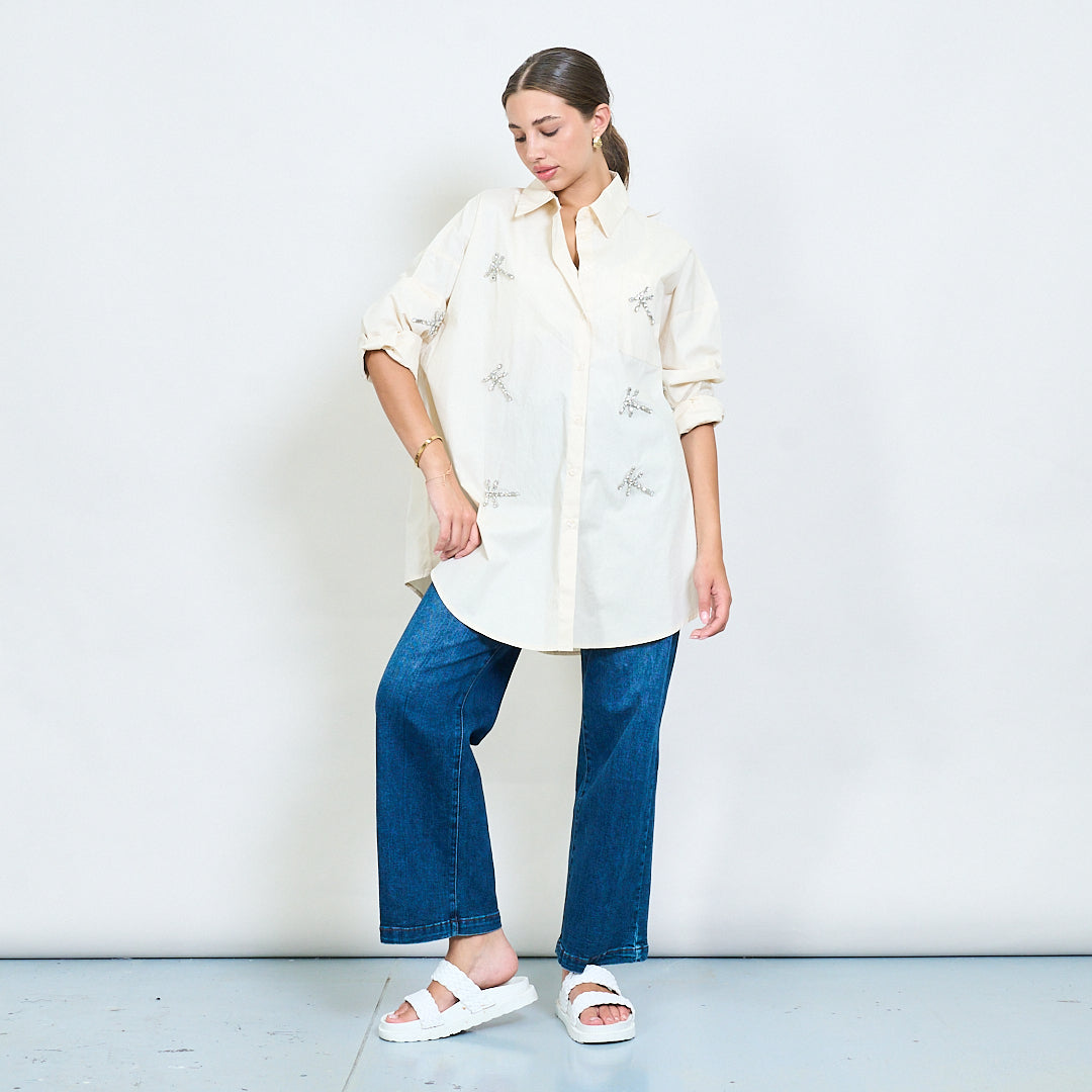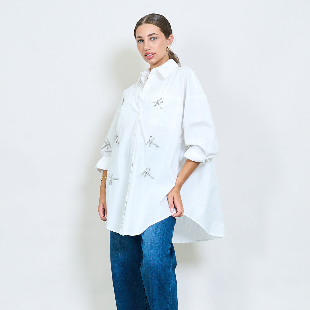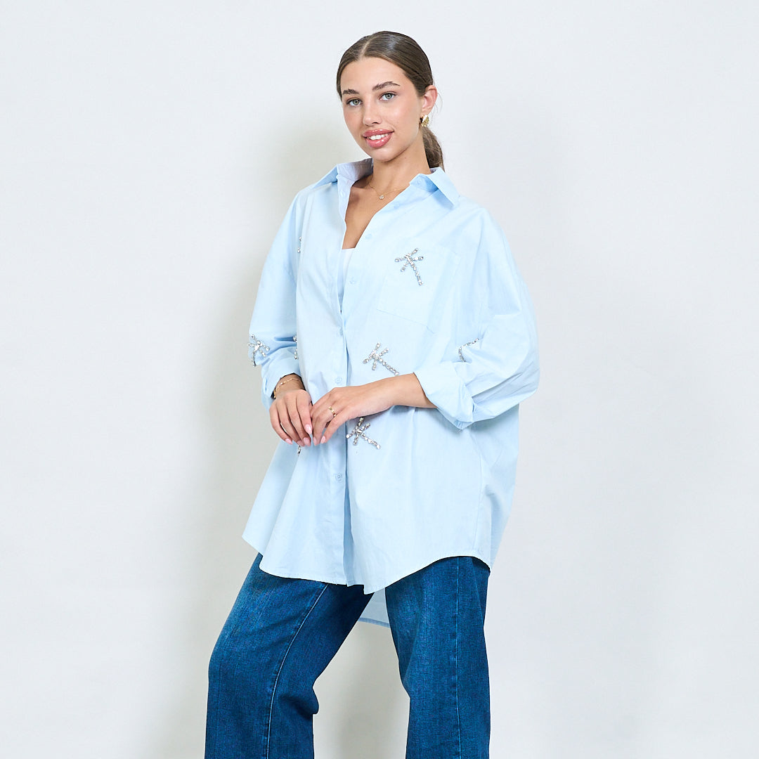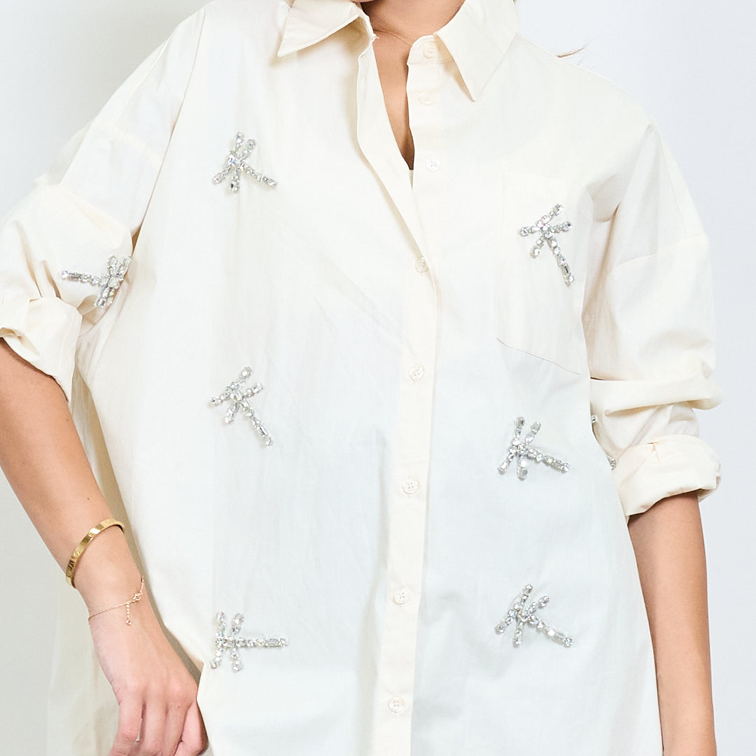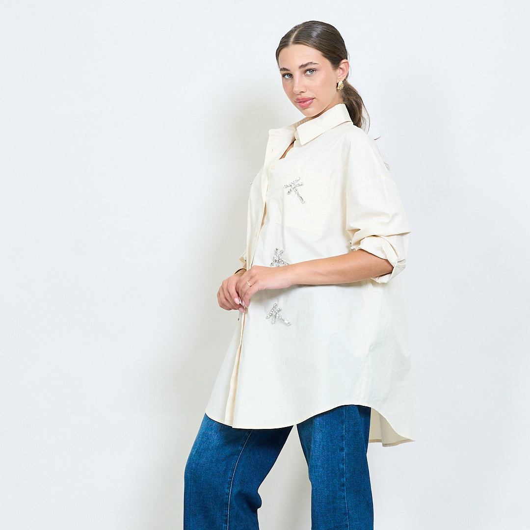 - 在前面和袖子上装饰有多个固定晶体式的胸针