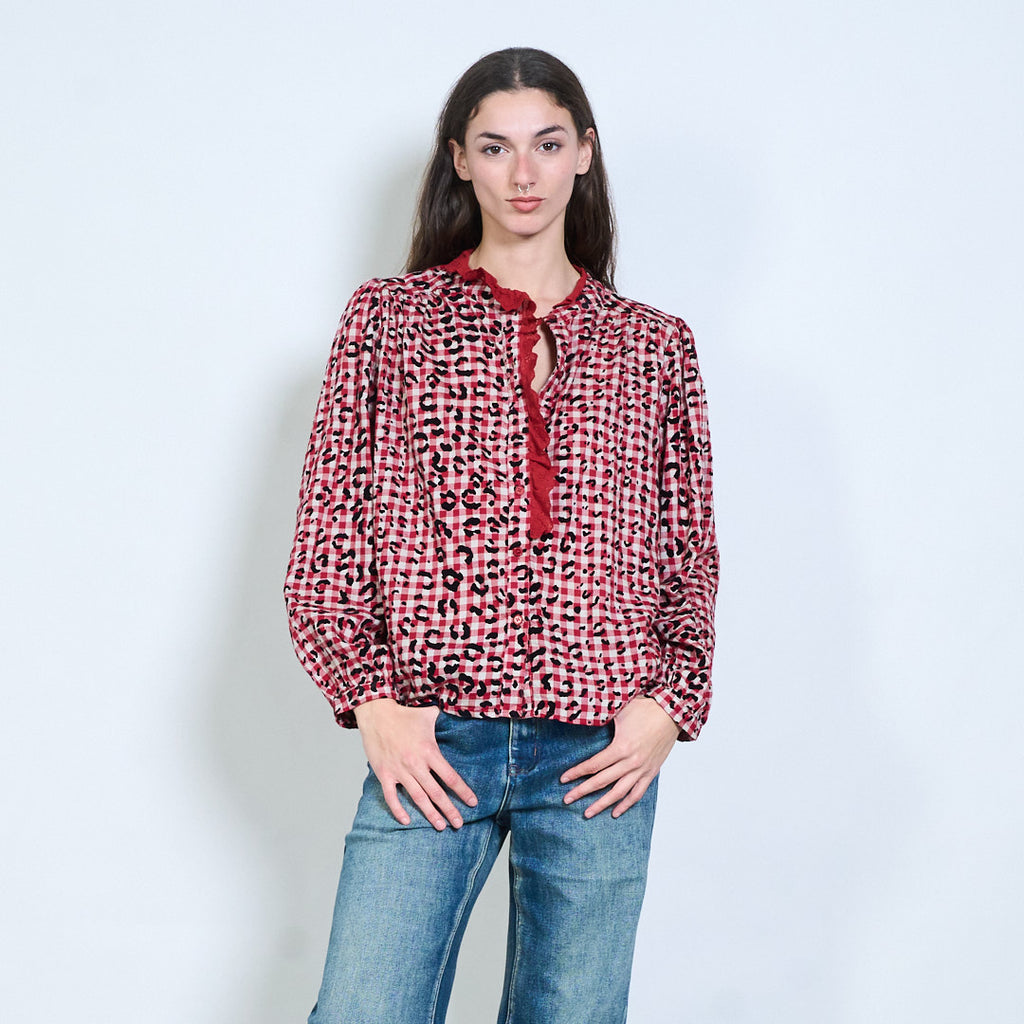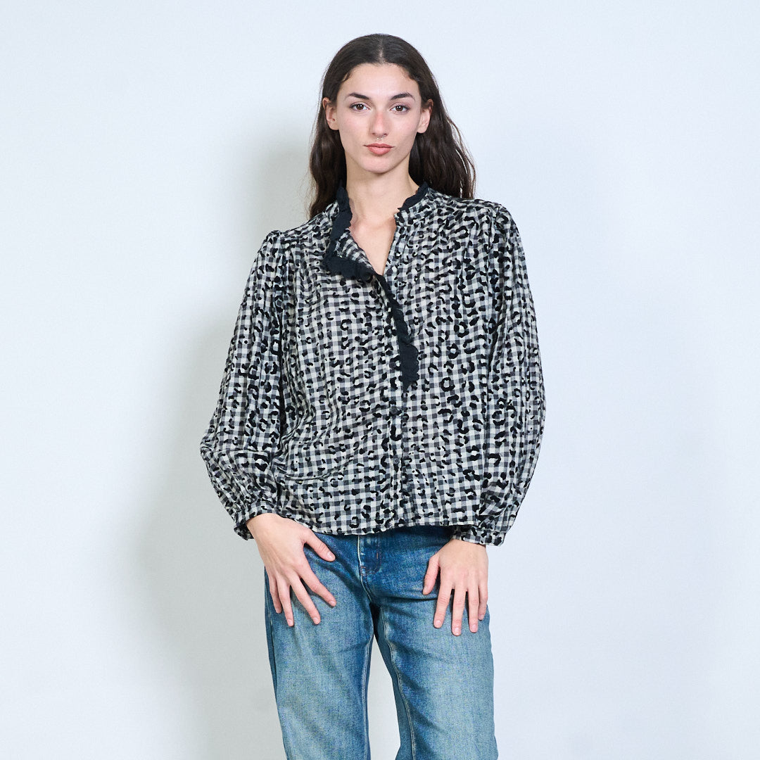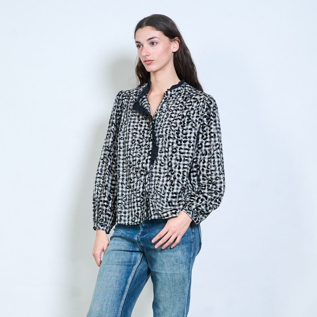Animalia edit 格纹豹纹混合荷叶边系扣衬衫批发