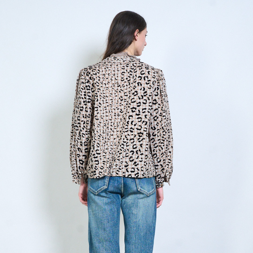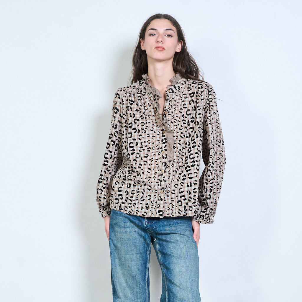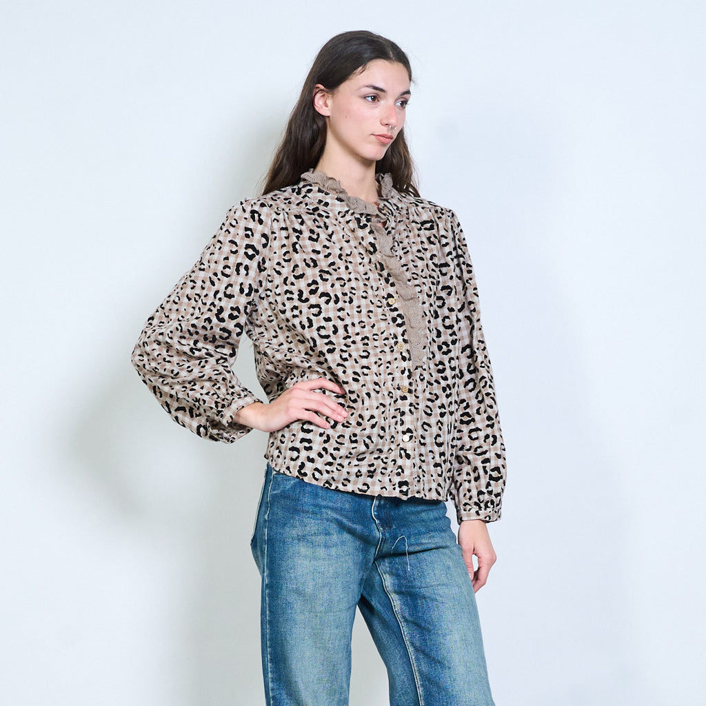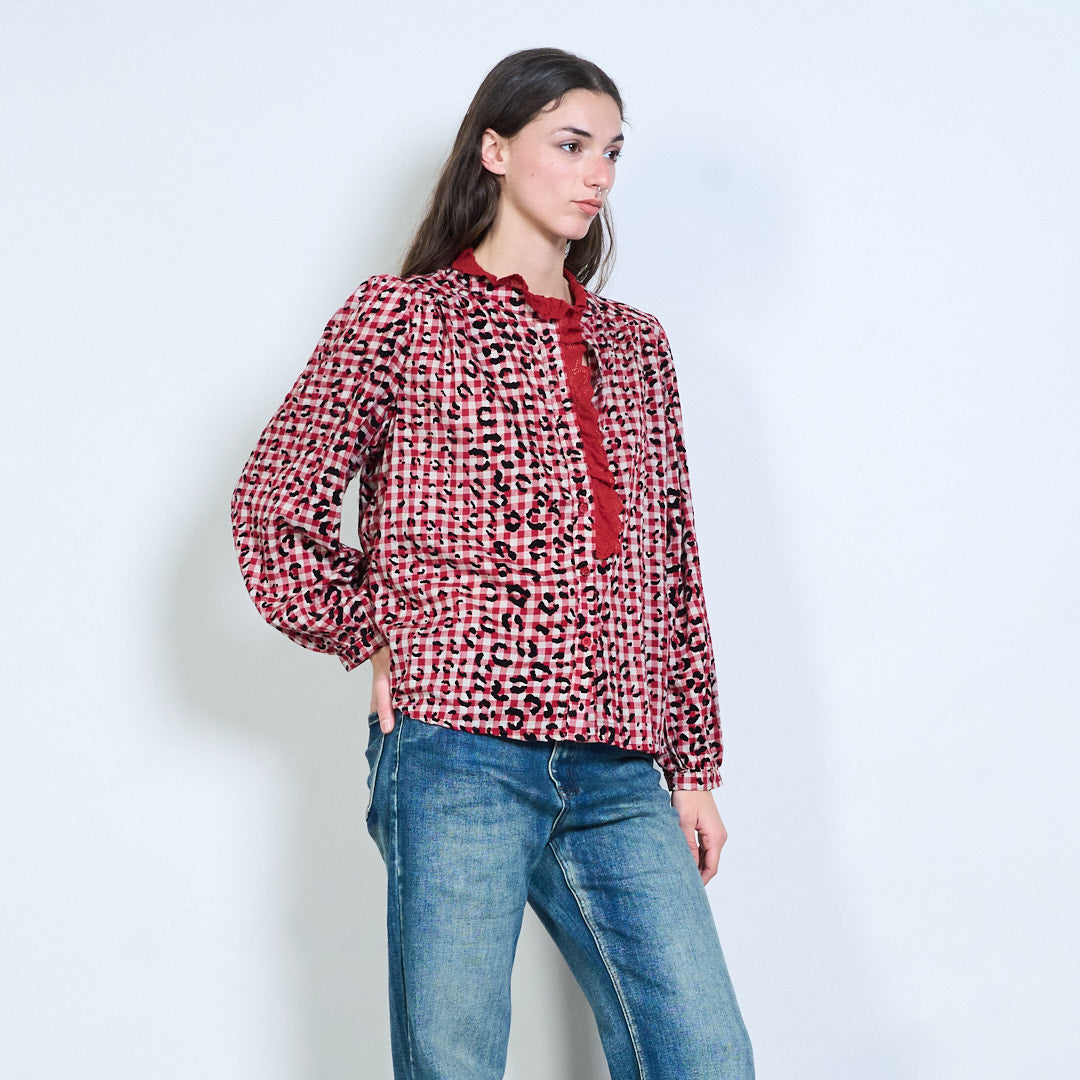 Animalia edit 格纹豹纹混合荷叶边系扣衬衫批发