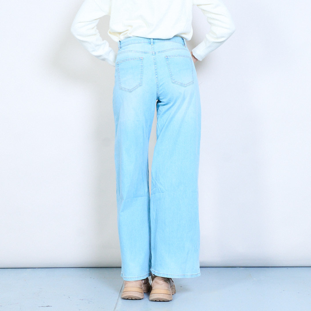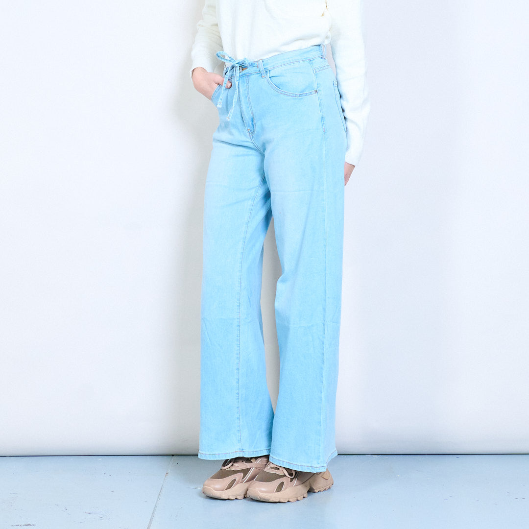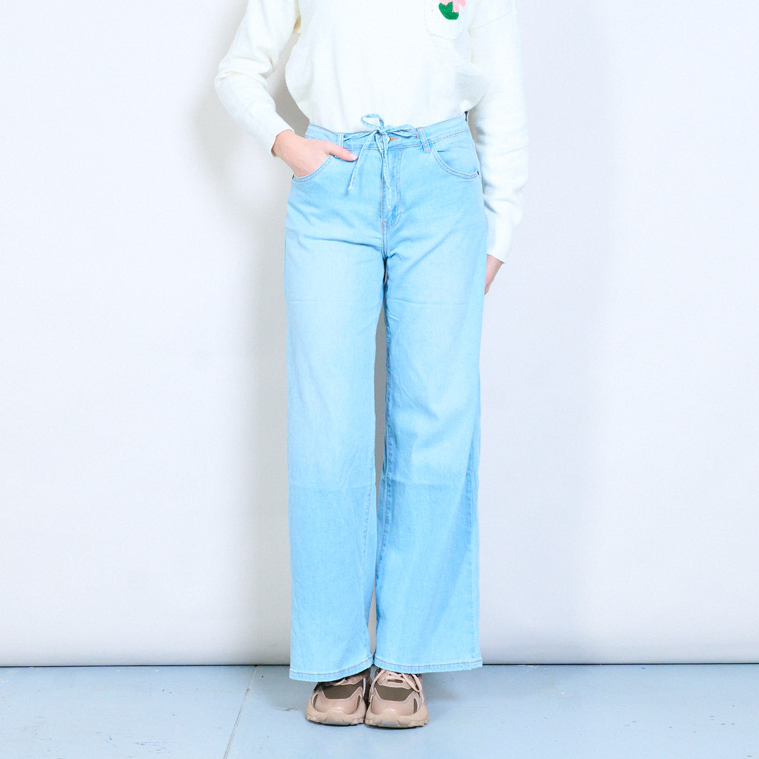 柔软抽绳腰直腿浅蓝色牛仔裤批发
