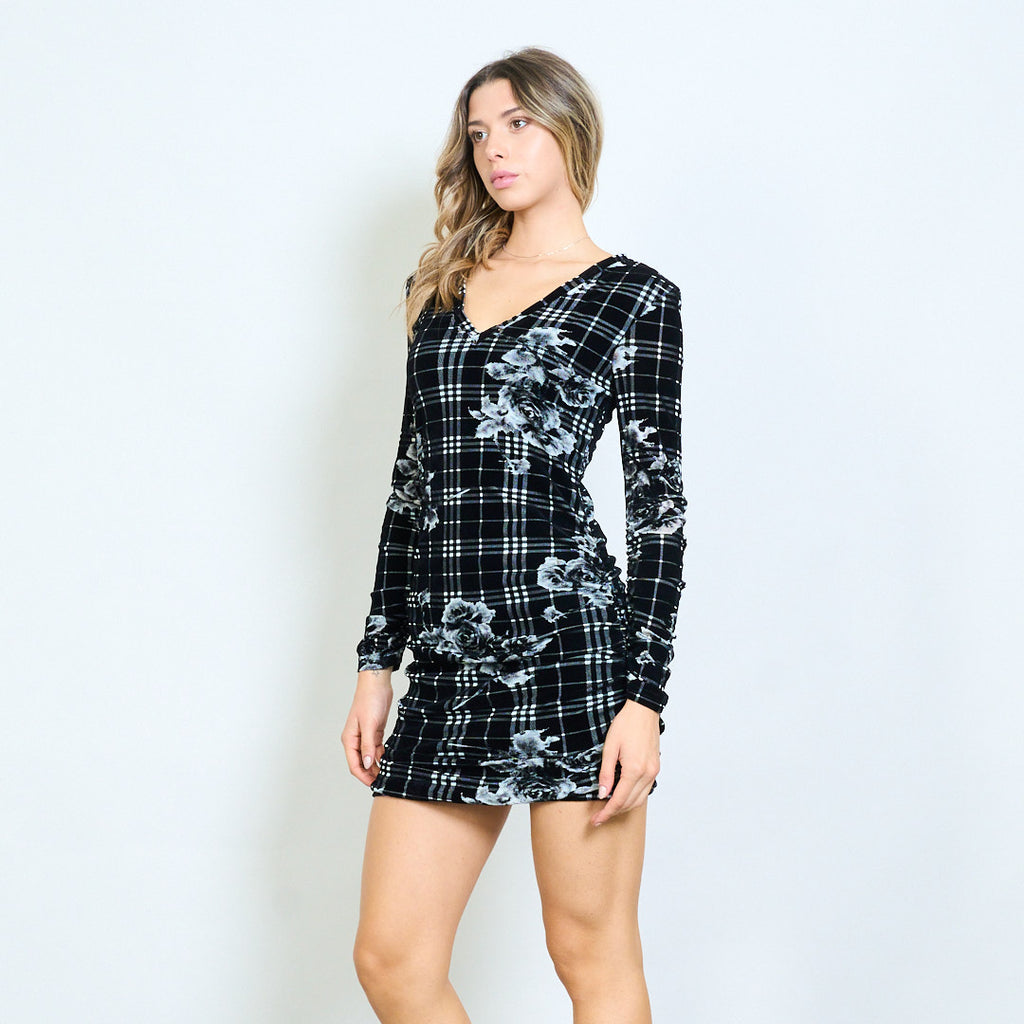 格子花卉图形印花褶皱合身连衣裙批发