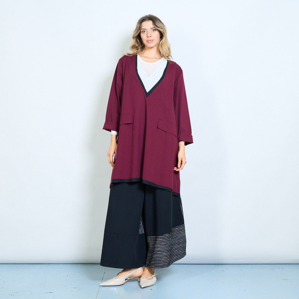 深 V 领撞色饰边长款上衣,带口袋细节批发