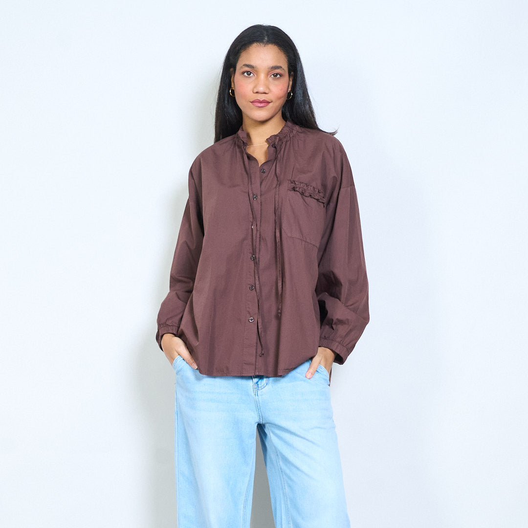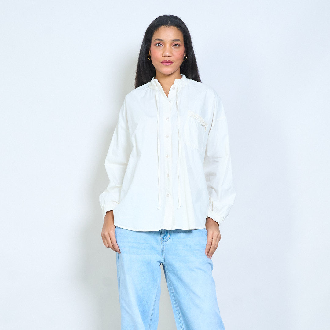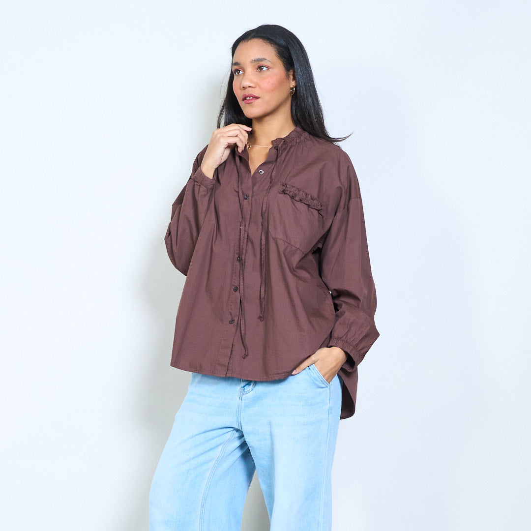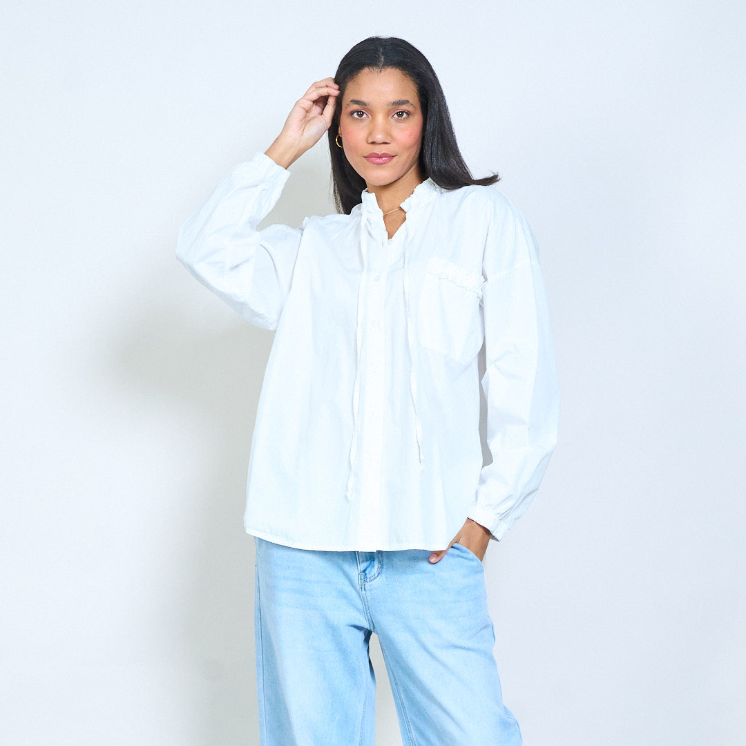 抽绳荷叶边领口纽扣前宽松衬衫批发