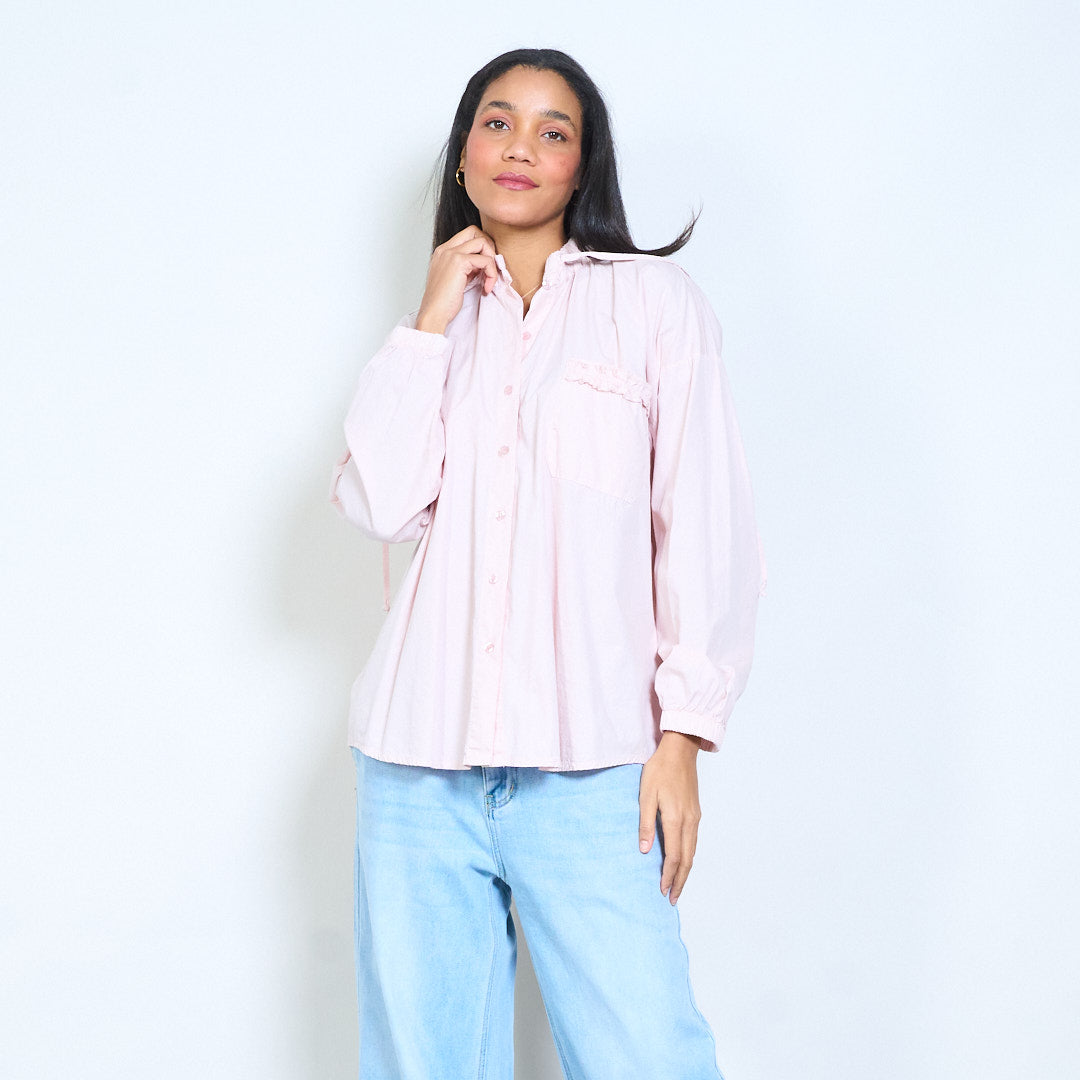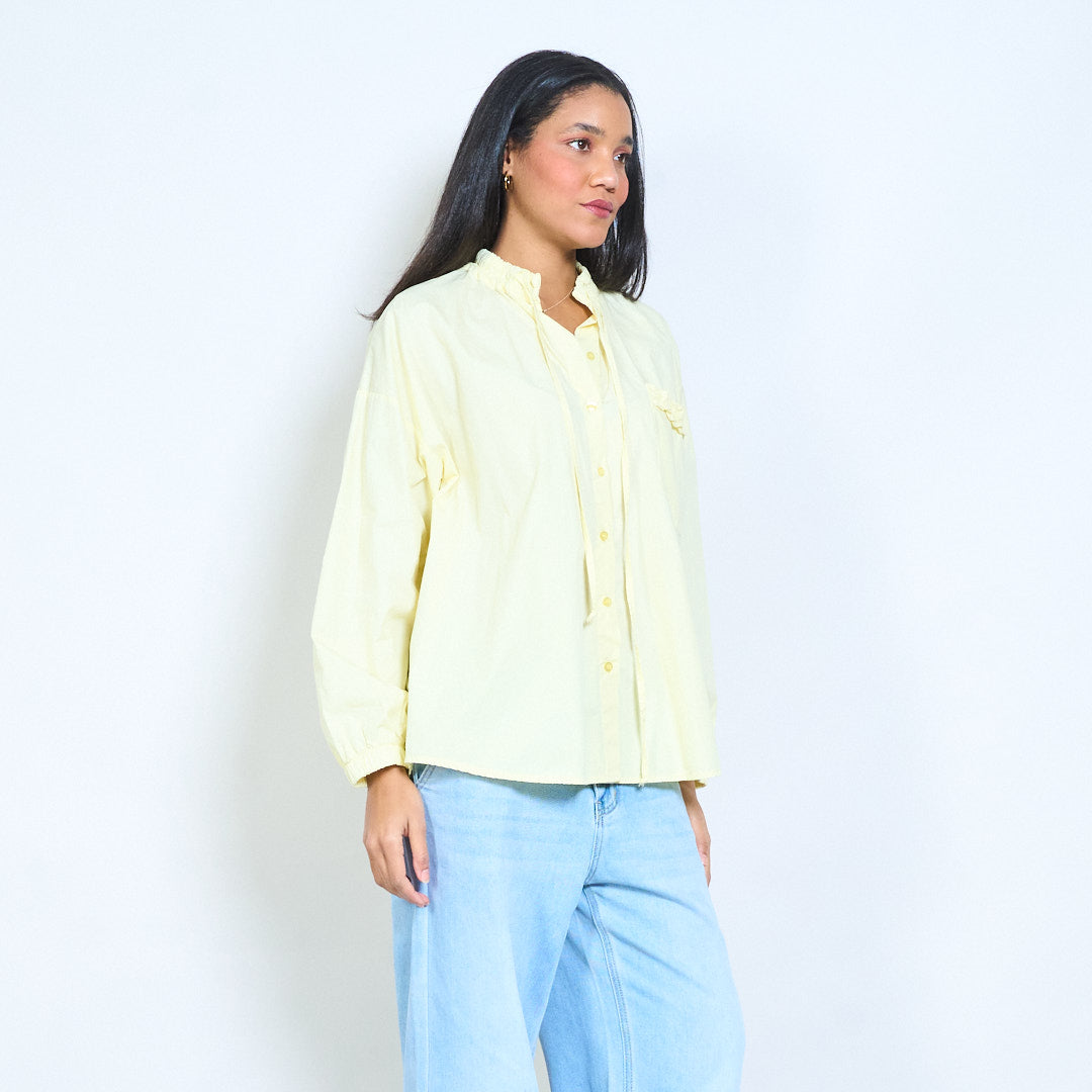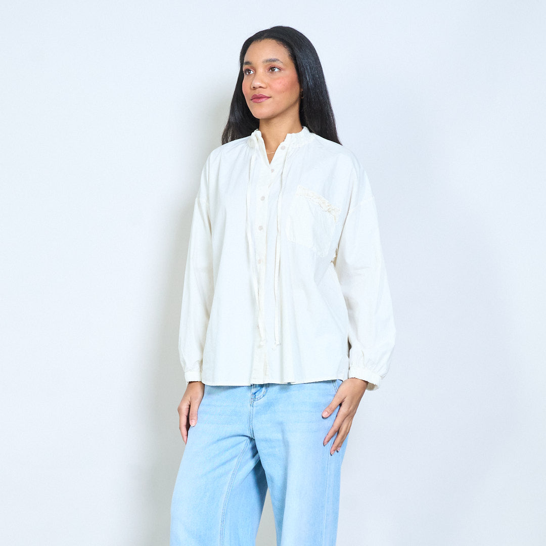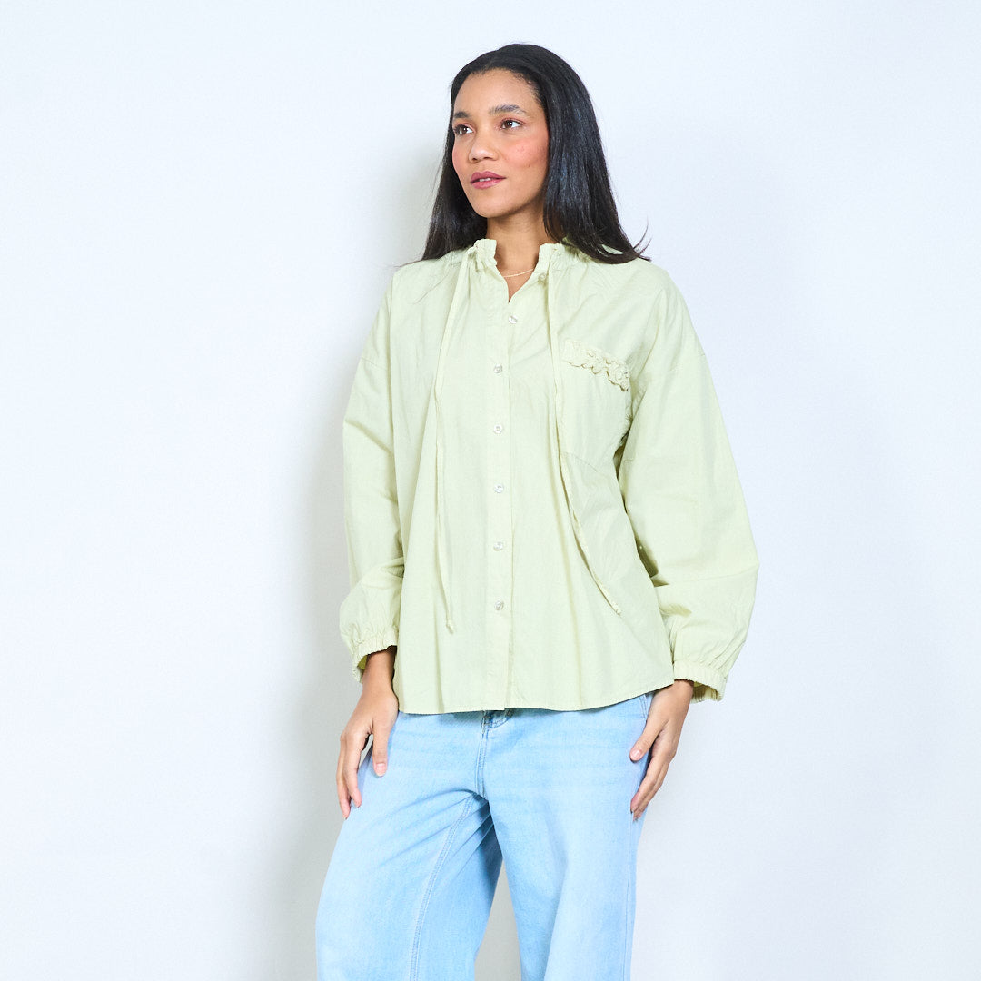 抽绳荷叶边领口纽扣前宽松衬衫批发