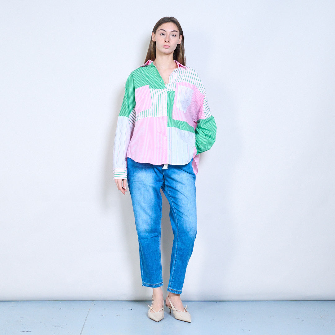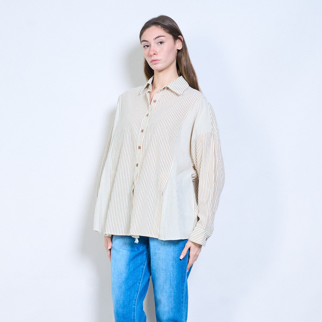 条纹宽松领口纽扣长袖衬衫批发