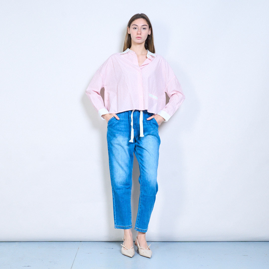 条纹水钻装饰领扣前长袖衬衫批发