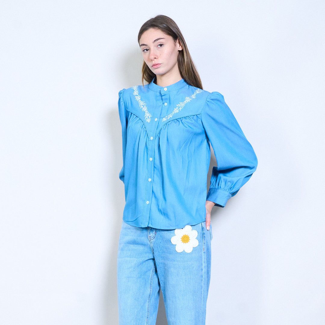 花卉刺绣泡泡袖前扣衬衫批发