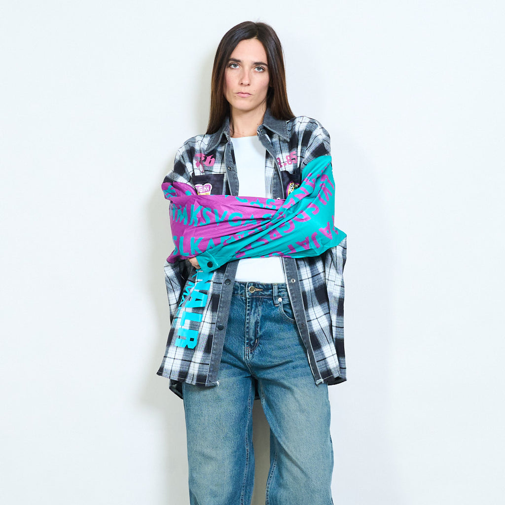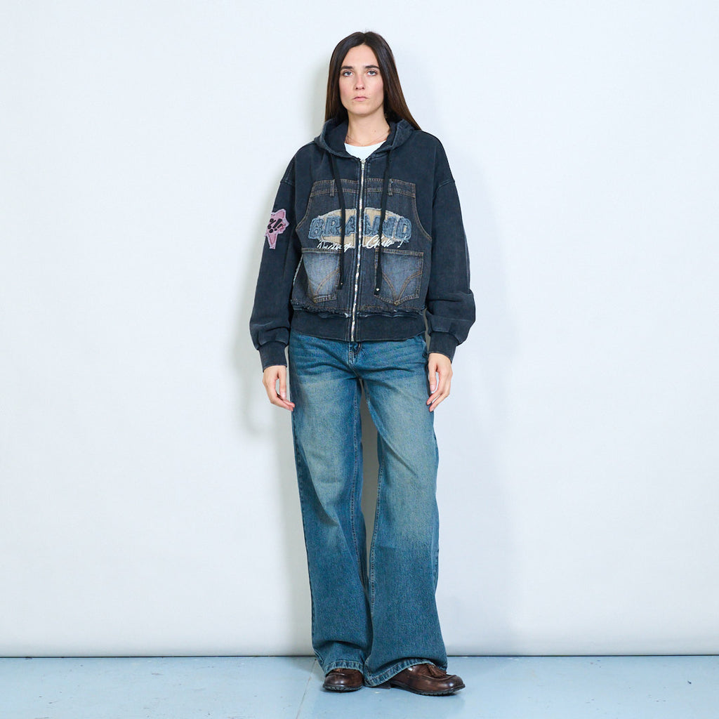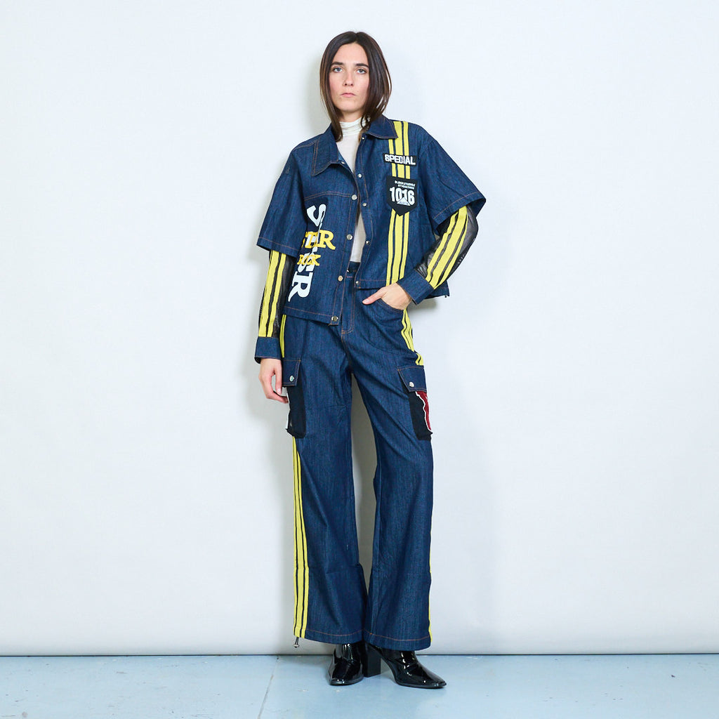 Star Rock Graphic Stripe拼布牛仔夹克和货物裤