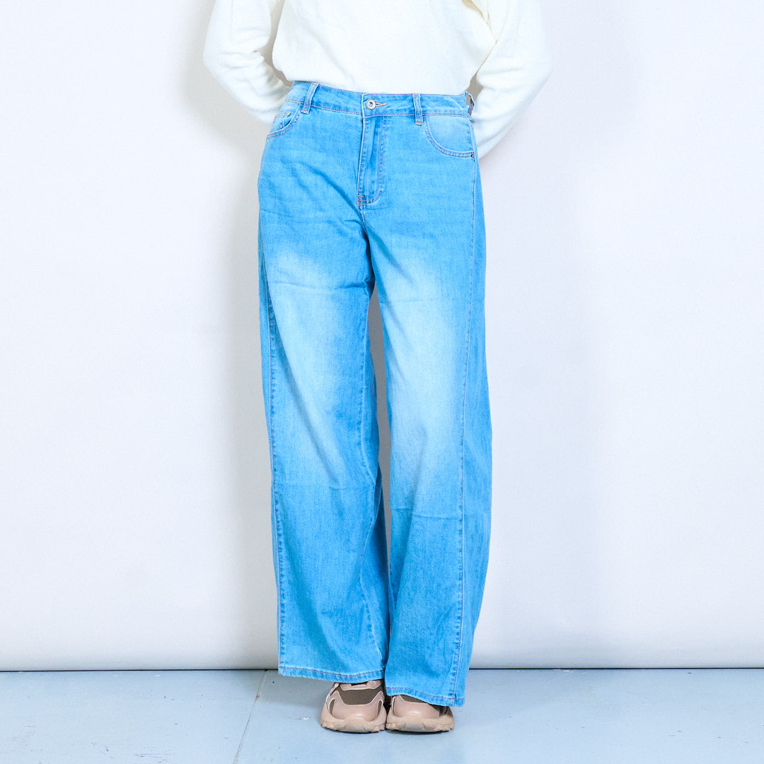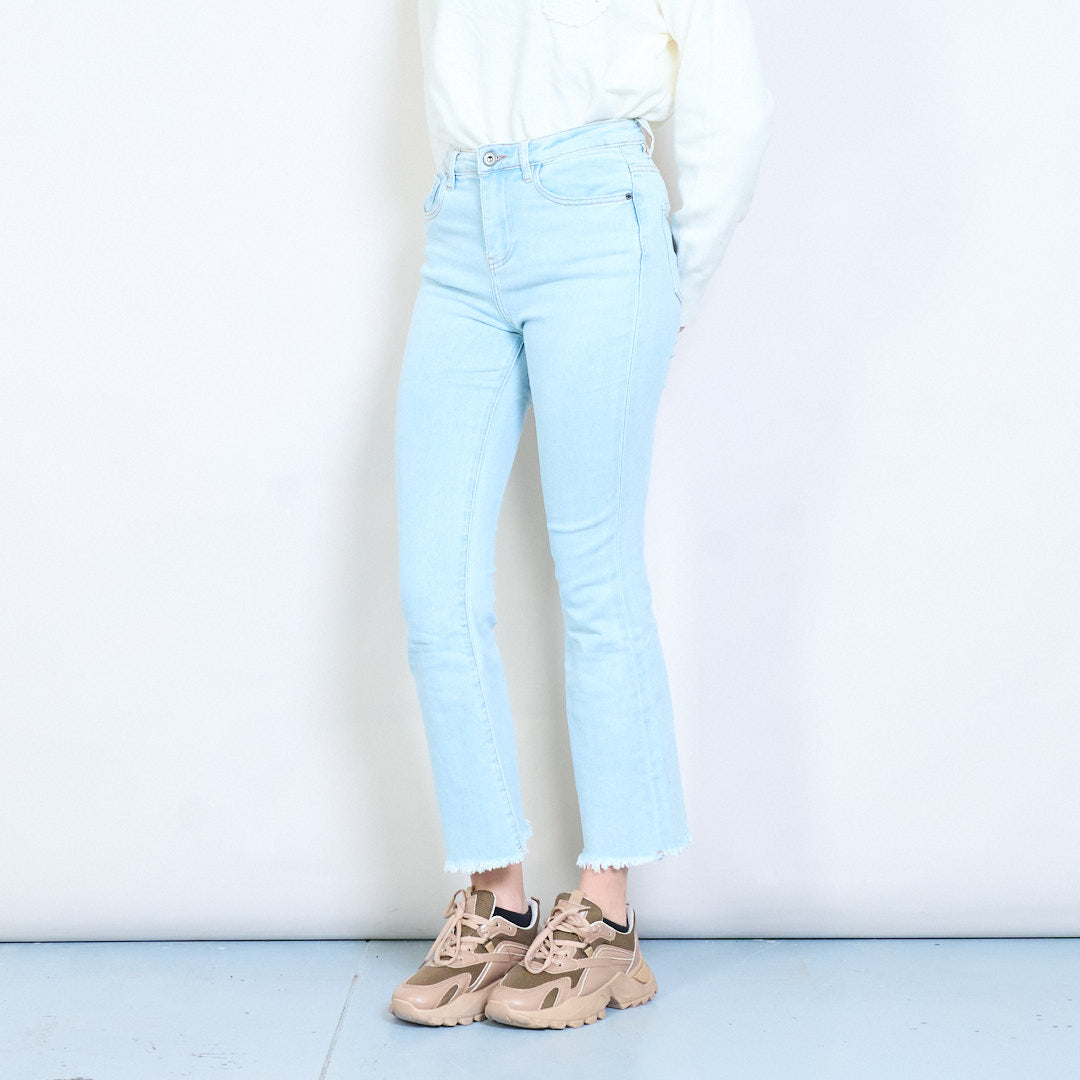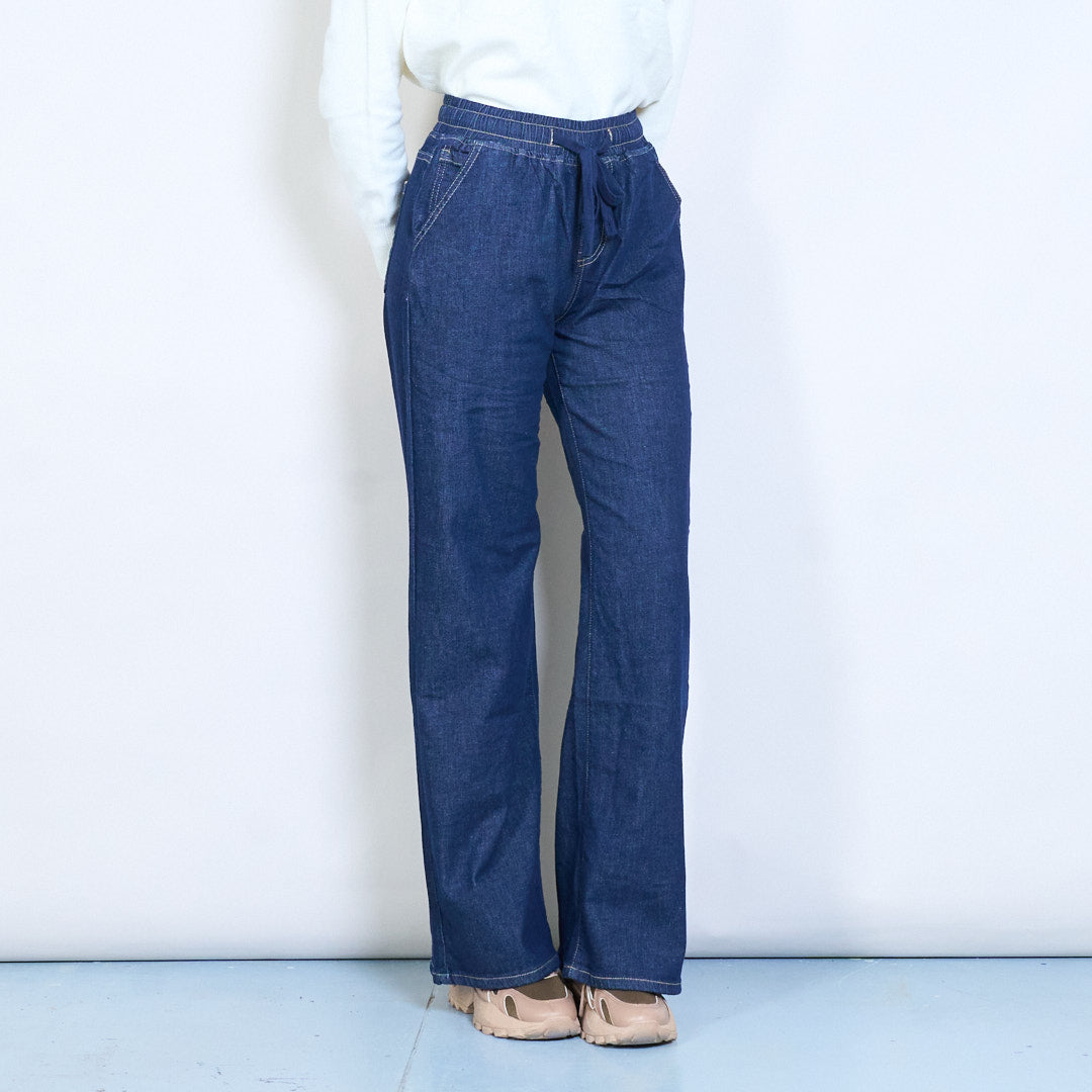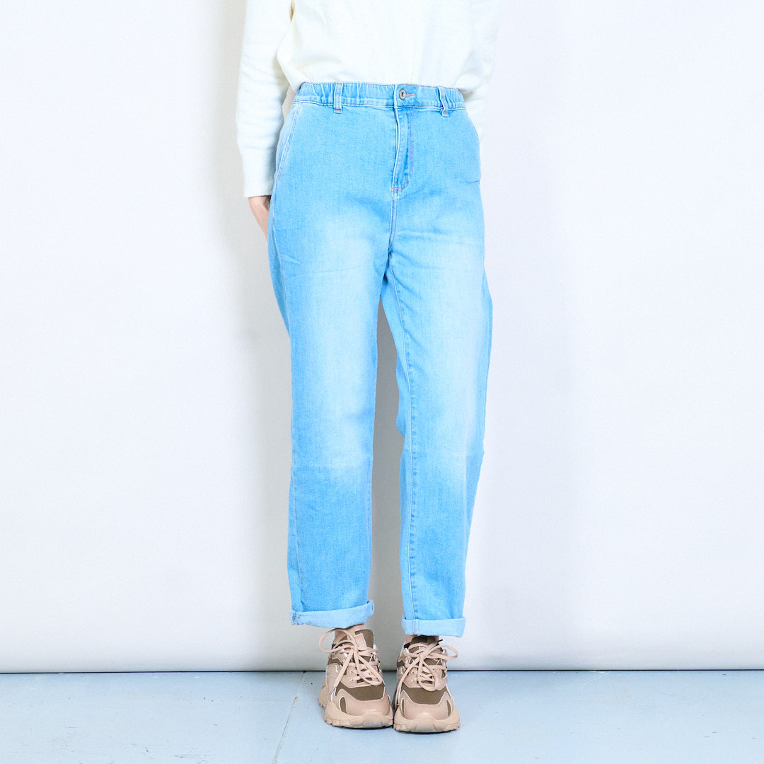 柔软抽绳腰直腿浅蓝色牛仔裤批发