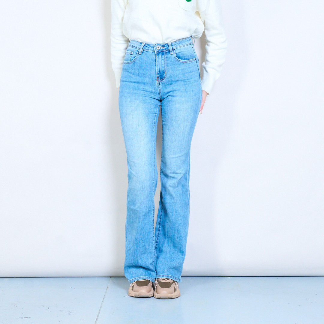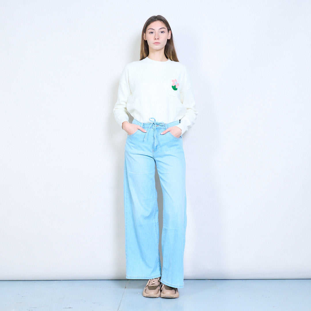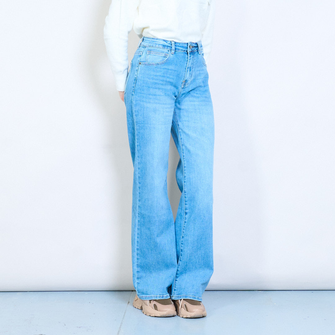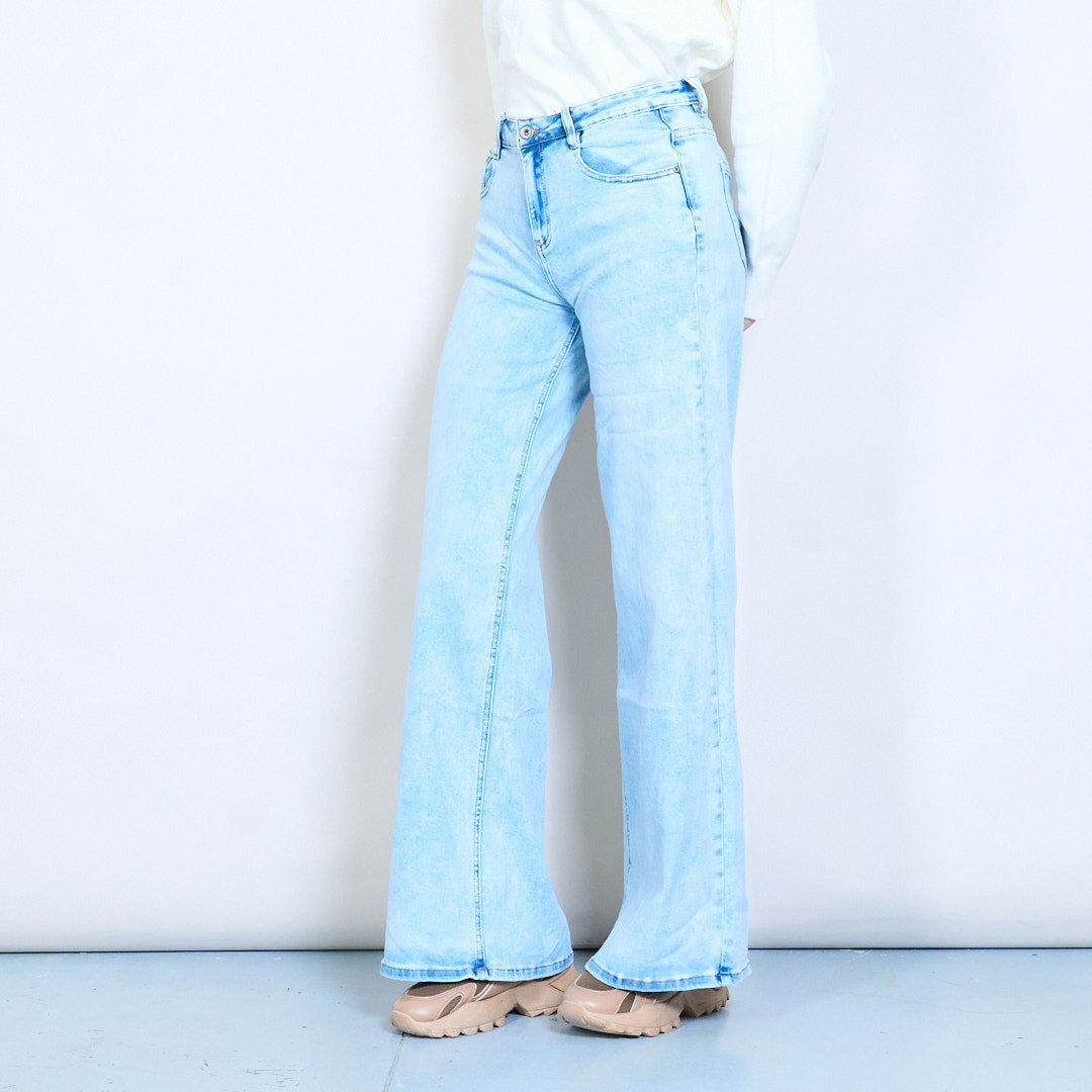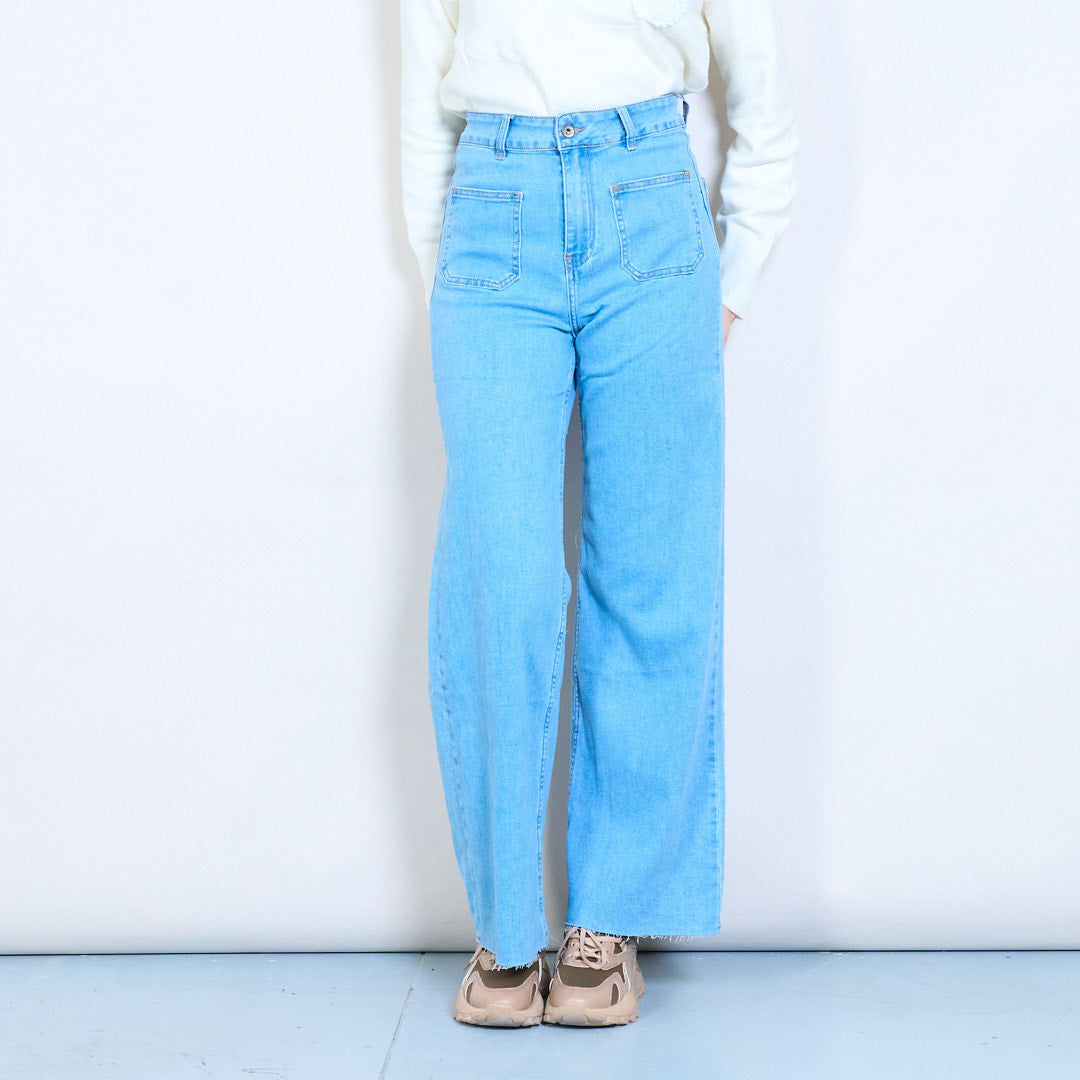 柔软抽绳腰直腿浅蓝色牛仔裤批发